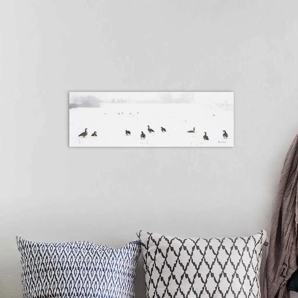 Canada Geese waiting out a snowstorm in a snowy field, Southern Ontario, Canada.