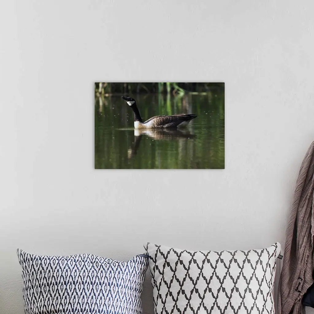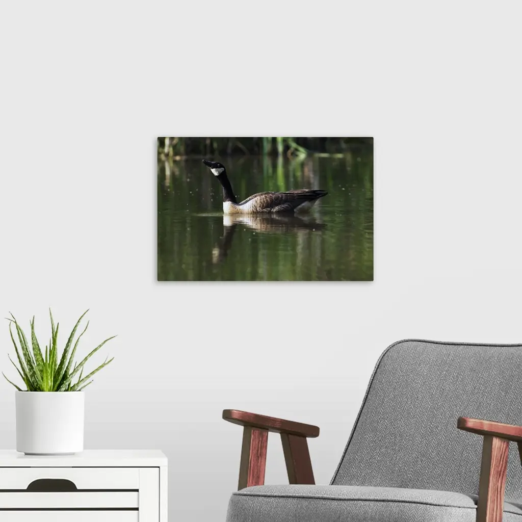 Canada goose floating in pond, water reflection. wall art for home and office decor. Discover canvas art prints, photos, mural, big canvas art and framed wall art in GreatBigCanvas.com's varied collections.