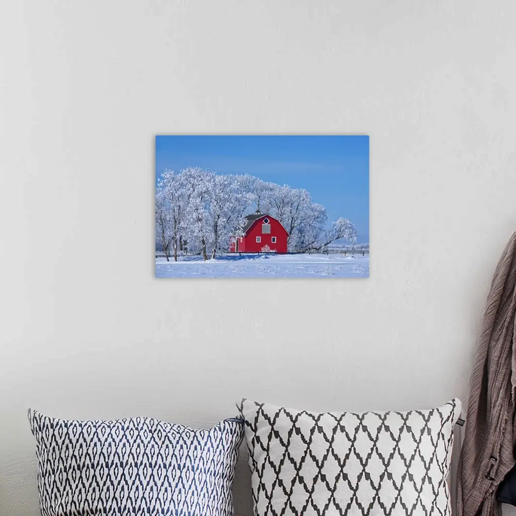Canada, Manitoba, deacon's corner. Red barn surrounded by trees covered with hoarfrost.