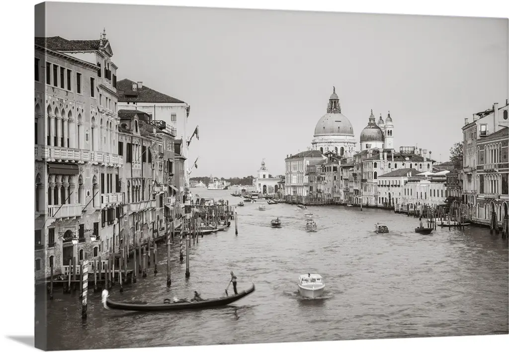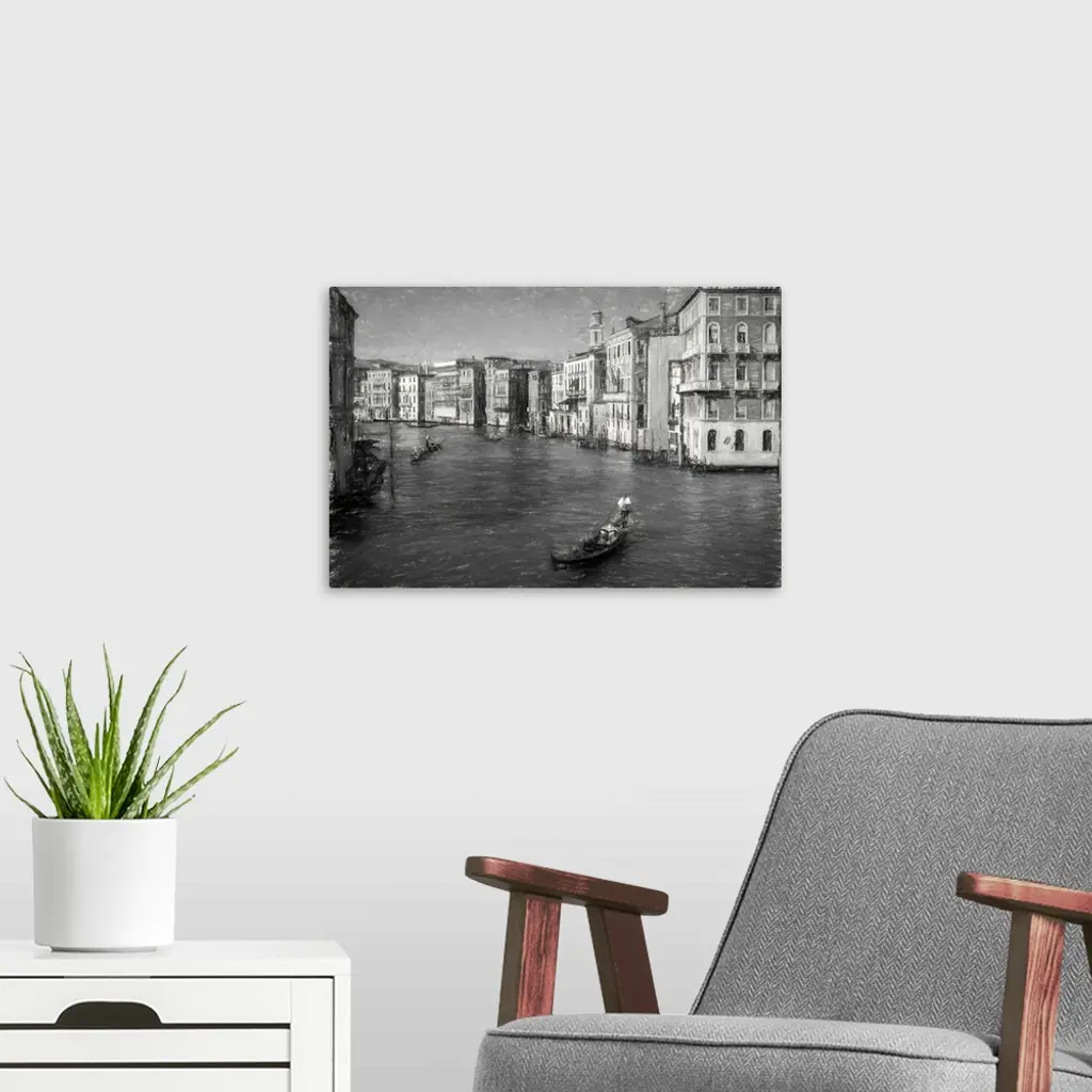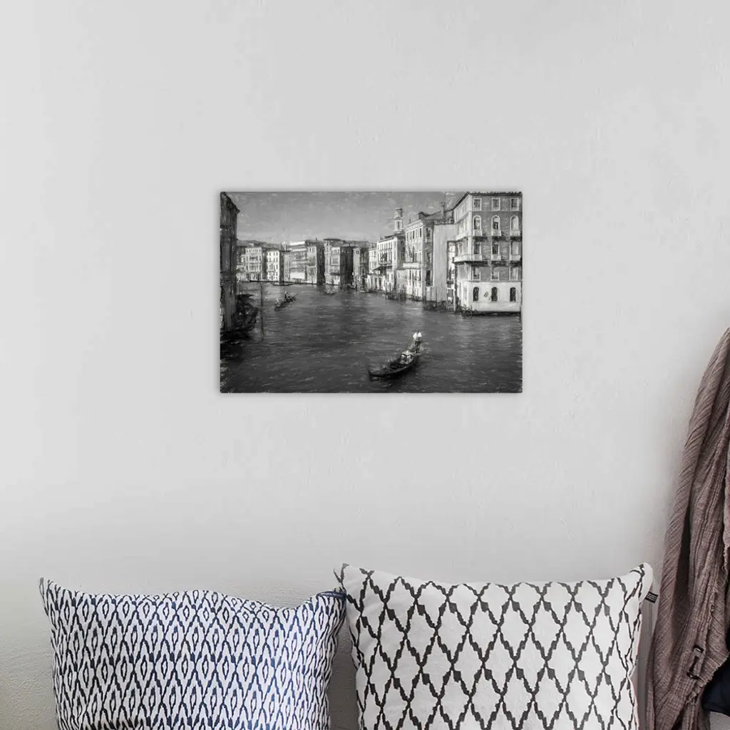 Fine art photo of a gondola in a canal in Venice, in black and white.