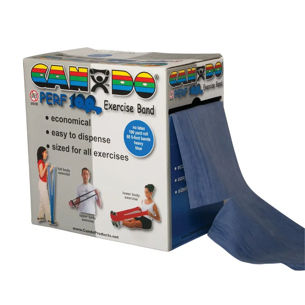 CanDo® Perf 100® latex free economic bulk size roll is the best value for large clinics. The Perf 100® economic bulk size roll is the best value for large clinics and centers. The CanDo® Perf 100™ offers a true 100 yard roll of exercise band in a convenient dispenser box. The band is perforated every 5 feet. There are 60 5-foot exercisers in each roll. To prepare exercise band for use simply pull 5 foot length from dispenser box and separate perforation line by hand. No scissors are needed!. CanDo® high quality latex free synthetic exercise band has been used for physical therapy and athletic training by clinics, fitness centers and individuals since 1987. It has become a well known staple of many physical therapy programs. The latex free formula has been specially created to mimic the stretch characteristics of latex band. CanDo® exercise band is an economic solution for upper and lower body exercise. Lightweight, compact and portable. Durable. Effective when used alone, or with handles and anchors. Color-coded according to the exercise band's resistance. CanDo® is licensed to use the Thera-Band® color sequence so resistance level is easily identified. Available in 8 levels of resistance for progressive exercise. Levels range in order of strength from least to greatest resistance: tan, yellow, red, green, blue, black, silver, gold. Uniform width - each band is 5" wide.While we aim to supply accurate product information, it is sourced by manufacturers, suppliers and marketplace sellers, and has not been provided by Overstock.