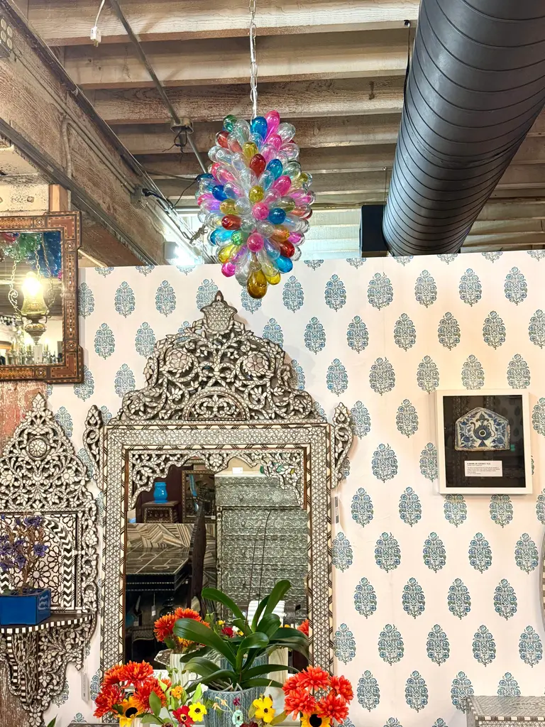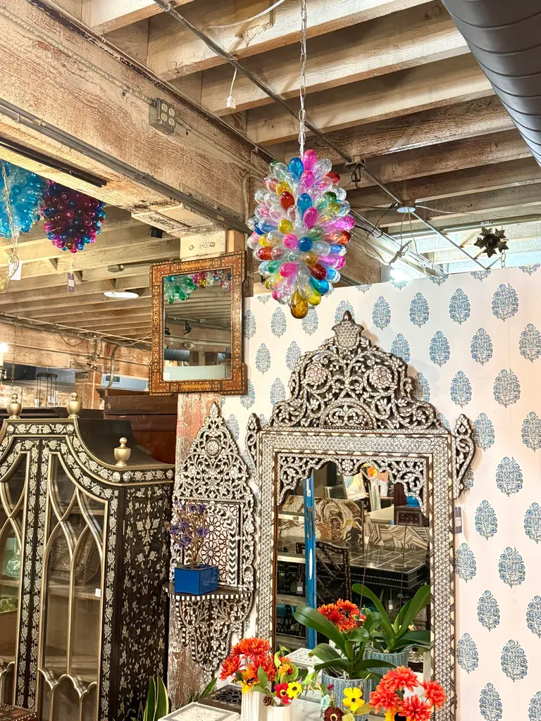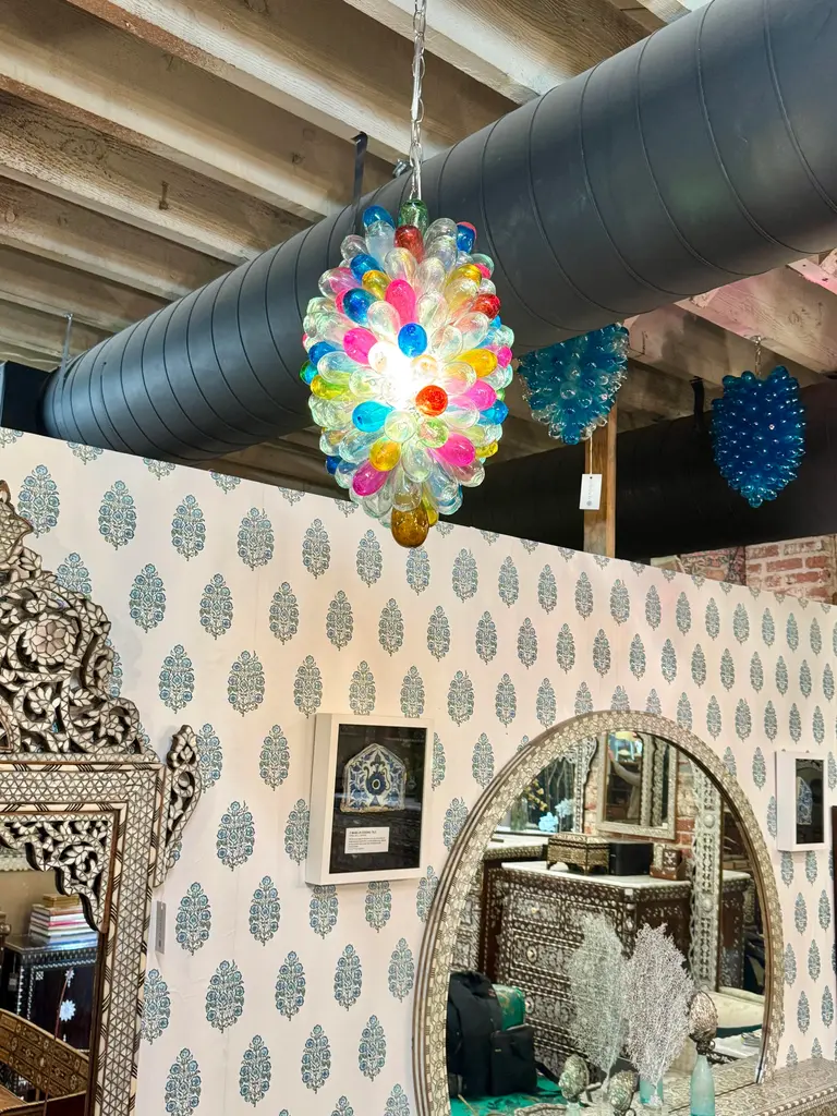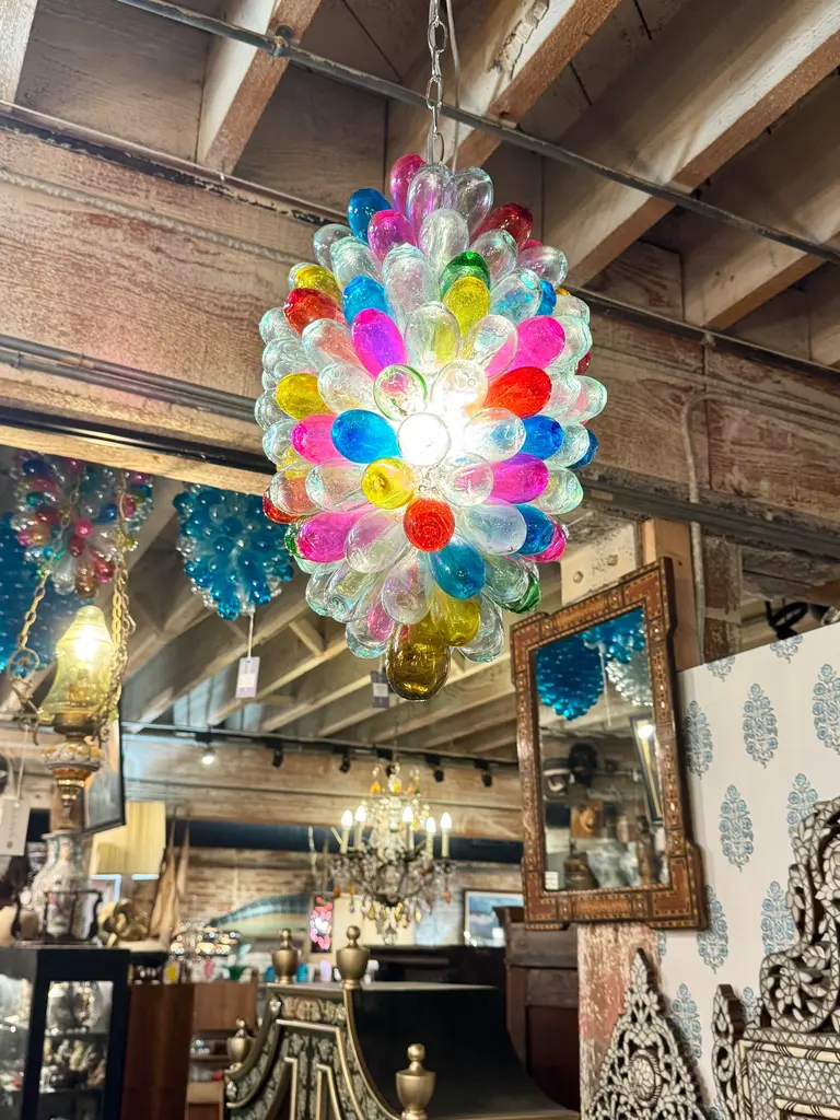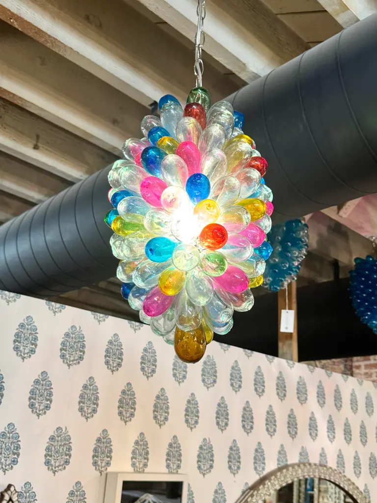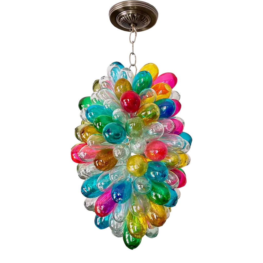 This fun colorful sculptural light fixture is composed of individual handblown balloon shaped pieces, individually attached to a metal frame. The glass pieces come in stained multicolors mixed in random way, creating an colorful effect, giving a space one of a kind pizzazz. 6 mixed color: Clear white, brown, green, turquoise, pink and yellow, All colors are soft and you can see through. Chain and wired 60W light bulb is included, Canopy is not included in the fixture.