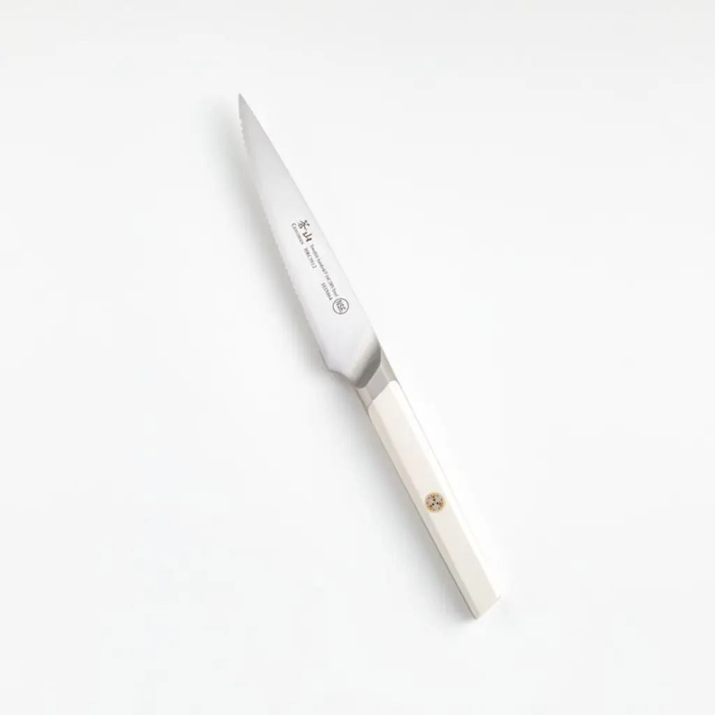 High-alloy Swedish steel takes and holds a precise edge for a paring knife that maintains impressive sharpness even with daily use. The forged, full-tang blade goes through a six-stage heat treatment that creates stable structure, consistent hardness and exceptional sharpness. Designed to perform detailed cutting tasks, this International Red Dot design award-winning knife offers a white ergonomic handle finished with a striking single mosaic rivet for a fresh look. Need help choosing? Here's your essential guide to choosing the best knife