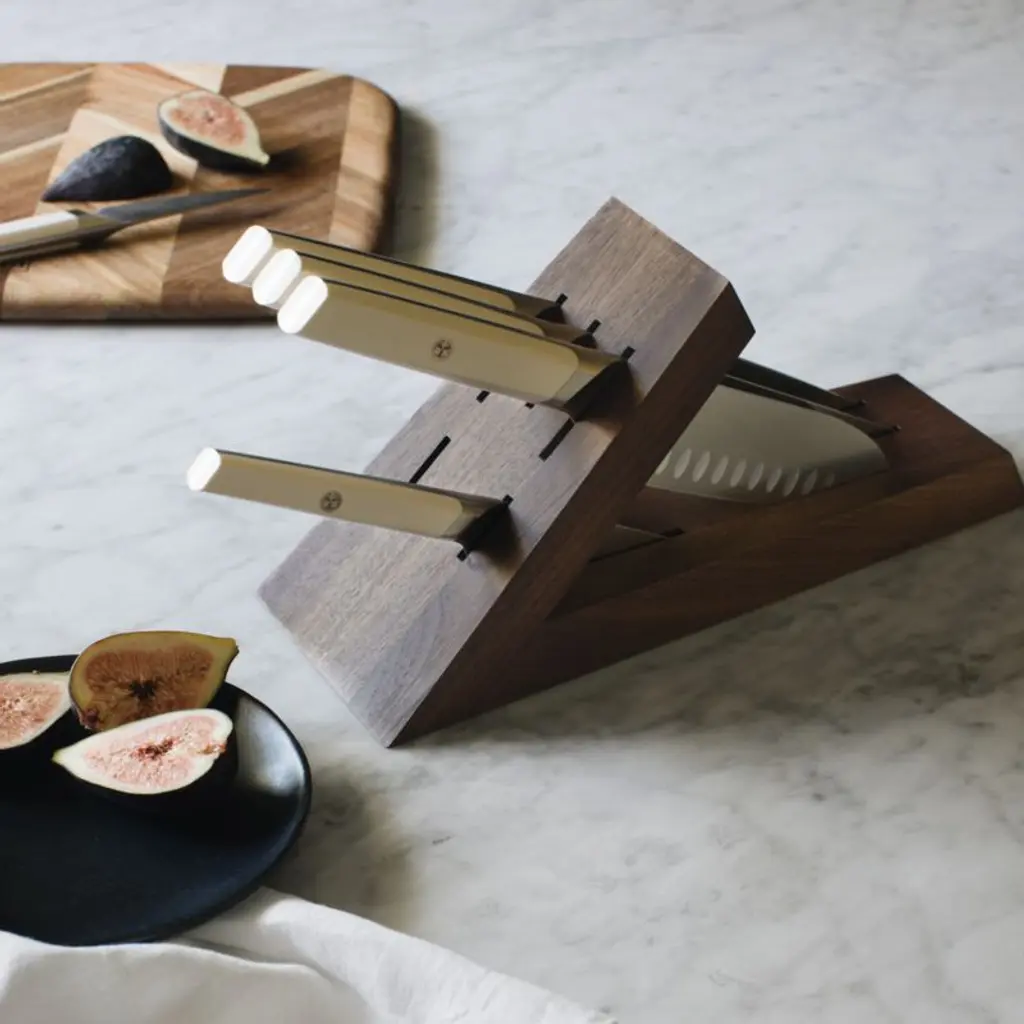 High-alloy Swedish steel takes and holds a precise edge for a set of knives that maintain their impressive sharpness even with daily use. The forged, full-tang blades go through a six-stage heat treatment that creates stable structure, consistent hardness and exceptional sharpness. Designed to perform a variety of everyday cutting tasks, the five knives offer comfortable, ergonomic handles in white finished with a delicately beautiful single mosaic rivet for a fresh look. Perfect for a housewarming, wedding or graduation gift, this International Red Dot design award-winning set includes an 8" chef's knife, 8" bread knife, 7" santoku knife, 5" utility knife and 3½" paring knife in a five-slot, triangular walnut block. Need help choosing? Here's your essential guide to choosing the best knife