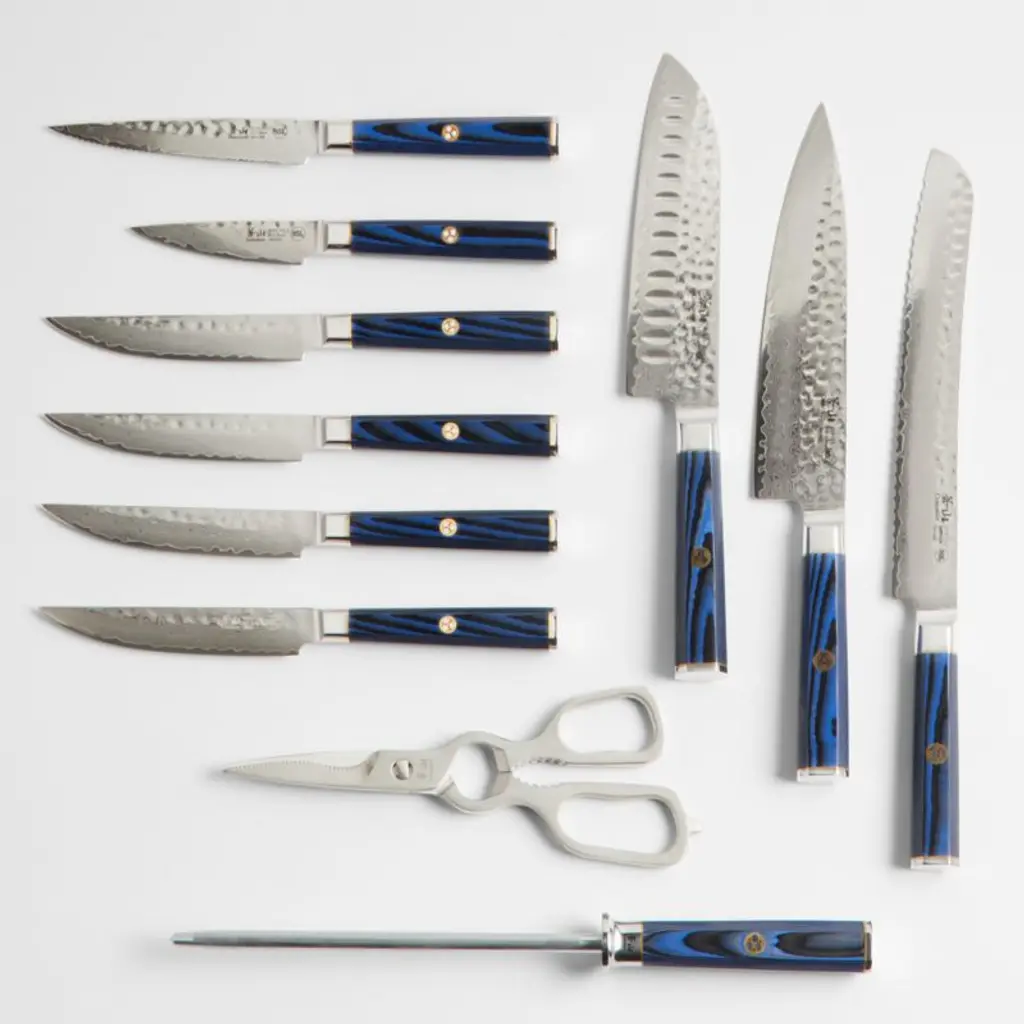 A display-worthy knife set almost too stunning to use. Hand-sharpened by highly skilled artisans, the full-tang X-7 steel blades ripple with a beautifully hammered surface that encourages sliced foods to slide right off. Faux wood grain in blue and black streaks the lightweight and durable octagonal handles, each secured with a single mosaic rivet as a luxurious finishing touch. The set includes 9-inch bread knife, 8-inch chef knife, 7-inch santoku knife, 5-inch serrated utility, 3.5-inch paring knife, four 5-inch straight-edge steak knives, 9-inch honing steel and 9-inch forged come-apart kitchen shears. Housed in a dynamic maple wood and stainless steel block, the exceptionally sharp 12-piece knife set makes a sensational wedding, graduation or housewarming gift. Need help choosing? Here's your essential guide to choosing the best knife