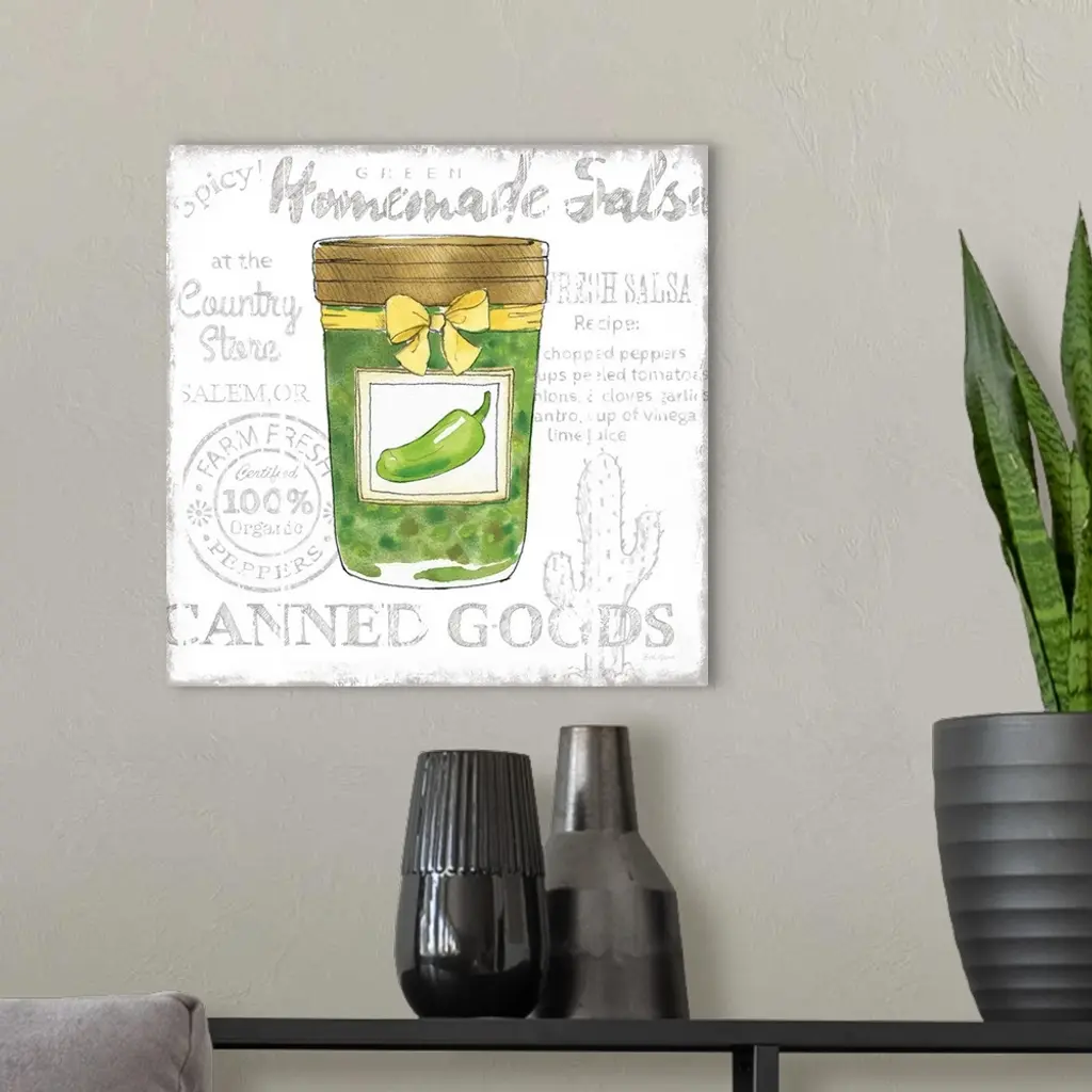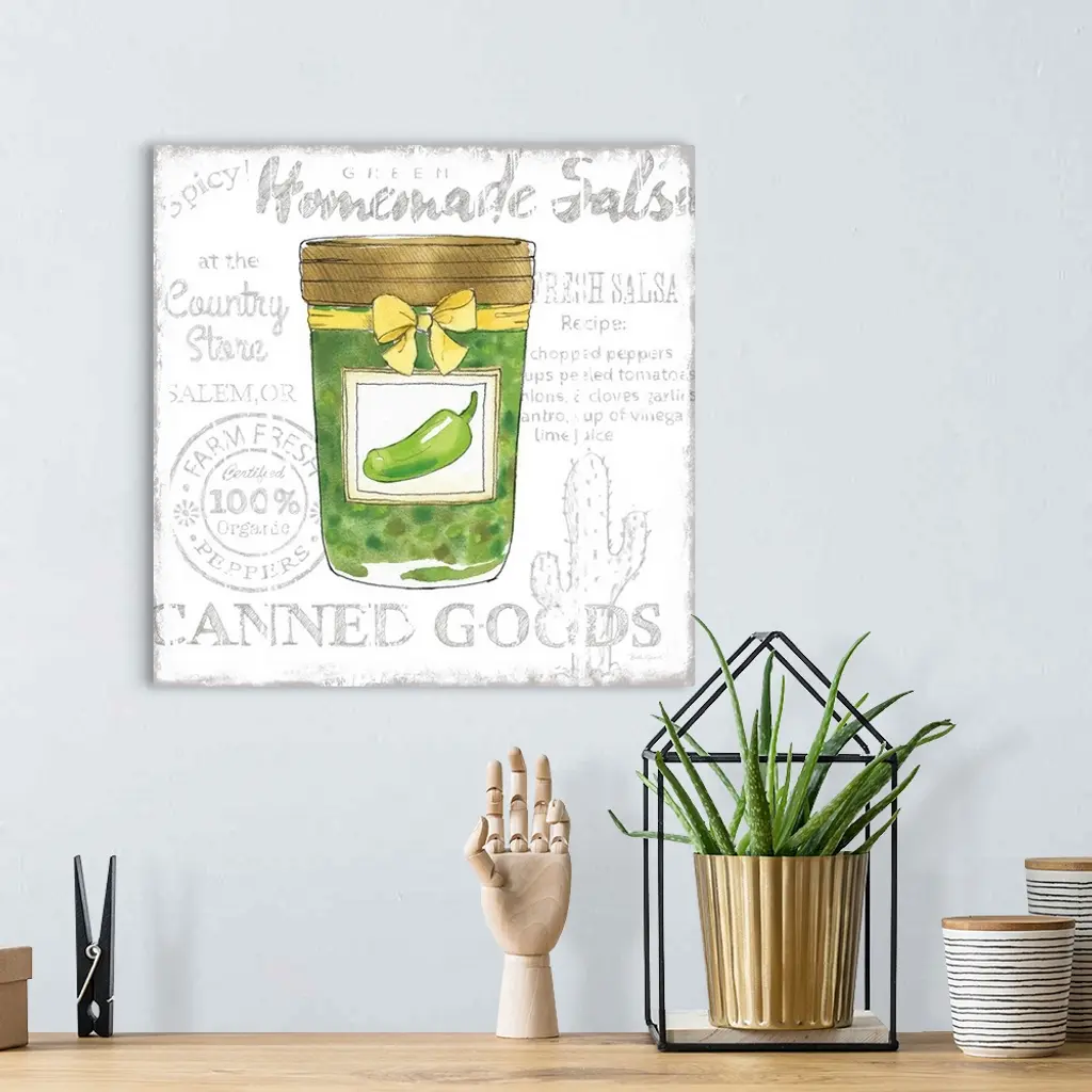 Square kitchen decor with a watercolor illustration of a jar of salsa verde and black typography in the background.