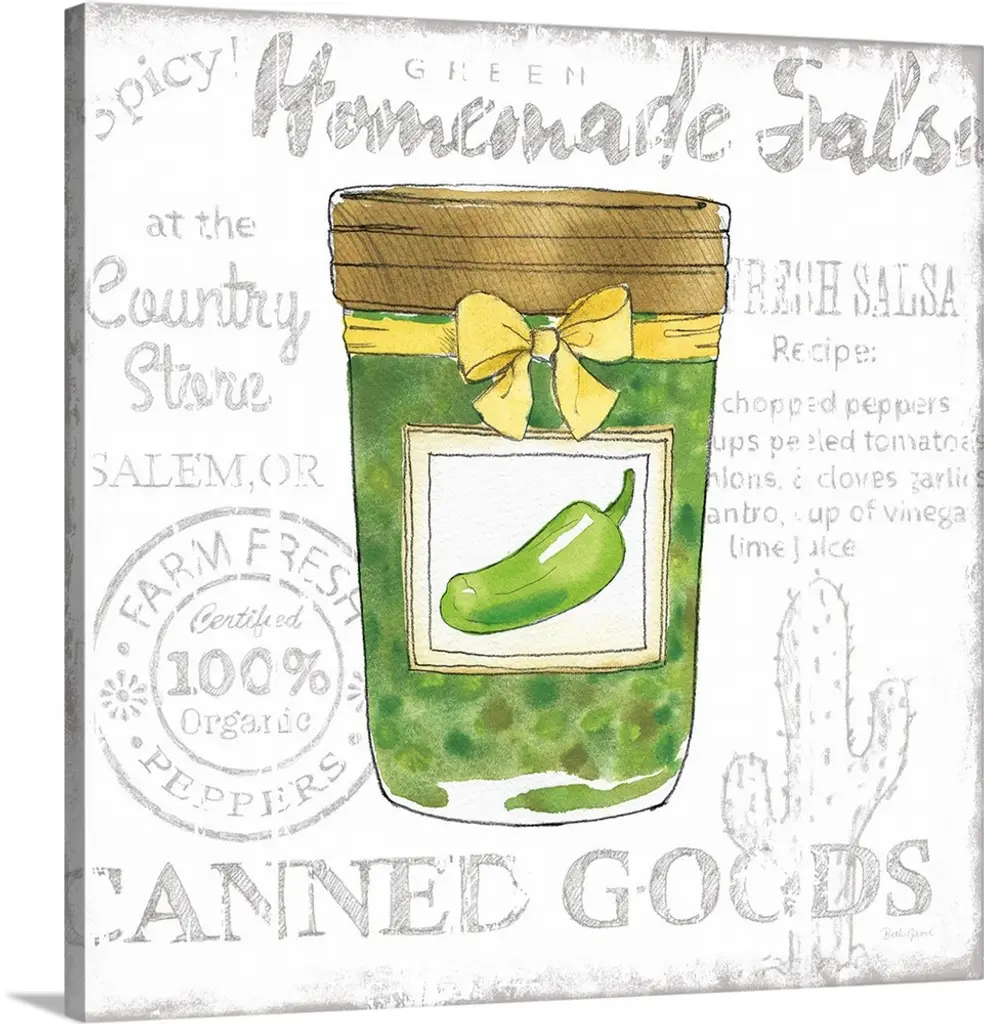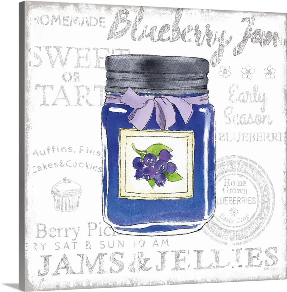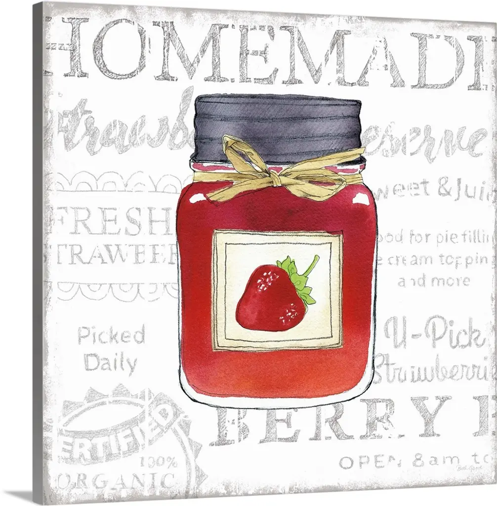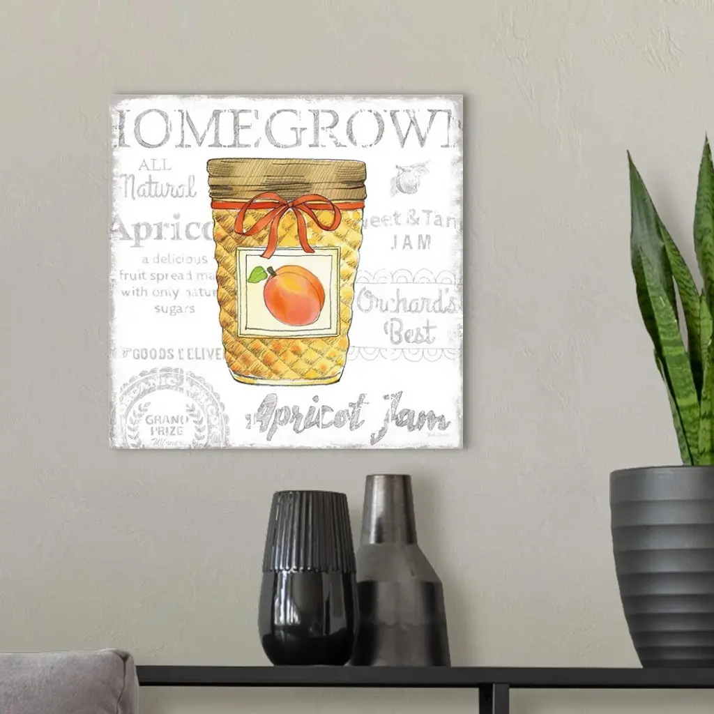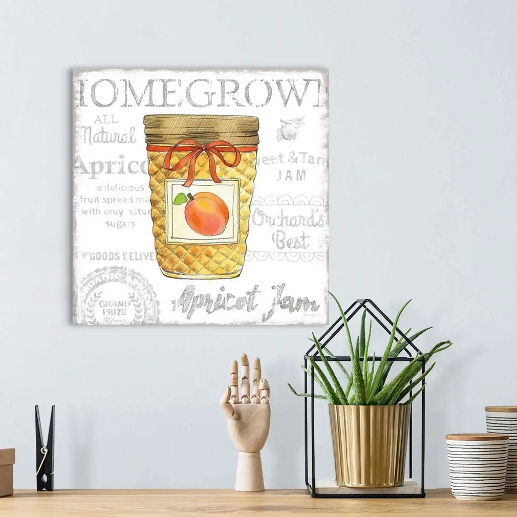 Square kitchen decor with a watercolor illustration of a jar of apricot jam and black typography in the background.