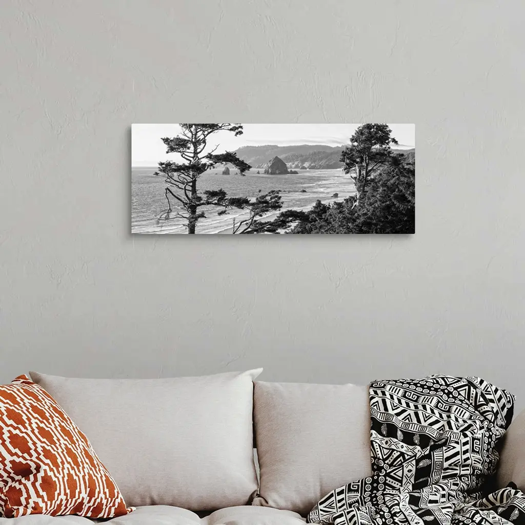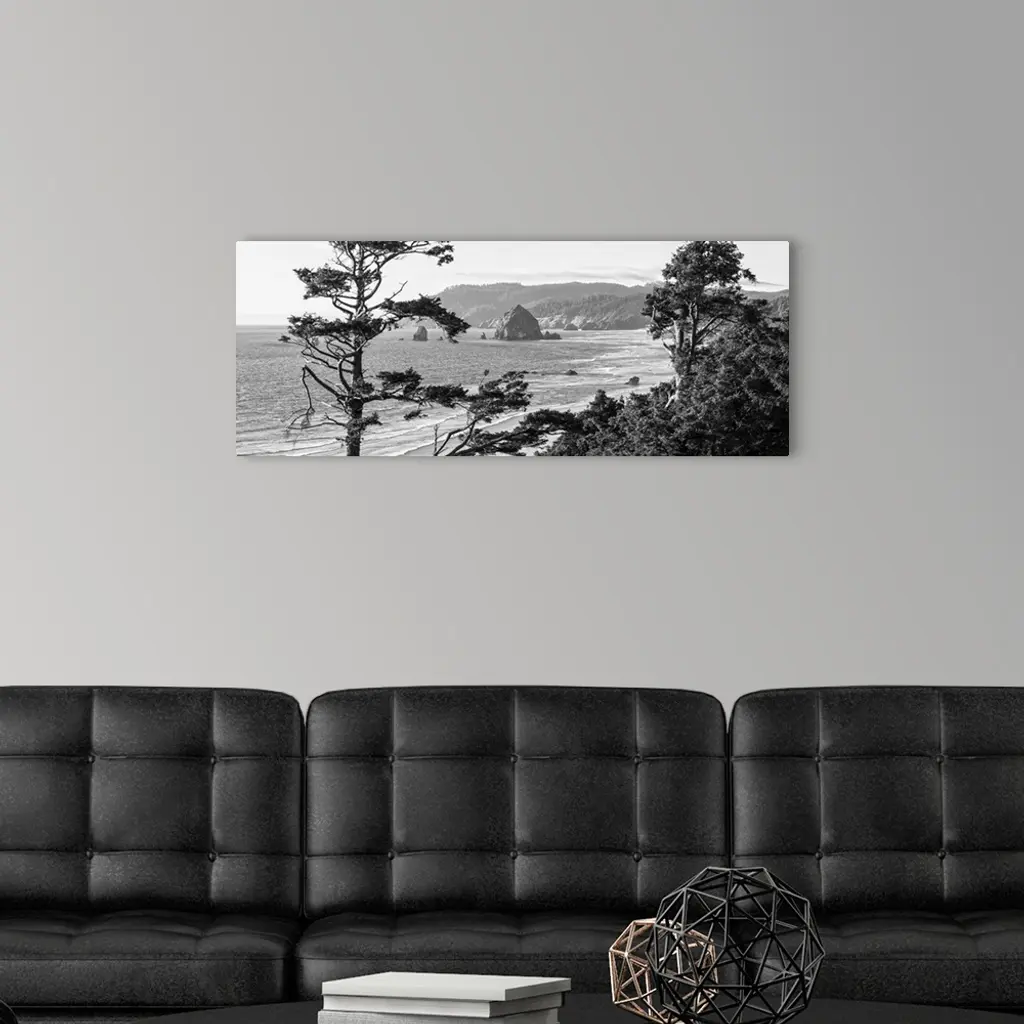 Black and white panoramic landscape photograph of Cannon Beach through the trees with Haystack Rock in the distance, Oregon Coast