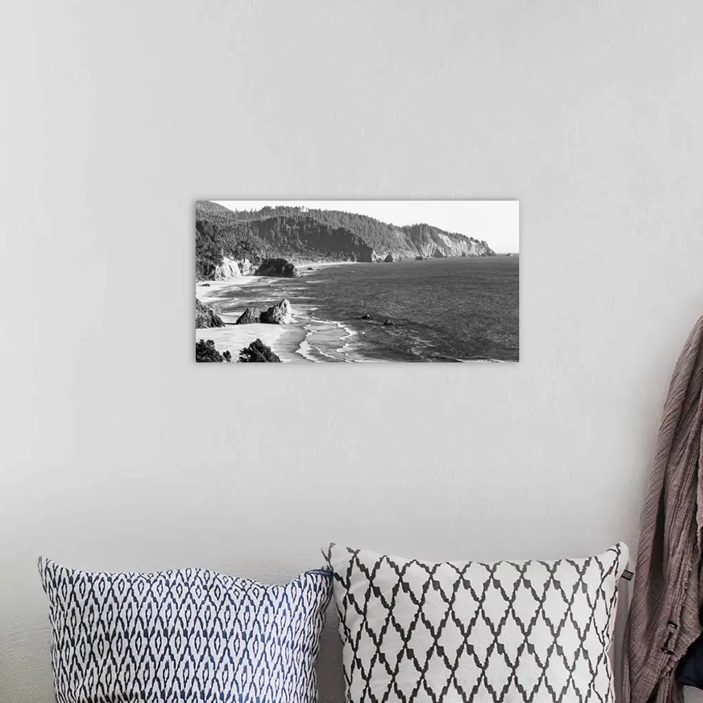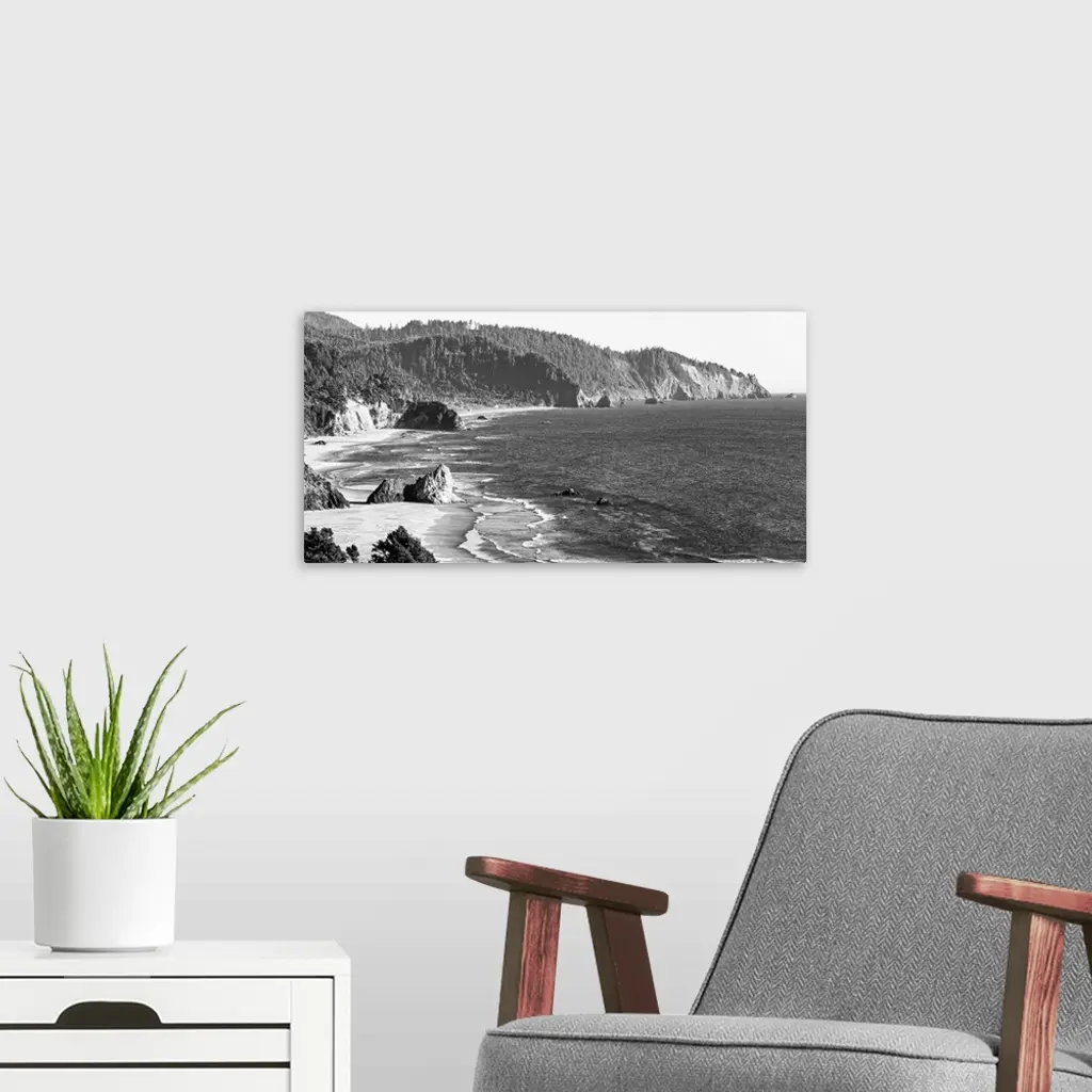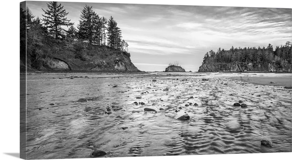 Black and white landscape photograph of the Cannon Beach shore in Oregon.