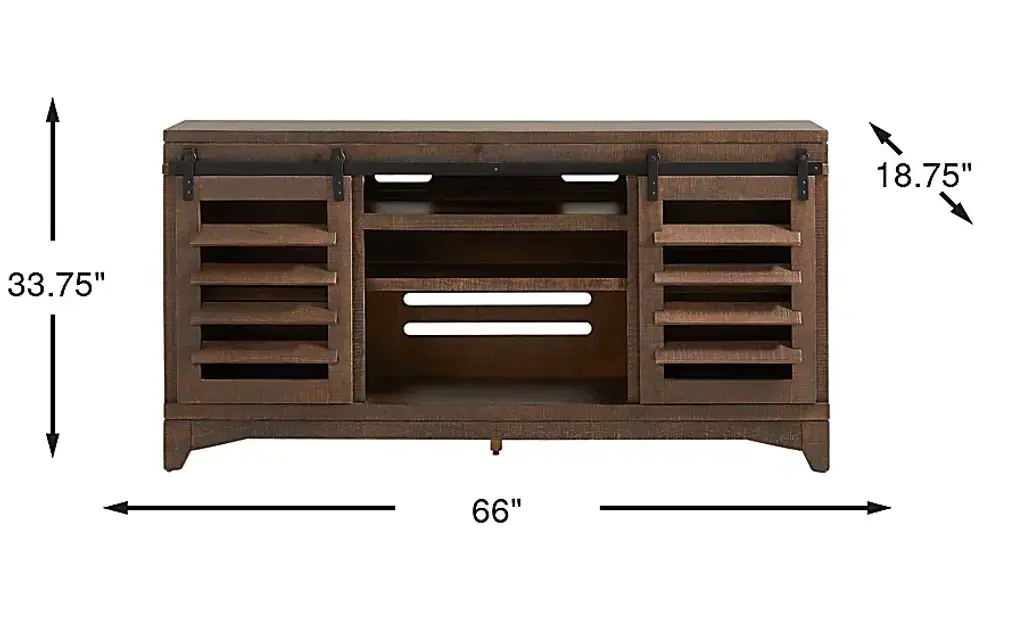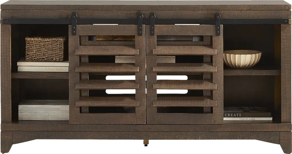 Like a cozy family library evoking thoughtful, inviting and welcoming warmth, the Canoe Creek collection's charming details and clever storage marries form and function with style. This transitional console comes in a rich brown finish and a handsome rectangular frame that delivers a timeless, grounded look. A sleek black metal rail lines the top to guide two slatted doors to the center, revealing spacious shelving for your entertainment essentials, while the central cubby and open shelves provide wire management cutouts for a clean, clutter-free setup.