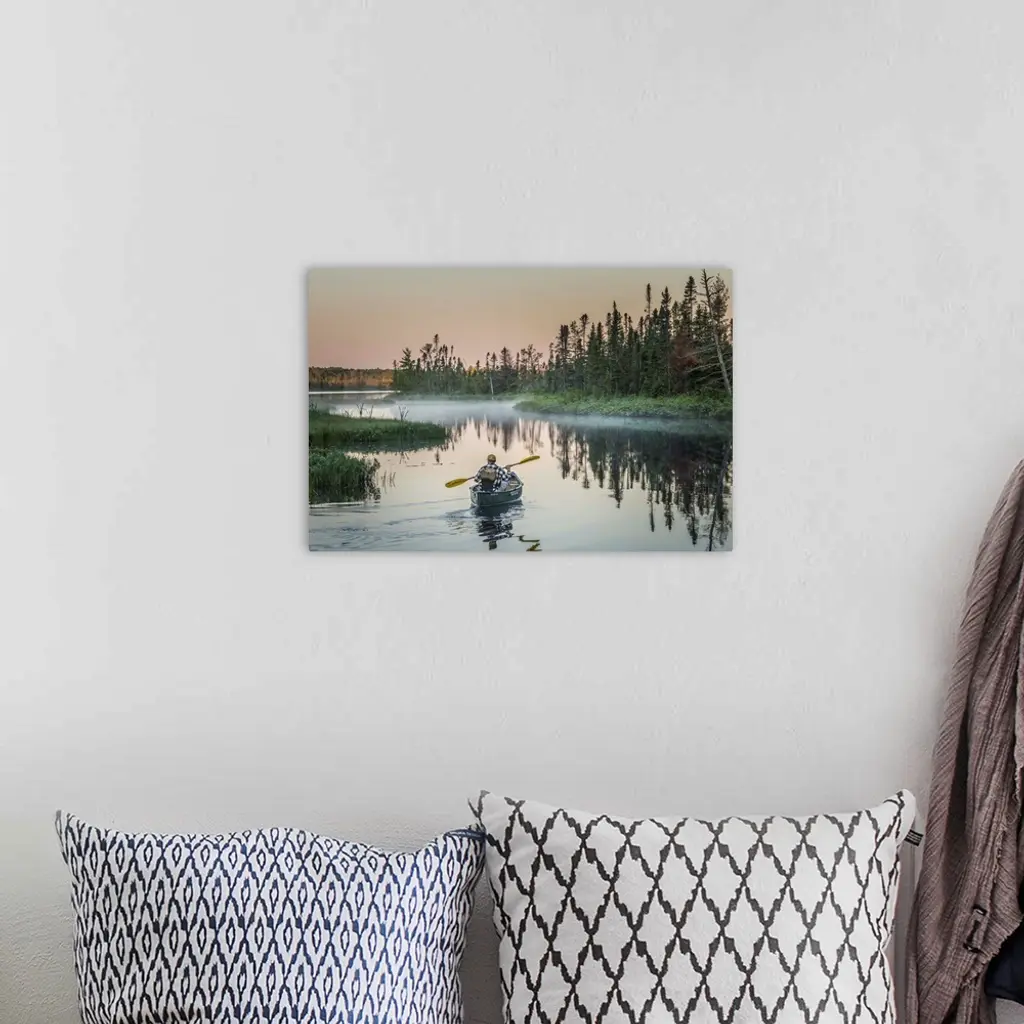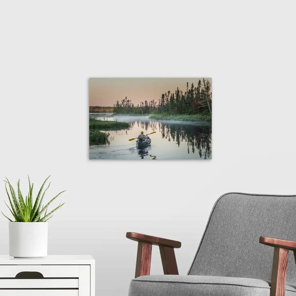 A canoeist paddling in quiet waters in the morning on Madeline Island, Wisconsin.