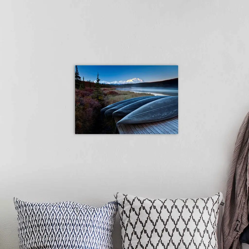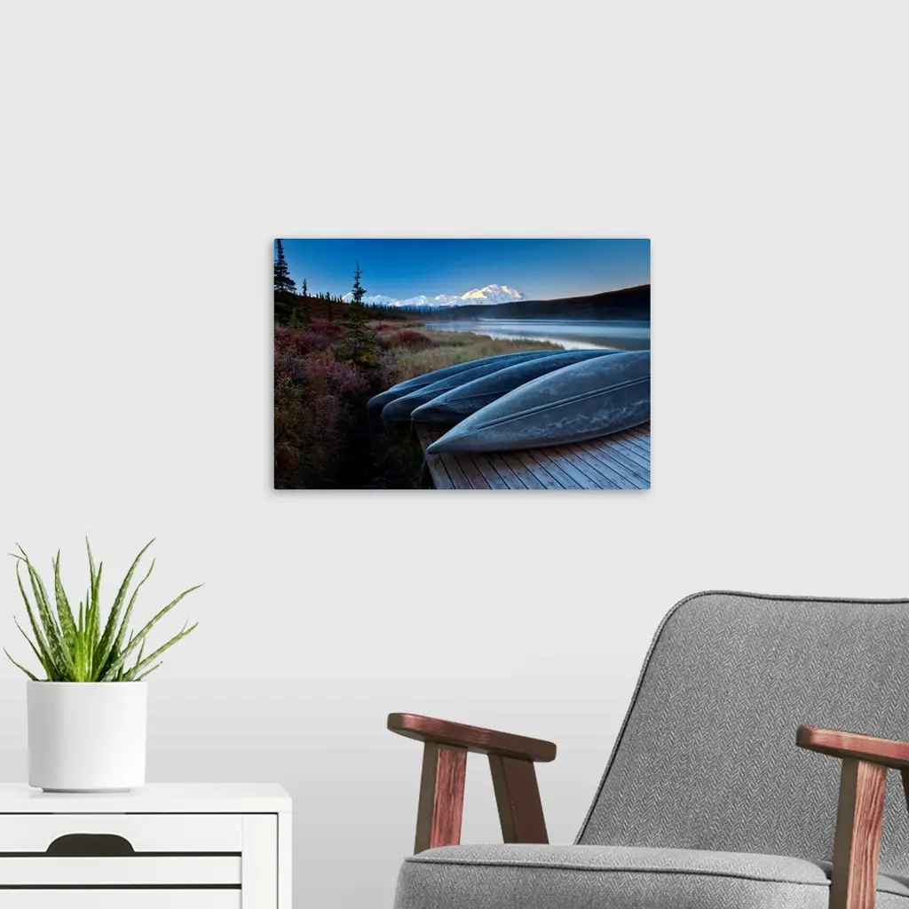 Canoes lined up on a dock at Wonder Lake in front of Mt. McKinley.