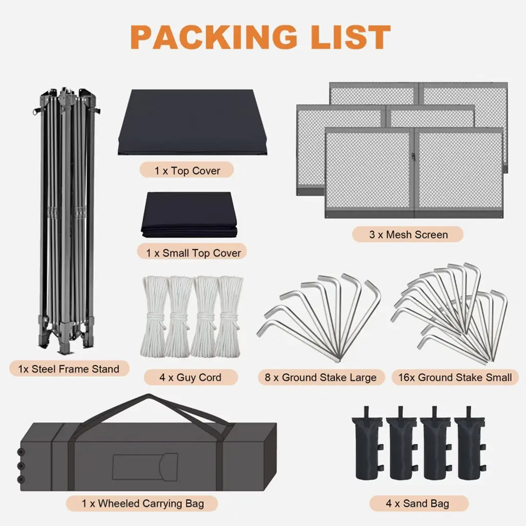UPGRADE FABRIC - The fabric is designed to professionally shield you from sun, wind, and rain. The rugged 300D silver-coated canopy fabric offers UPF 50+ UV protection, is CPAI-84 rated as flame resistant, and is water POP UP GAZEBO INFO - Overall Dimensions: 10' in length, 10' in width, and 10' in height. It fits perfectly in your vehicle's trunk. Whether you're having a leisurely tea session or hosting outdoor events, this canopy tent provides ample space for you, your family, and friends to enjoy together EASY & PORTABLE POP UP - Pull the outdoor tent out of the bag and unfold it. With just a single push, the central hub locks the poles in place. There are three adjustable height settings with soft, pinch free buttons, ensuring convenience and safety. Installation requires two people SET INCLUDES - 10x10 Pop Up Canopy Frame + Top Cover + 3 Side Walls + 1 Carry Bag + 4 Sandbags. Our canopy tent with sidewalls has height adjustable legs that lock in place with the push of a button, allowing you to raise or lower it among three height settings STRONG AND STURDY - Our Pop Up Canopy Tent 10x10 tent features a strong full truss structure design frame, which ensures stability and durability, making it suitable for commercial and professional use. This canopy tent is perfect for commercial events, trade shows, farmers' markets, and more