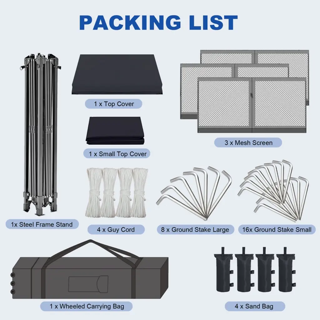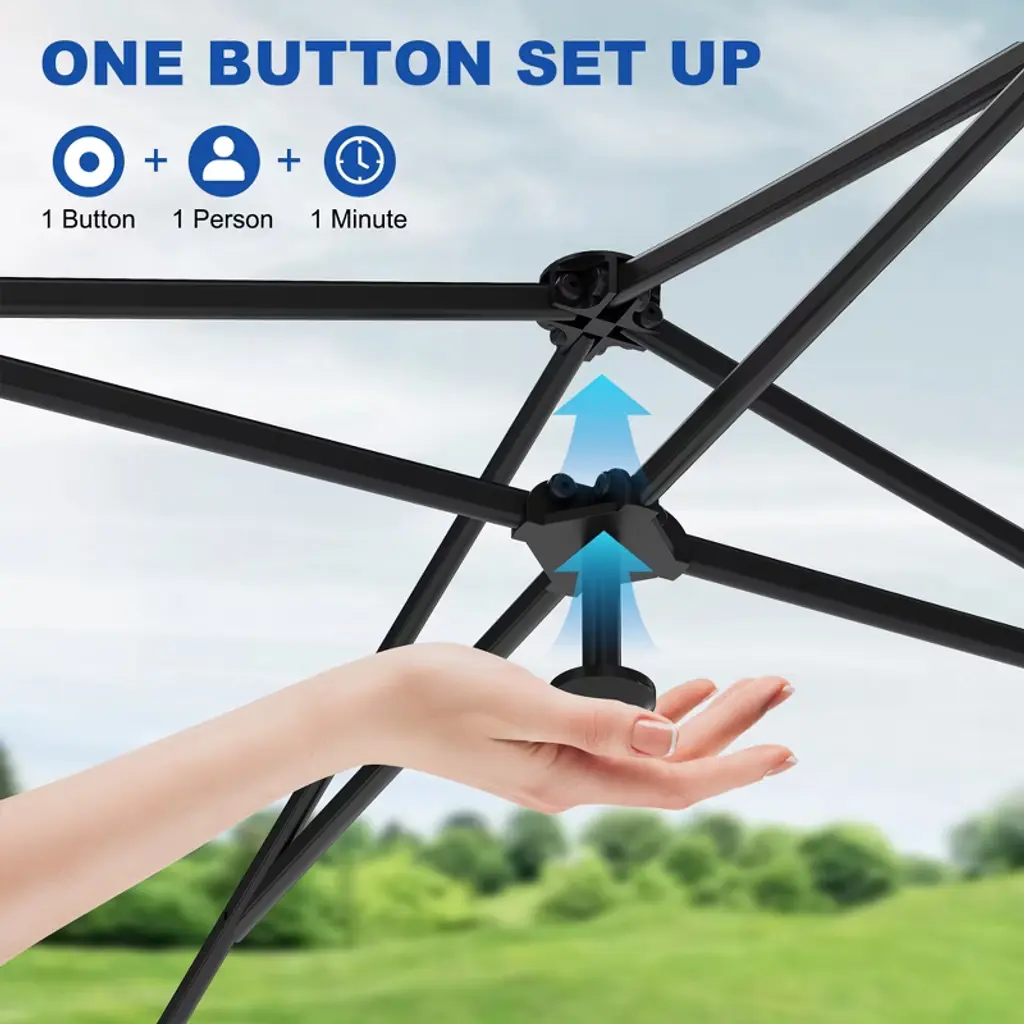 UPGRADE FABRIC - The fabric is designed to professionally shield you from sun, wind, and rain. The rugged 300D silver-coated canopy fabric offers UPF 50+ UV protection, is CPAI-84 rated as flame resistant, and is water POP UP GAZEBO INFO - Overall Dimensions: 10' in length, 10' in width, and 10' in height. It fits perfectly in your vehicle's trunk. Whether you're having a leisurely tea session or hosting outdoor events, this canopy tent provides ample space for you, your family, and friends to enjoy together EASY & PORTABLE POP UP - Pull the outdoor tent out of the bag and unfold it. With just a single push, the central hub locks the poles in place. There are three adjustable height settings with soft, pinch free buttons, ensuring convenience and safety. Installation requires two people SET INCLUDES - 10x10 Pop Up Canopy Frame + Top Cover + 3 Side Walls + 1 Carry Bag + 4 Sandbags. Our canopy tent with sidewalls has height adjustable legs that lock in place with the push of a button, allowing you to raise or lower it among three height settings STRONG AND STURDY - Our Pop Up Canopy Tent 10x10 tent features a strong full truss structure design frame, which ensures stability and durability, making it suitable for commercial and professional use. This canopy tent is perfect for commercial events, trade shows, farmers' markets, and more
