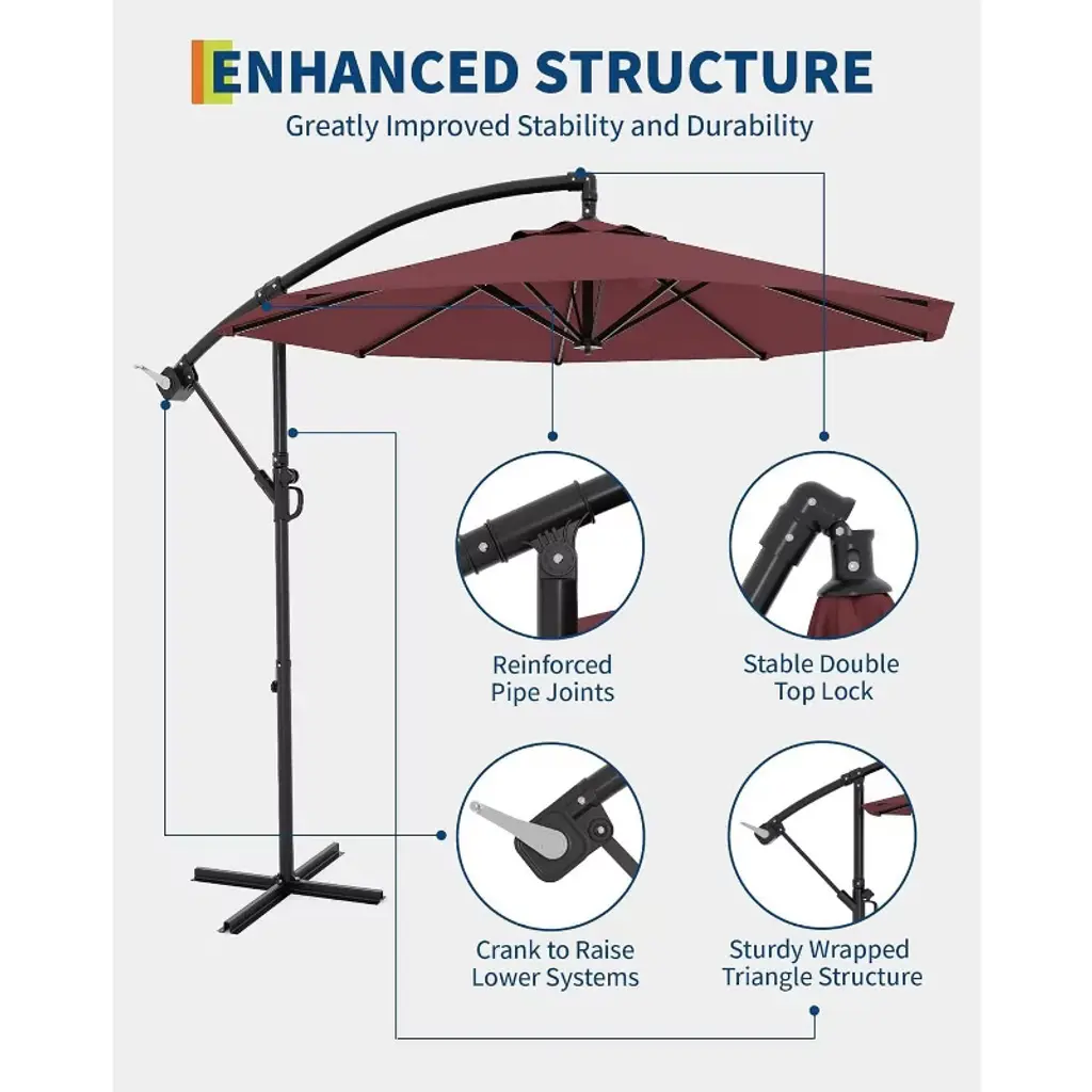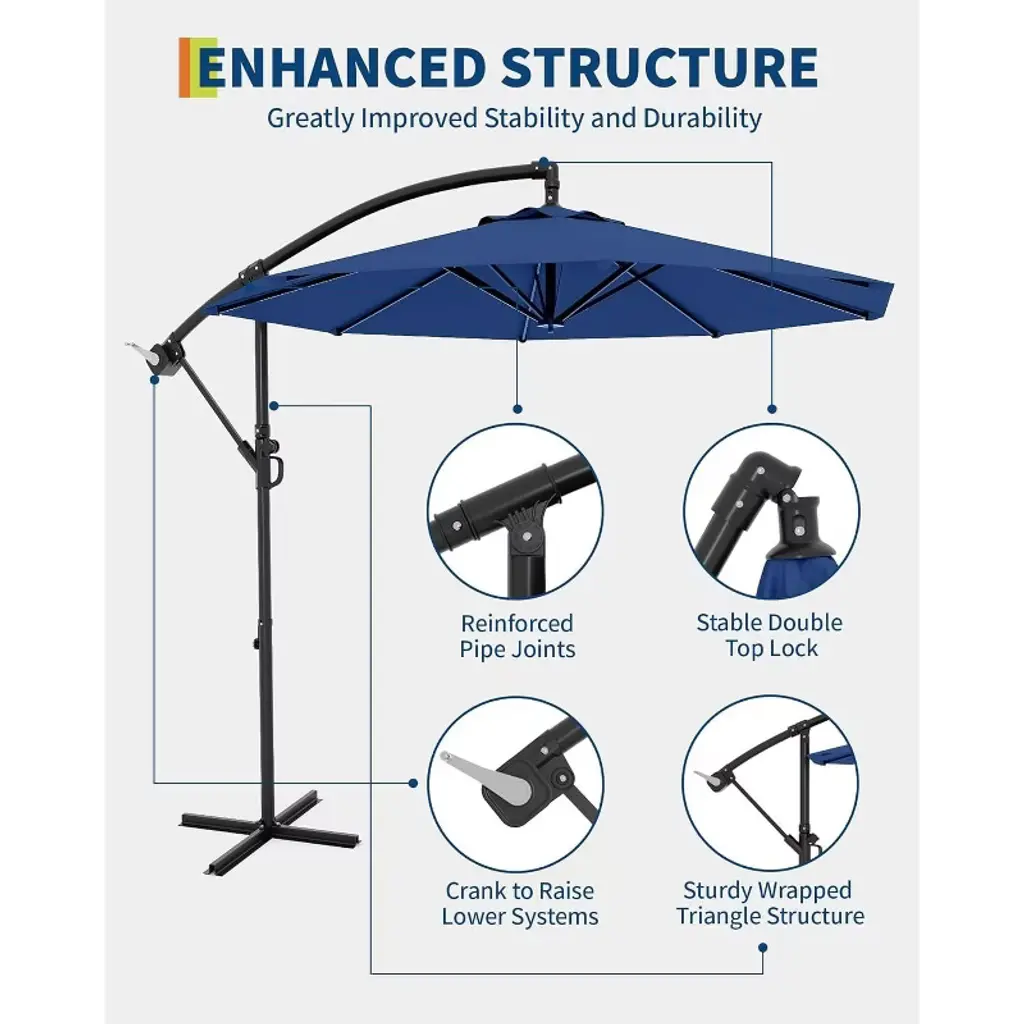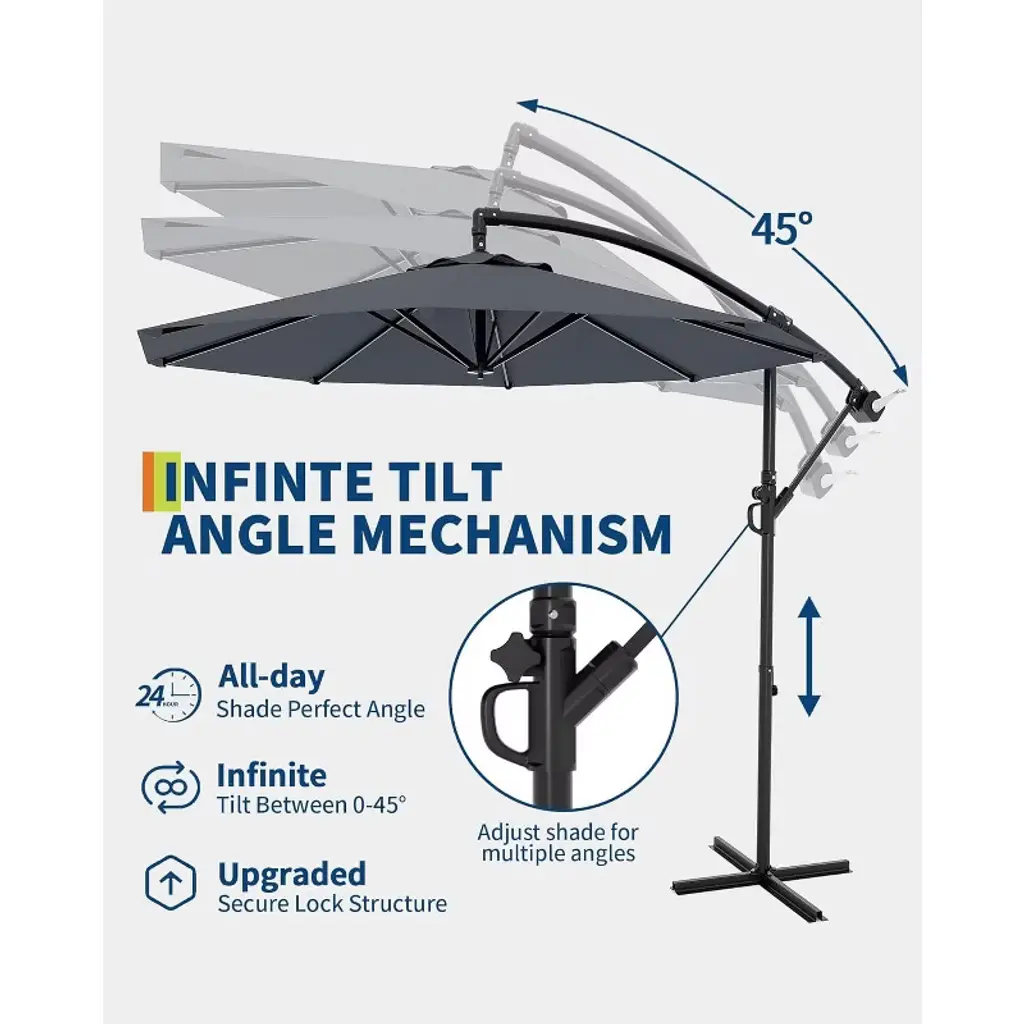Introducing the Cantilever Umbrella with Cross Base, the perfect outdoor shade solution for your deck, pool, garden, or backyard. This 10-foot offset umbrella comfortably shades 2 to 6 people, making it ideal for family gatherings, outdoor dining, or relaxing in the sun. Featuring a sturdy cross base, this umbrella ensures stability and safety even on windy days. Designed with convenience in mind, the umbrella includes an infinite tilt function, allowing you to adjust the canopy angle effortlessly to block the sun from any direction. The easy-to-use crank lift mechanism smoothly opens and closes the umbrella, providing quick shade whenever you need it. Crafted from fade-resistant fabric, the canopy maintains its vibrant color and durability through all seasons, resisting sun damage and weather wear. The offset design keeps the pole out of the way, giving you unobstructed space underneath for furniture and movement. Key Features: - 10-foot cantilever umbrella with cross base for enhanced stability - Comfortable shade coverage for 2 to 8 people - Infinite tilt adjustment to block sun from any angle - Smooth crank lift for easy opening and closing - Fade-resistant canopy fabric for lasting color and protection - Offset design maximizes usable shaded space Upgrade your outdoor living space with this stylish and functional cantilever umbrella. Whether you're hosting a barbecue, lounging by the pool, or enjoying a quiet afternoon, this umbrella provides reliable shade and adds a touch of elegance to your outdoor environment.