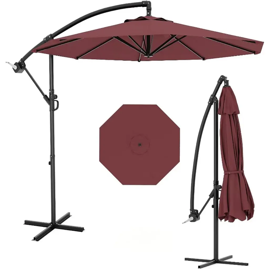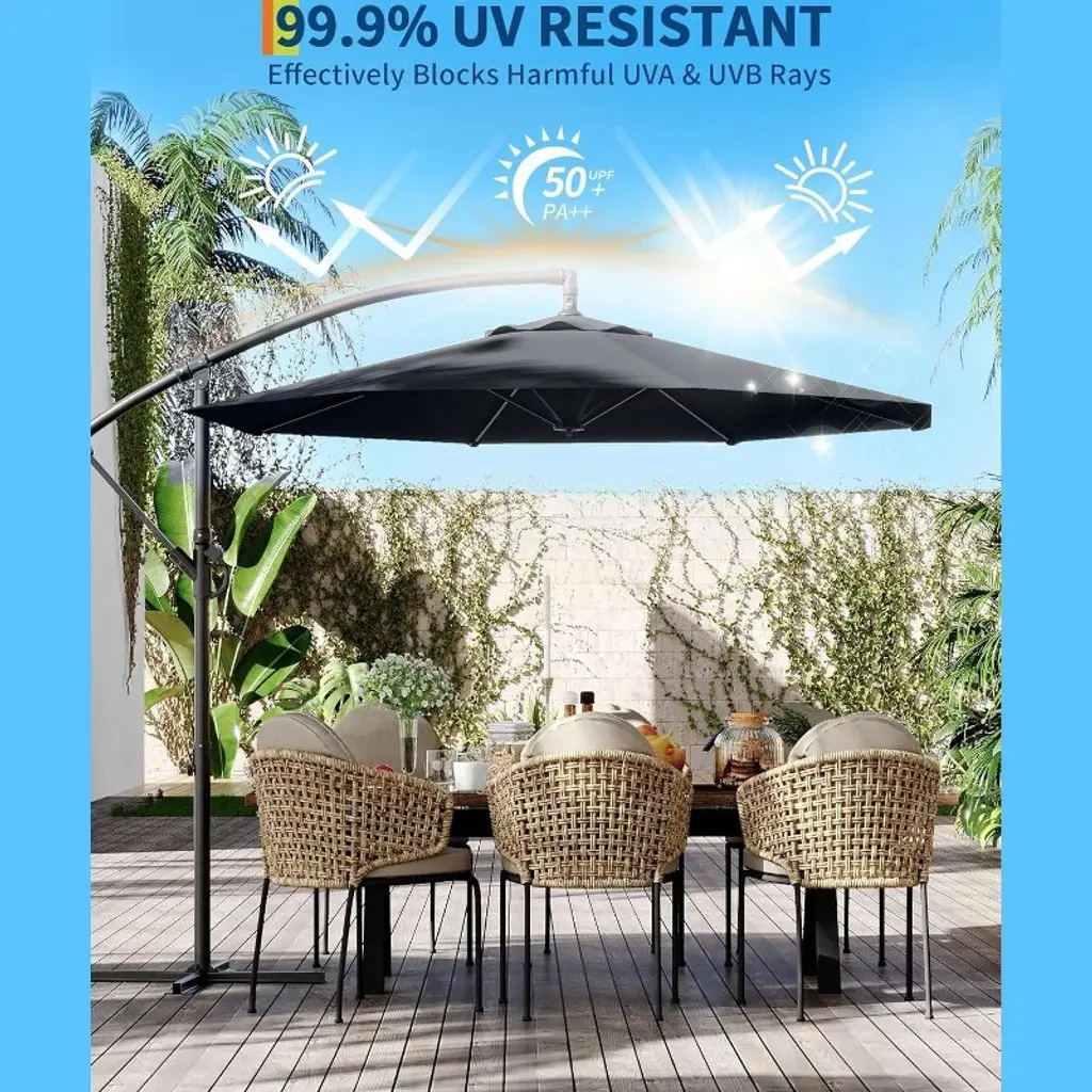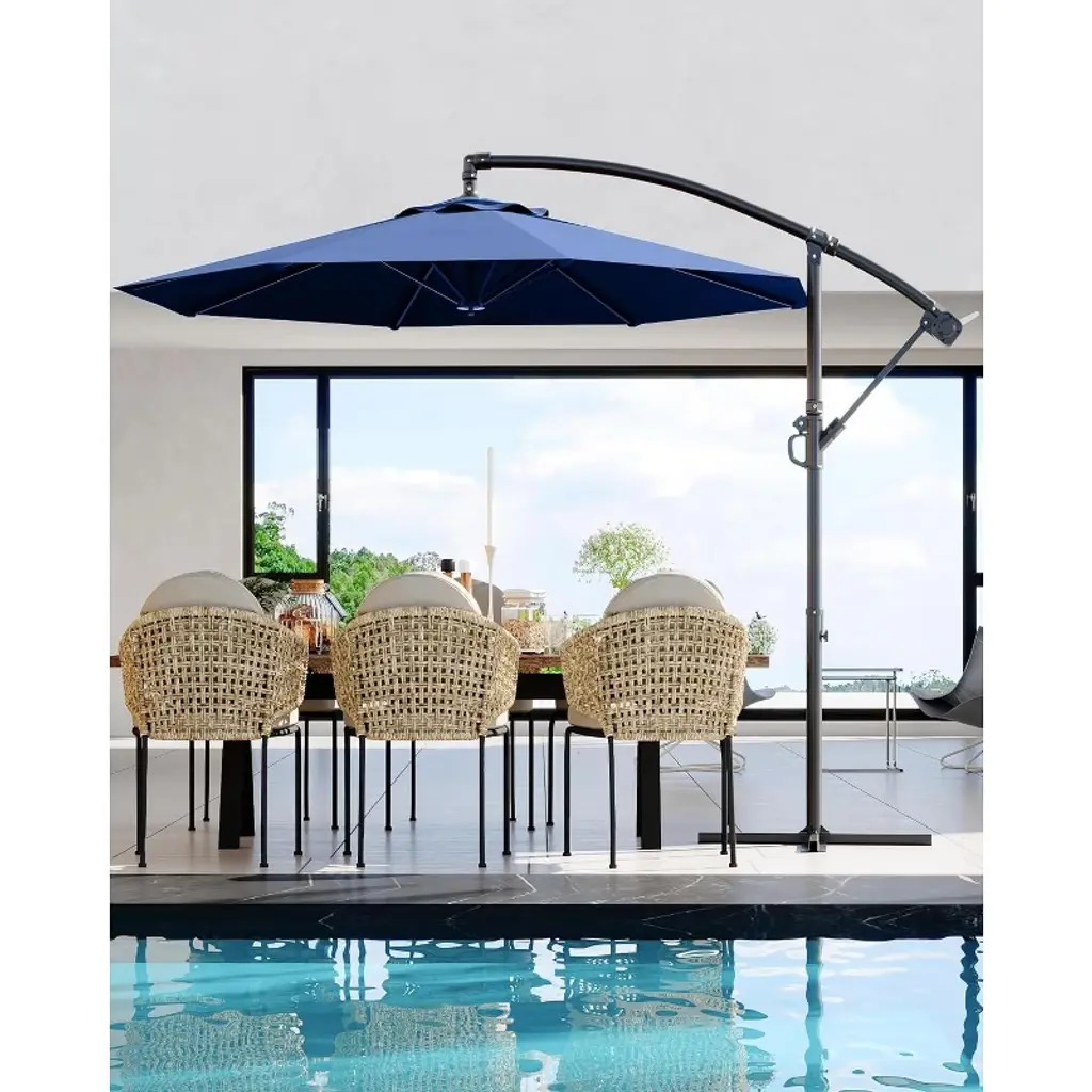 Introducing the Cantilever Umbrella with Cross Base, the perfect outdoor shade solution for your deck, pool, garden, or backyard. This 10-foot offset umbrella comfortably shades 2 to 6 people, making it ideal for family gatherings, outdoor dining, or relaxing in the sun. Featuring a sturdy cross base, this umbrella ensures stability and safety even on windy days. Designed with convenience in mind, the umbrella includes an infinite tilt function, allowing you to adjust the canopy angle effortlessly to block the sun from any direction. The easy-to-use crank lift mechanism smoothly opens and closes the umbrella, providing quick shade whenever you need it. Crafted from fade-resistant fabric, the canopy maintains its vibrant color and durability through all seasons, resisting sun damage and weather wear. The offset design keeps the pole out of the way, giving you unobstructed space underneath for furniture and movement. Key Features: - 10-foot cantilever umbrella with cross base for enhanced stability - Comfortable shade coverage for 2 to 8 people - Infinite tilt adjustment to block sun from any angle - Smooth crank lift for easy opening and closing - Fade-resistant canopy fabric for lasting color and protection - Offset design maximizes usable shaded space Upgrade your outdoor living space with this stylish and functional cantilever umbrella. Whether you're hosting a barbecue, lounging by the pool, or enjoying a quiet afternoon, this umbrella provides reliable shade and adds a touch of elegance to your outdoor environment.
