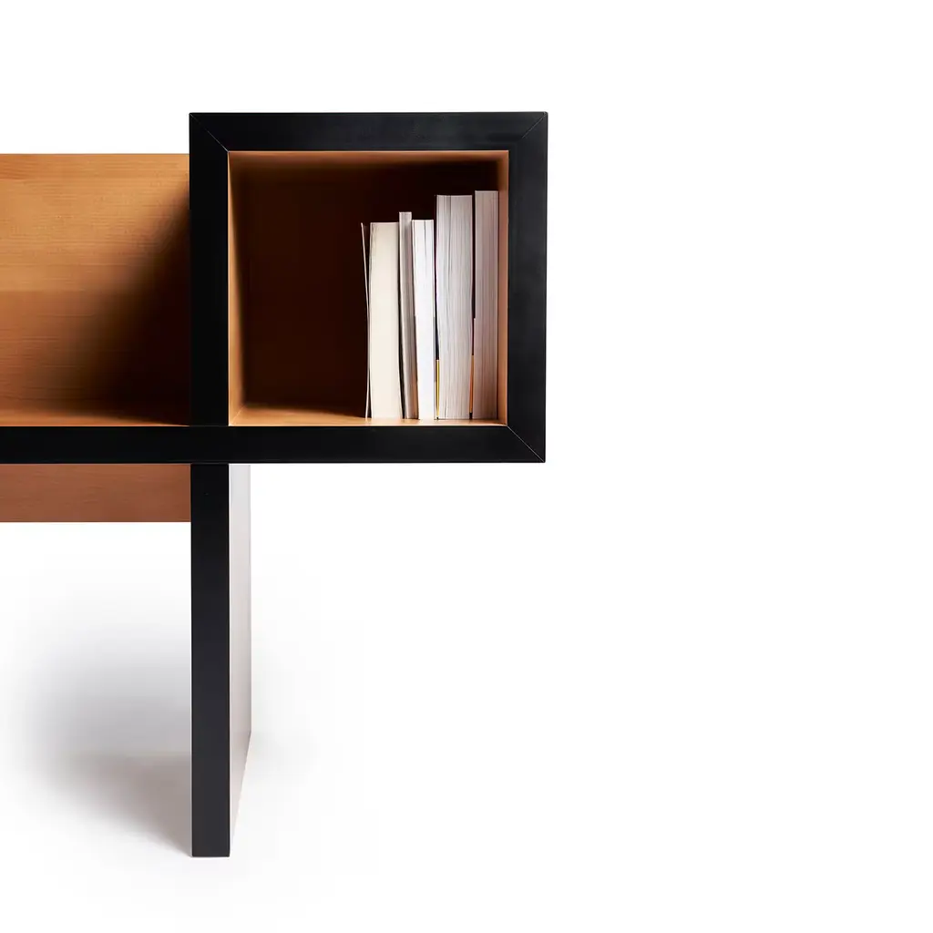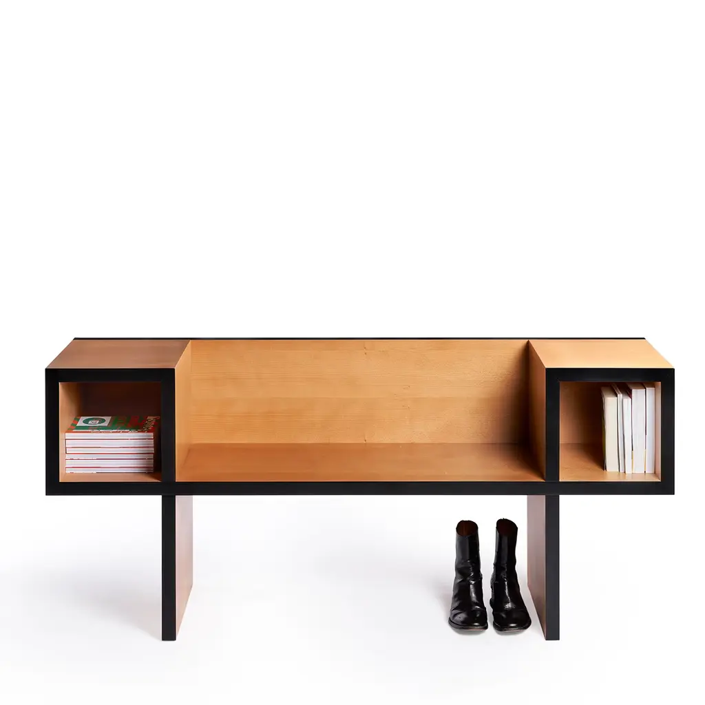 A well-received sacrifice of ergonomics in favor of magnificent abstract aesthetic, this beechwood bench was designed by Franco Raggi in 1988. An exceptional addition to a contemporary entryway, it was born out of a graphic exercise whereby the designer draws a continuous black line to create two lateral squares connected through a horizontal line. The two squares are open compartments perfect for books and magazines while the horizontal line serves as the seat.