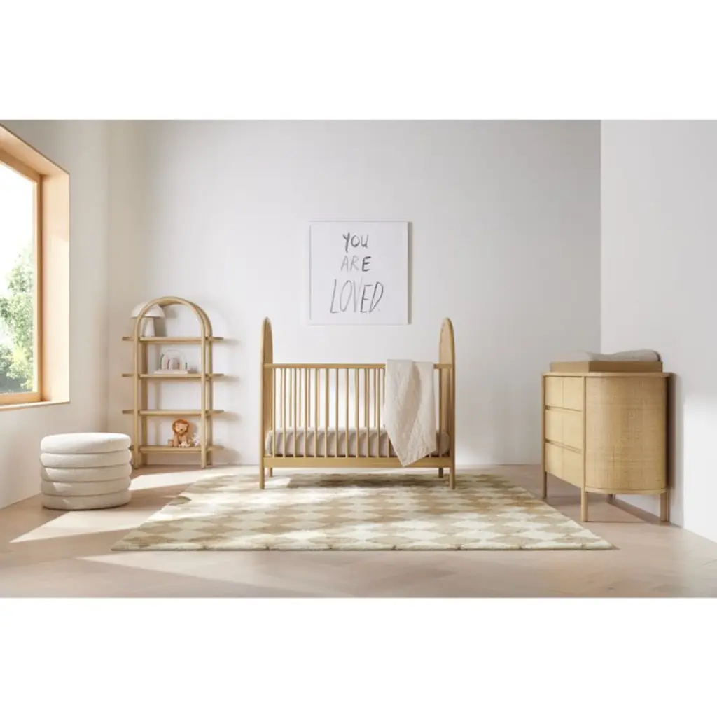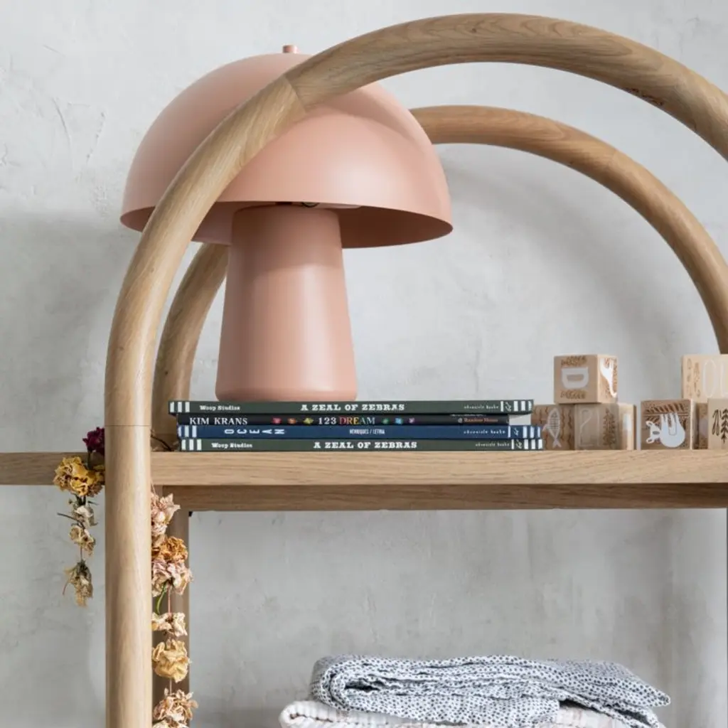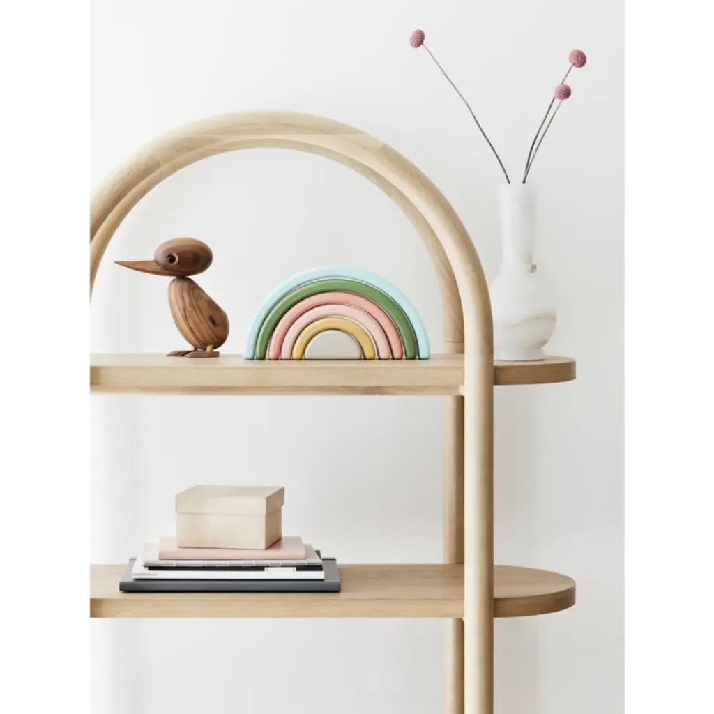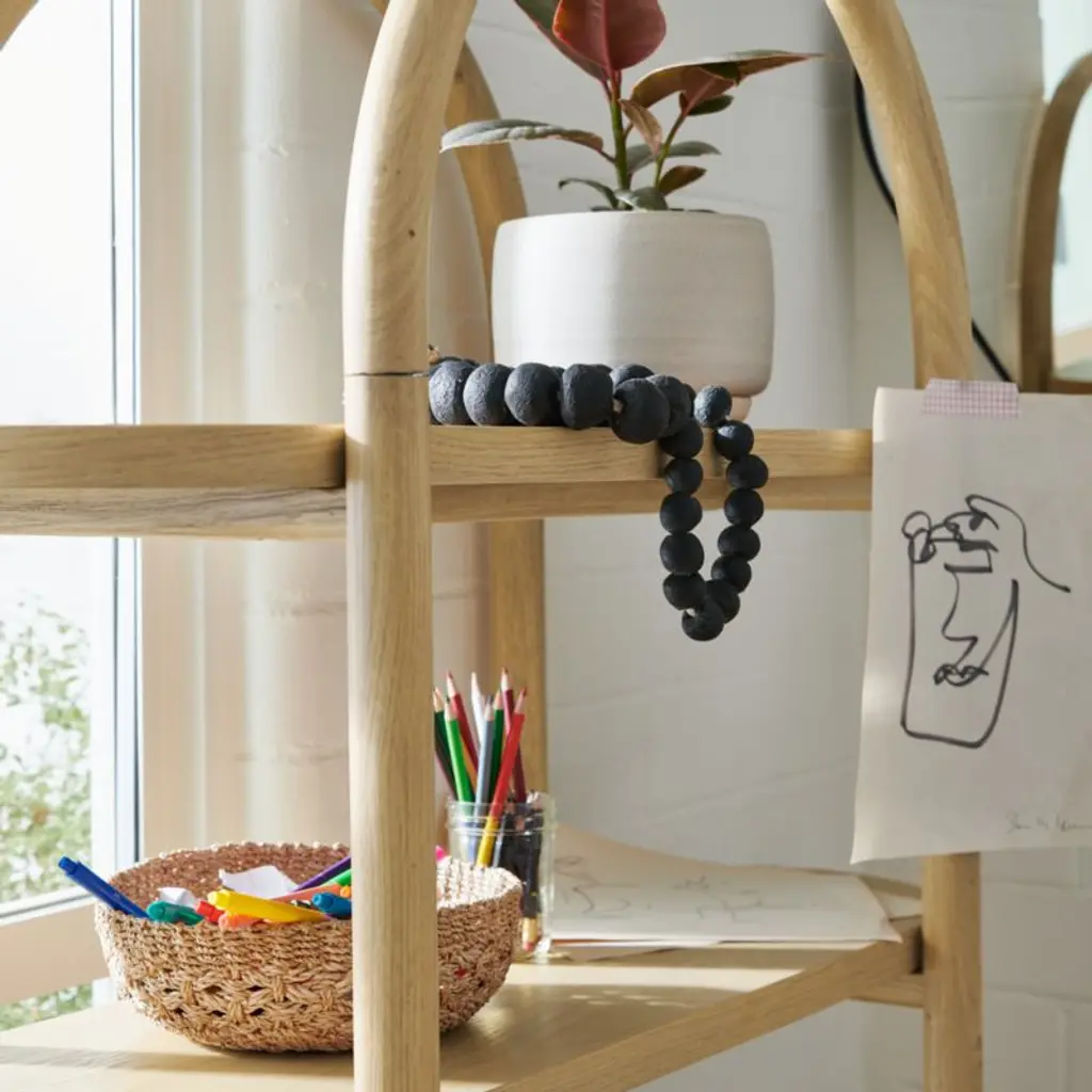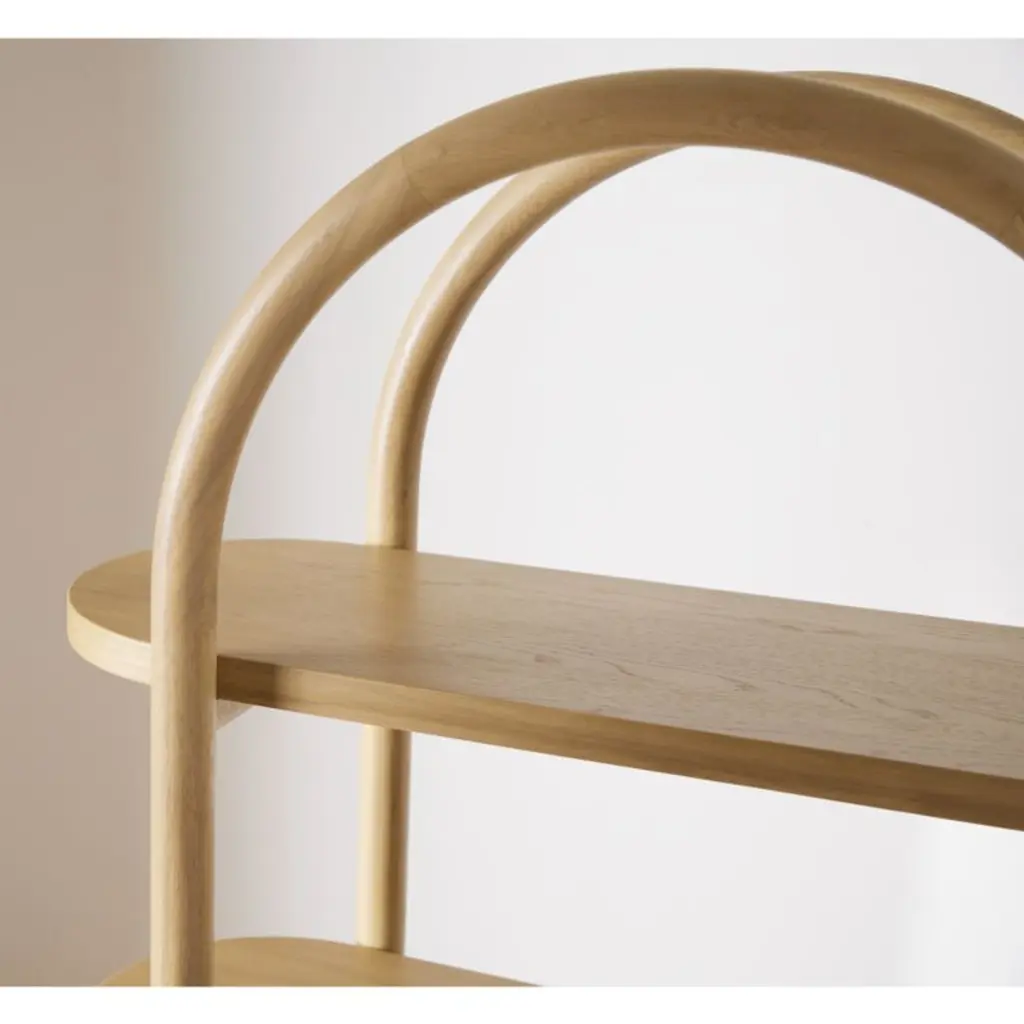 Striking a balance between playful and design-forward, this airy bookcase provides plenty of space for prized possessions and beloved books. Round solid white oak posts curve into soaring arches that support four pill-shaped shelves. Designed by Leanne Ford, our Canyon Natural Tall Bookcase adds storage space and cool factor to the nursery or kids' room.Star designer and mom Leanne Ford brought her cool, casual style to our new collection for kids (and parents) who love to create, play and make magic together.