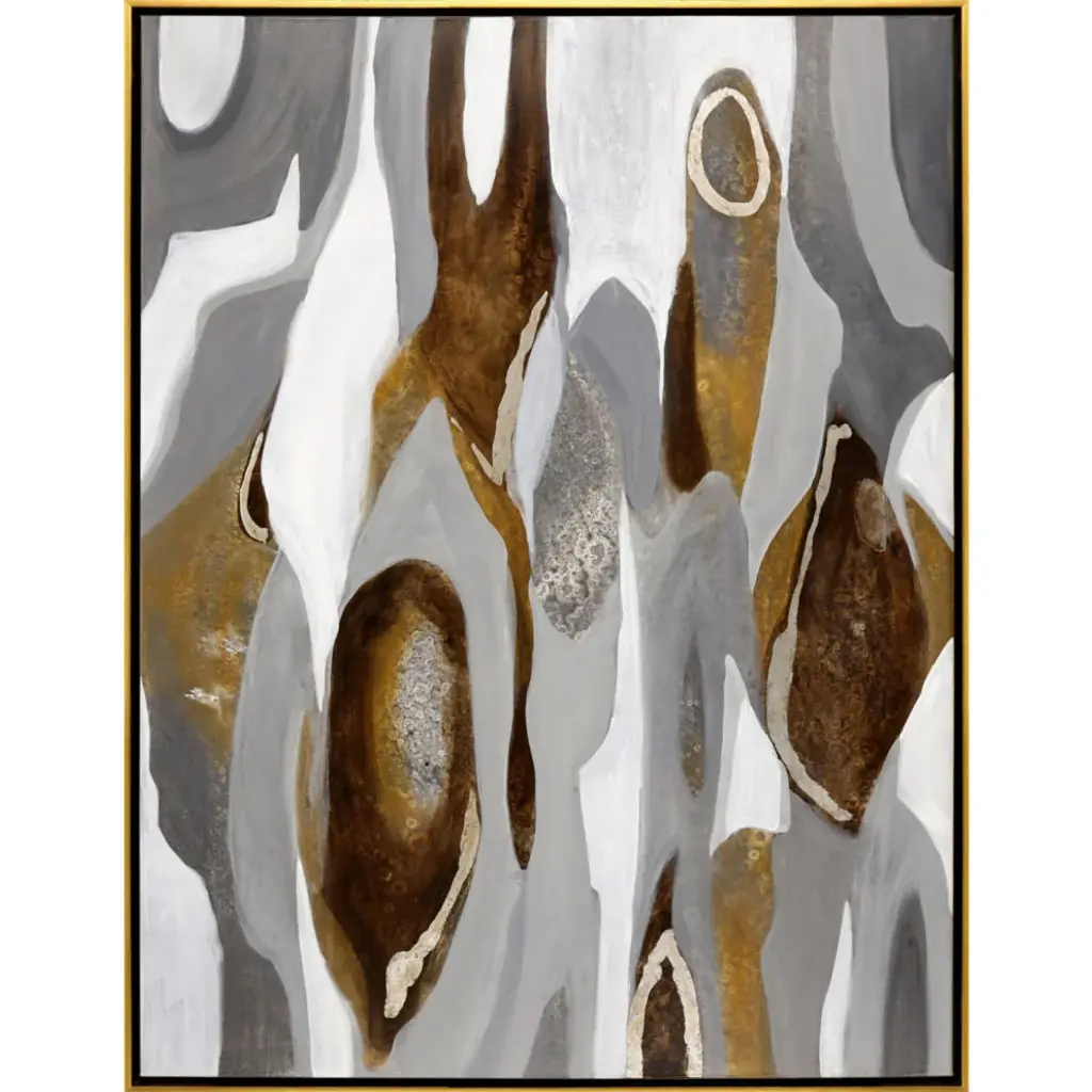 Exclusive hand painted canvas. Hand stretched and mounted in an antique gold wood floater frame.