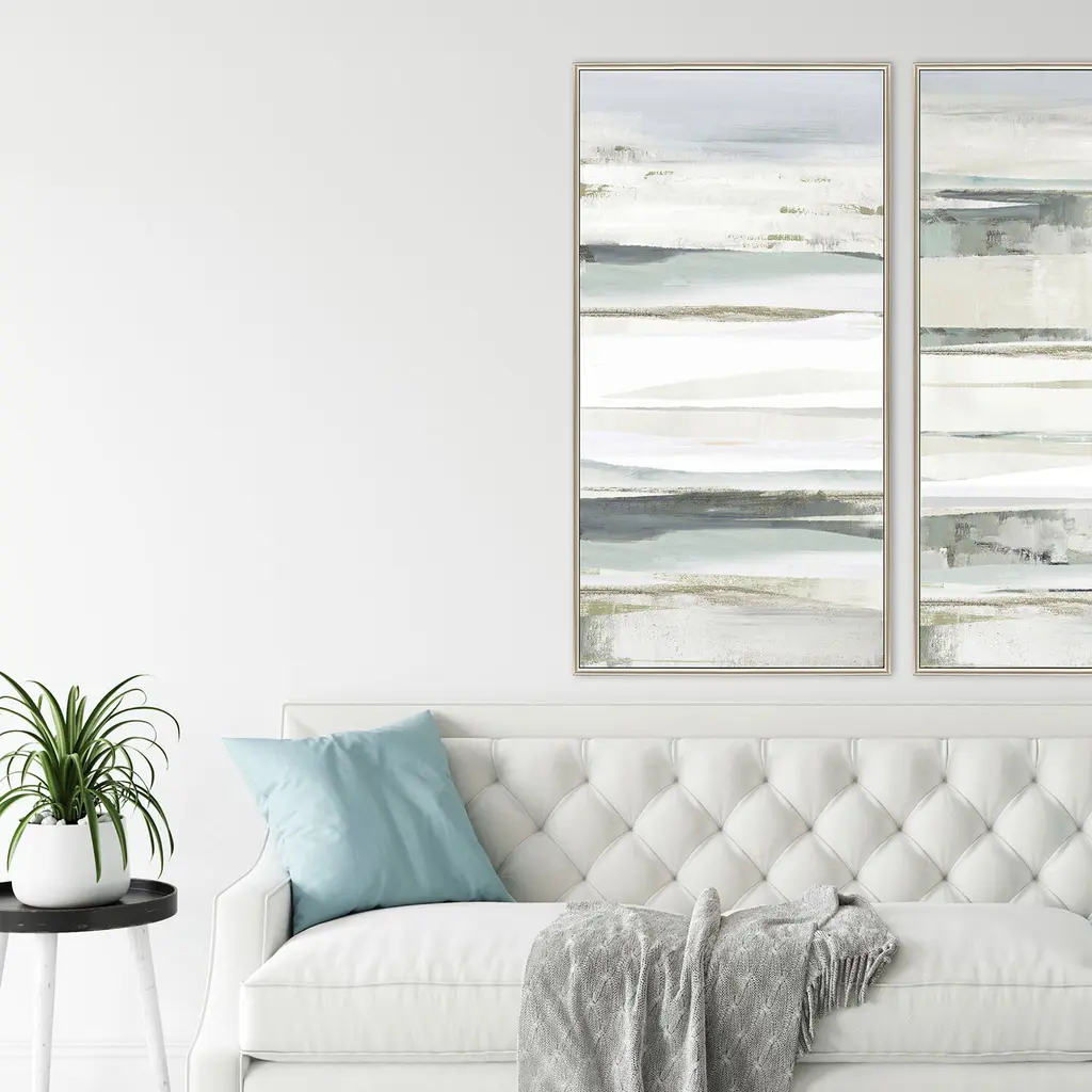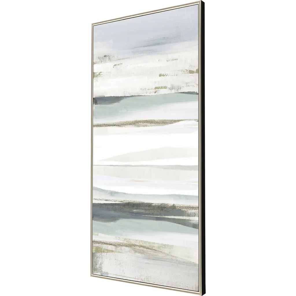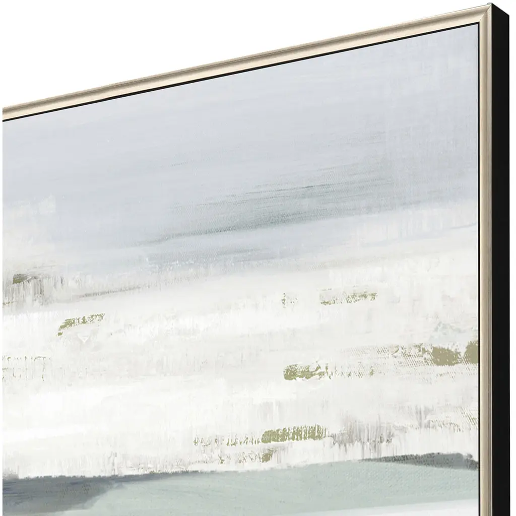 A gray and white abstract is mounted in a warm silver floater frame with satin black side.