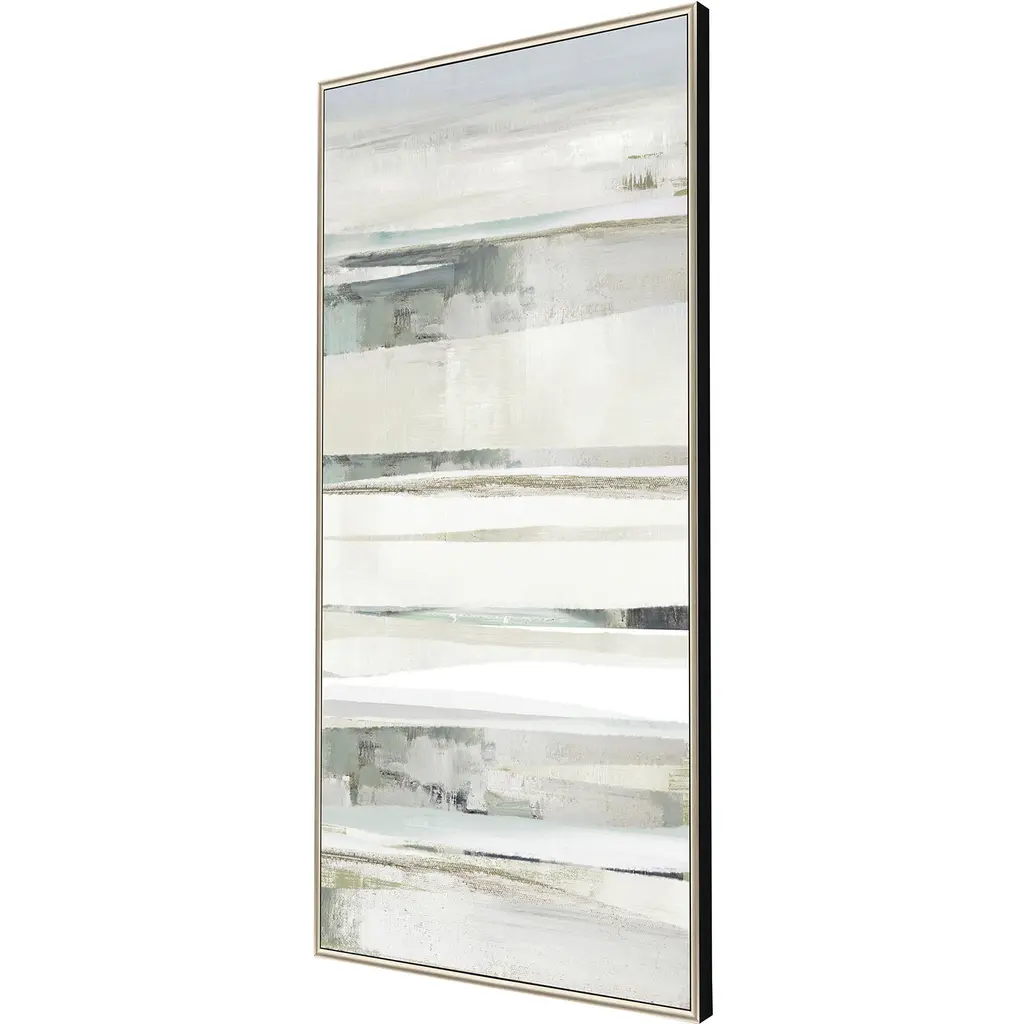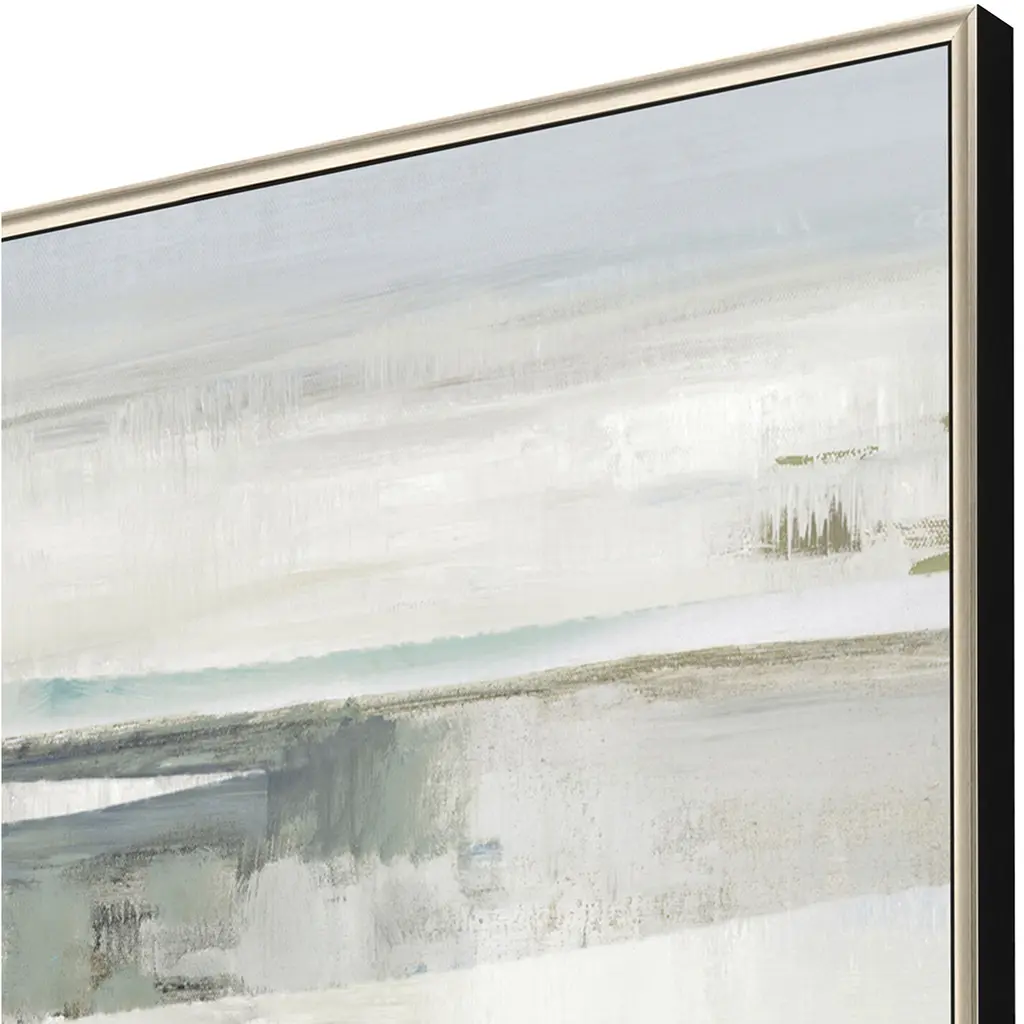 A gray and white abstract is mounted in a warm silver floater frame with satin black side.