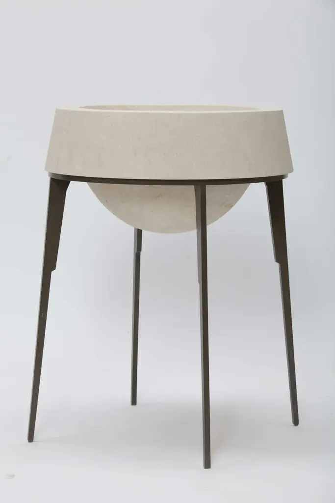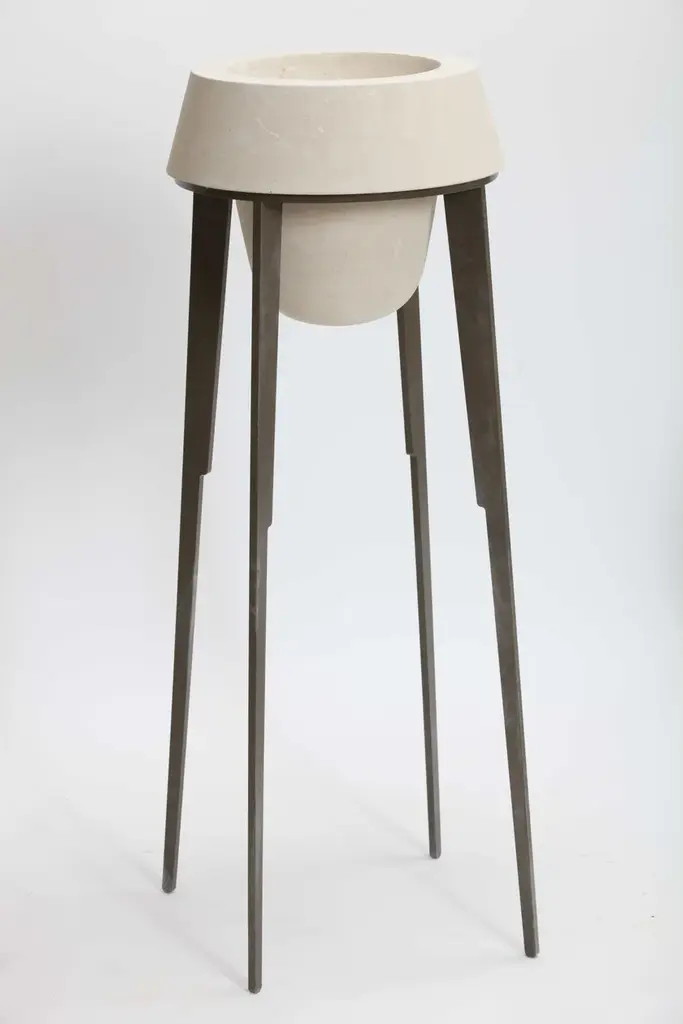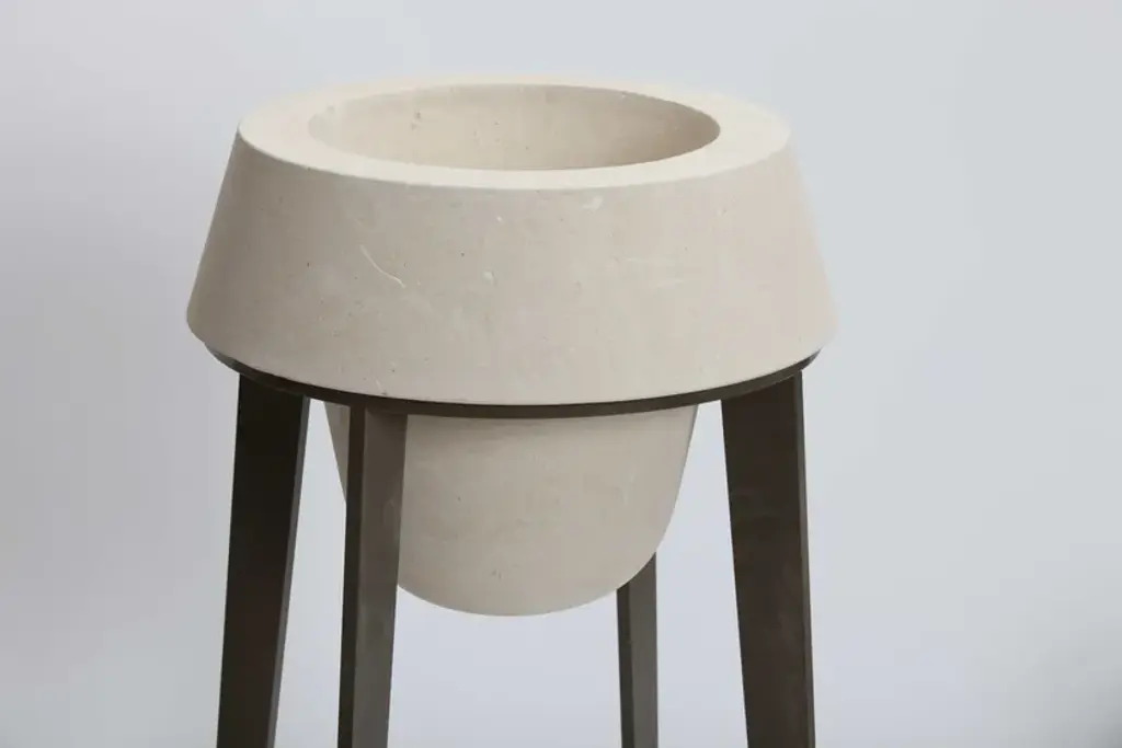 Capasa is a pair of vases consisting of a stone block which, despite its weight, seems to be suspended mid-air, thanks to an iron structure of three slender supports.The Capasa collection consists of vases and a brazier.