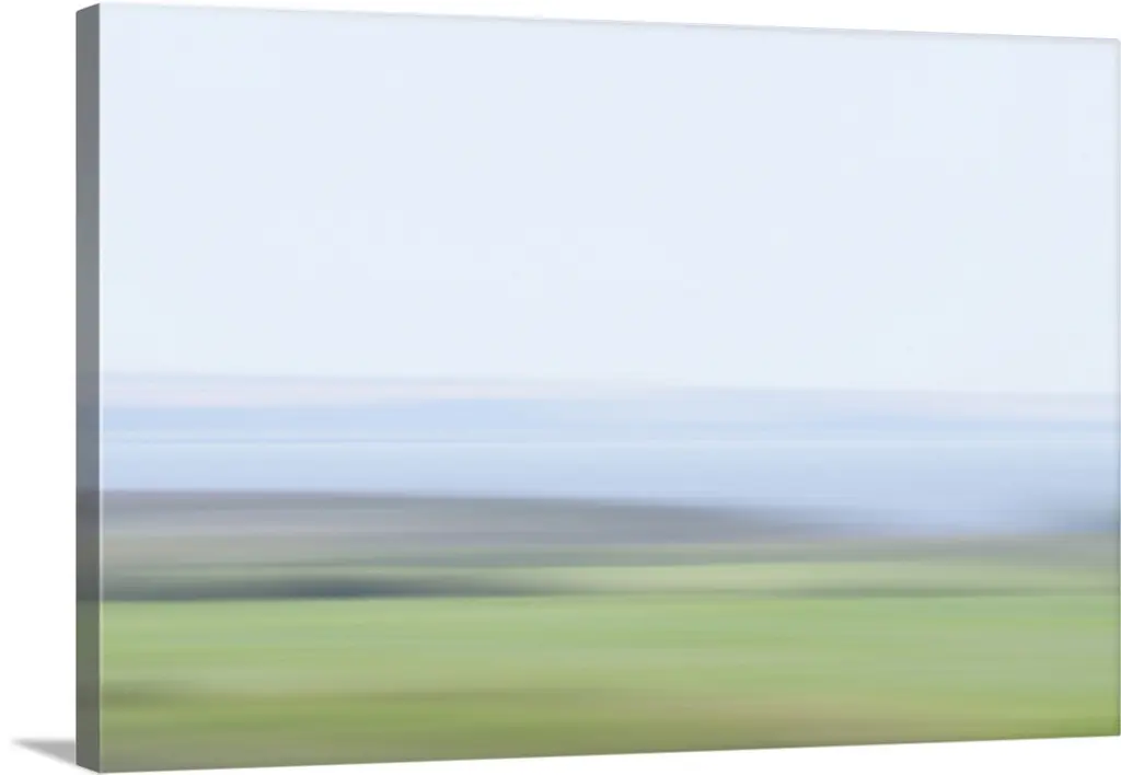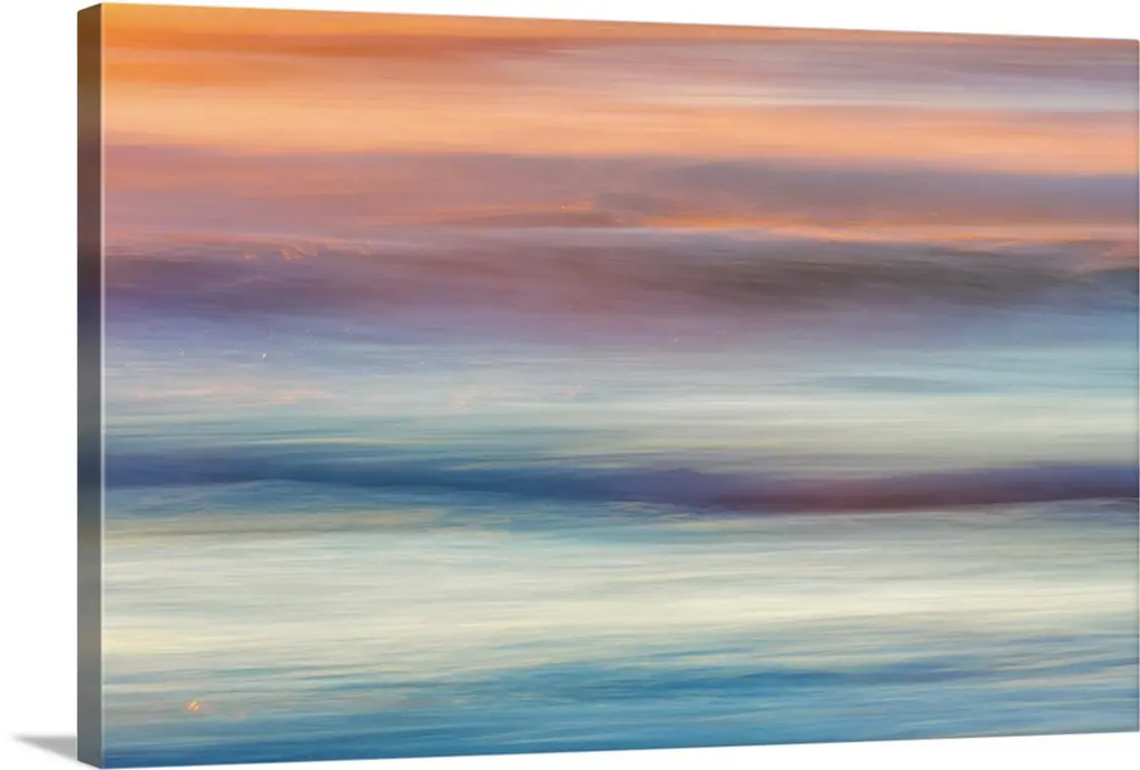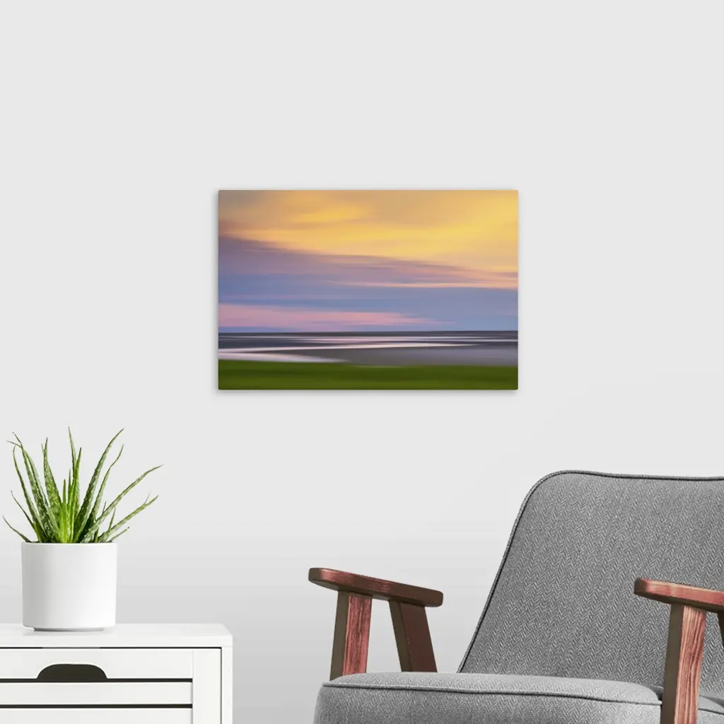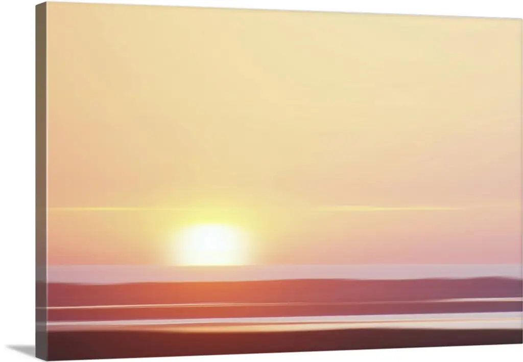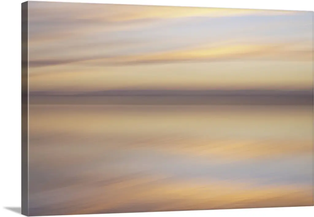Blurred image of the Atlantic coast at sunset, with a pastel cloudy sky.