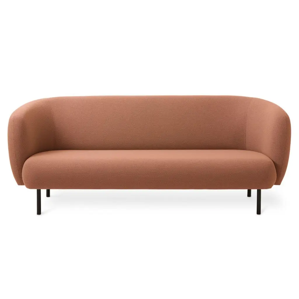 Caper 3 seater fresh peach by Warm NordicDimensions: D 206 x W 84 x H 63 cmMaterial: Textile upholstery, Wooden frame, Powder coated black steel legs.Weight: 55.5 kgAlso available in different colours and finishes.An elegant sofa with an organic design inspired by the puffed sleeves and layered designs of haute couture. Its soft lines and chic details make the Cape sofa a natural focal point, preferably in the company of the armchair in the same range. Both items of furniture are available with or without visible stitching. The sofa looks just as elegant in a modern building as in an old-fashioned luxury flat and has a light look by virtue of its slender metal legs. To achieve aesthetic perfection the Cape range is covered with exclusive furnishing fabrics, including 'Hero', whose soft, almost felt-like surface complements the sofas organic shape, and which is designed by Patricia Urquiola.Warm Nordic is an ambitious design brand anchored in Nordic design history and with a timeless, aesthetic style that inspires you to appreciate the little things in life. The company is the result of several years’ intense work on developing a new design brand with design history, quality and personality at its core. Warm Nordic boasts a colourful and charming universe of furniture, lamps and accessories full of personality. Our designs encapsulate the Nordic spirit, which in its essence is timeless, inclusive and warm.