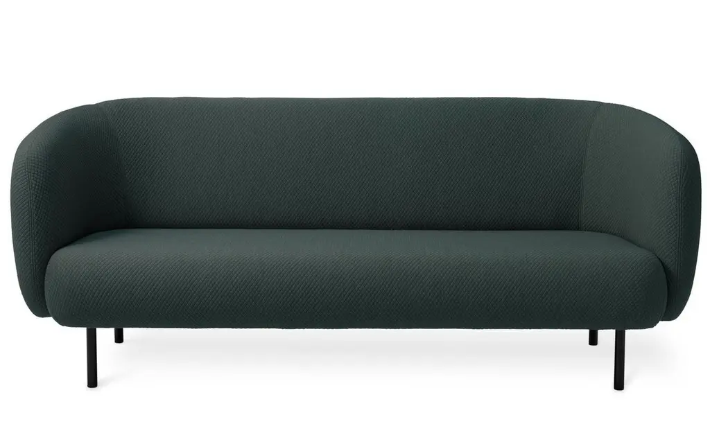 Caper 3 seater Mosaic petrol shade by Warm NordicDimensions: D 206 x W 84 x H 63 cmMaterial: Textile upholstery, Wooden frame, Powder coated black steel legs.Weight: 55.5 kgAlso available in different colours and finishes.An elegant sofa with an organic design inspired by the puffed sleeves and layered designs of haute couture. Its soft lines and chic details make the Cape sofa a natural focal point, preferably in the company of the armchair in the same range. Both items of furniture are available with or without visible stitching. The sofa looks just as elegant in a modern building as in an old-fashioned luxury flat and has a light look by virtue of its slender metal legs. To achieve aesthetic perfection the Cape range is covered with exclusive furnishing fabrics, including 'Hero', whose soft, almost felt-like surface complements the sofas organic shape, and which is designed by Patricia Urquiola.Warm Nordic is an ambitious design brand anchored in Nordic design history and with a timeless, aesthetic style that inspires you to appreciate the little things in life. The company is the result of several years’ intense work on developing a new design brand with design history, quality and personality at its core. Warm Nordic boasts a colourful and charming universe of furniture, lamps and accessories full of personality. Our designs encapsulate the Nordic spirit, which in its essence is timeless, inclusive and warm.