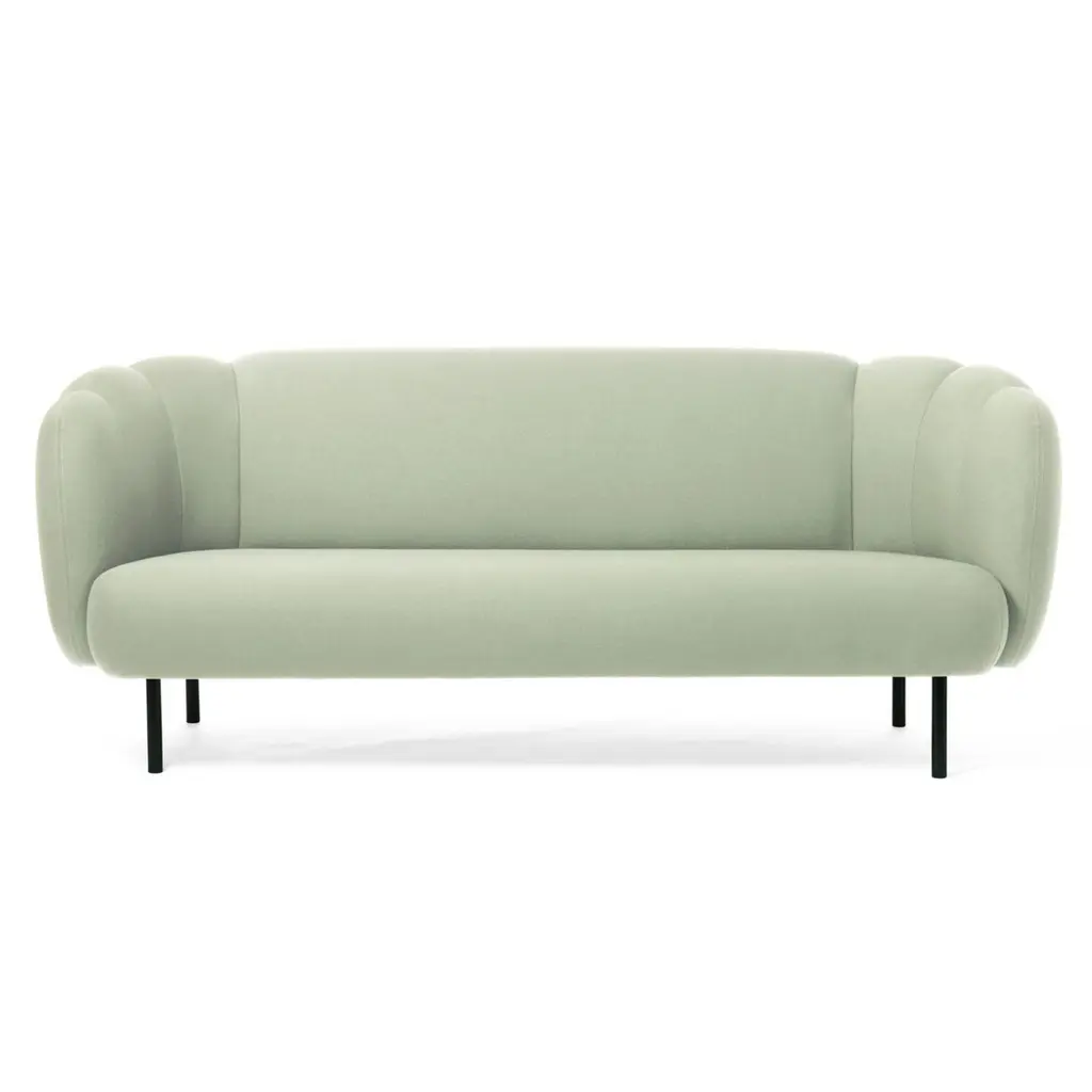 Caper 3 seater with stitches mint by Warm NordicDimensions: D 200 x W 84 x H 80 cmMaterial: Textile upholstery, Wooden frame, Powder coated black steel legs.Weight: 55.5 kgAlso available in different colours and finishes.An elegant sofa with an organic design inspired by the puffed sleeves and layered designs of haute couture. Its soft lines and chic details make the Cape sofa a natural focal point, preferably in the company of the armchair in the same range. Both items of furniture are available with or without visible stitching. The sofa looks just as elegant in a modern building as in an old-fashioned luxury flat and has a light look by virtue of its slender metal legs. To achieve aesthetic perfection the Cape range is covered with exclusive furnishing fabrics, including 'Hero', whose soft, almost felt-like surface complements the sofas organic shape, and which is designed by Patricia Urquiola.Warm Nordic is an ambitious design brand anchored in Nordic design history and with a timeless, aesthetic style that inspires you to appreciate the little things in life. The company is the result of several years’ intense work on developing a new design brand with design history, quality and personality at its core. Warm Nordic boasts a colourful and charming universe of furniture, lamps and accessories full of personality. Our designs encapsulate the Nordic spirit, which in its essence is timeless, inclusive and warm.