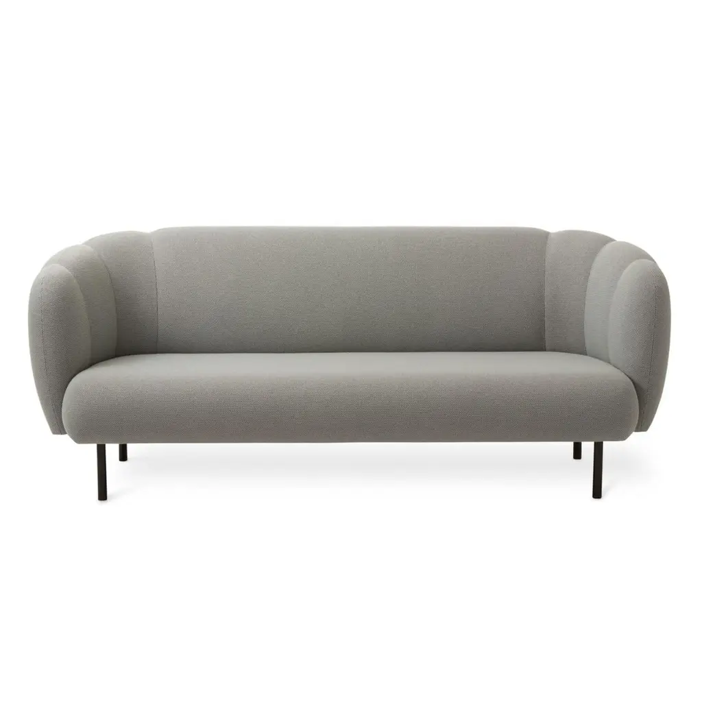 Caper 3 seater with stitches minty grey by Warm NordicDimensions: D 200 x W 84 x H 80 cmMaterial: Textile upholstery, Wooden frame, Powder coated black steel legs.Weight: 55.5 kgAlso available in different colours and finishes.An elegant sofa with an organic design inspired by the puffed sleeves and layered designs of haute couture. Its soft lines and chic details make the Cape sofa a natural focal point, preferably in the company of the armchair in the same range. Both items of furniture are available with or without visible stitching. The sofa looks just as elegant in a modern building as in an old-fashioned luxury flat and has a light look by virtue of its slender metal legs. To achieve aesthetic perfection the Cape range is covered with exclusive furnishing fabrics, including 'Hero', whose soft, almost felt-like surface complements the sofas organic shape, and which is designed by Patricia Urquiola.Warm Nordic is an ambitious design brand anchored in Nordic design history and with a timeless, aesthetic style that inspires you to appreciate the little things in life. The company is the result of several years’ intense work on developing a new design brand with design history, quality and personality at its core. Warm Nordic boasts a colourful and charming universe of furniture, lamps and accessories full of personality. Our designs encapsulate the Nordic spirit, which in its essence is timeless, inclusive and warm.