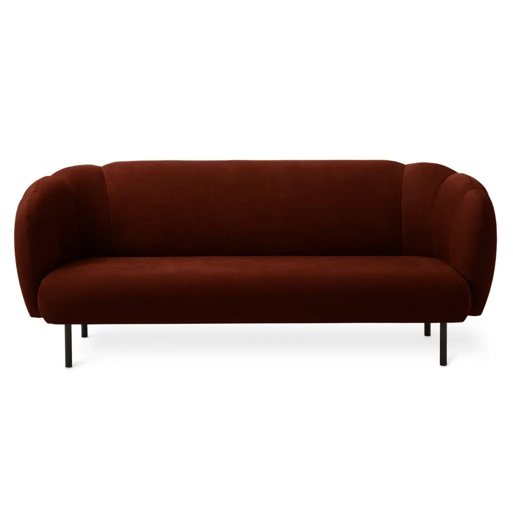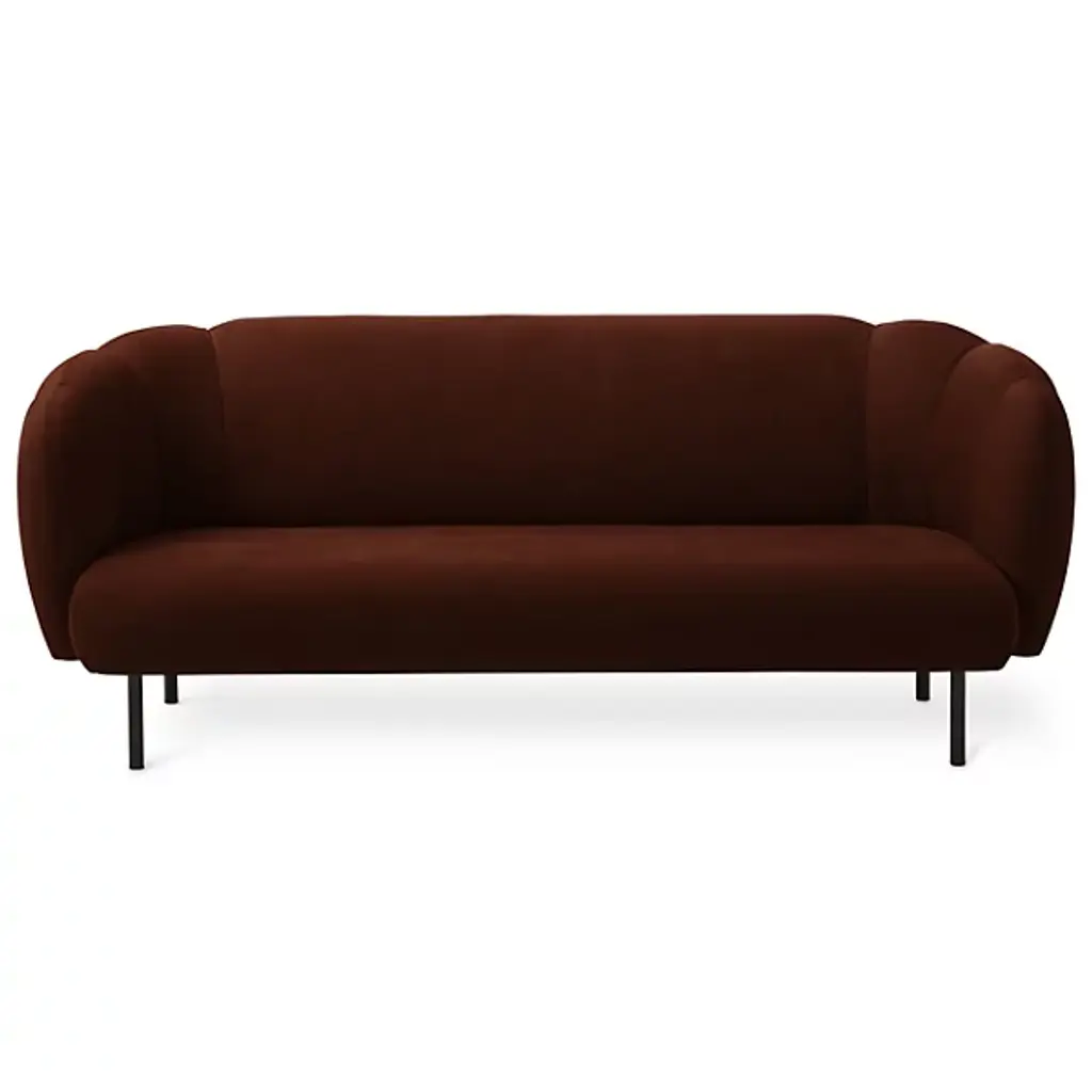 Caper 3 seater with stitches Nabuk Terra by Warm Nordic.Dimensions: D200 x W84 x H 80 cm.Material: Textile upholstery, Wooden frame, Powder coated black steel legs.Weight: 55.5 kgAlso available in different colours and finishes. An elegant sofa with an organic design inspired by the puffed sleeves and layered designs of haute couture. Its soft lines and chic details make the Cape sofa a natural focal point, preferably in the company of the armchair in the same range. Both items of furniture are available with or without visible stitching. The sofa looks just as elegant in a modern building as in an old-fashioned luxury flat and has a light look by Virtue of its slender metal legs. To achieve aesthetic perfection the Cape range is covered with exclusive furnishing fabrics, including 'Hero', whose soft, almost felt-like surface complements the sofas organic shape, and which is designed by Patricia Urquiola.Warm Nordic is an ambitious design brand anchored in Nordic design history and with a timeless, aesthetic style that inspires you to appreciate the little things in life. The company is the result of several years’ intense work on developing a new design brand with design history, quality and personality at its core. Warm Nordic boasts a colourful and charming universe of furniture, lamps and accessories full of personality. Our designs encapsulate the Nordic spirit, which in its essence is timeless, inclusive and warm.