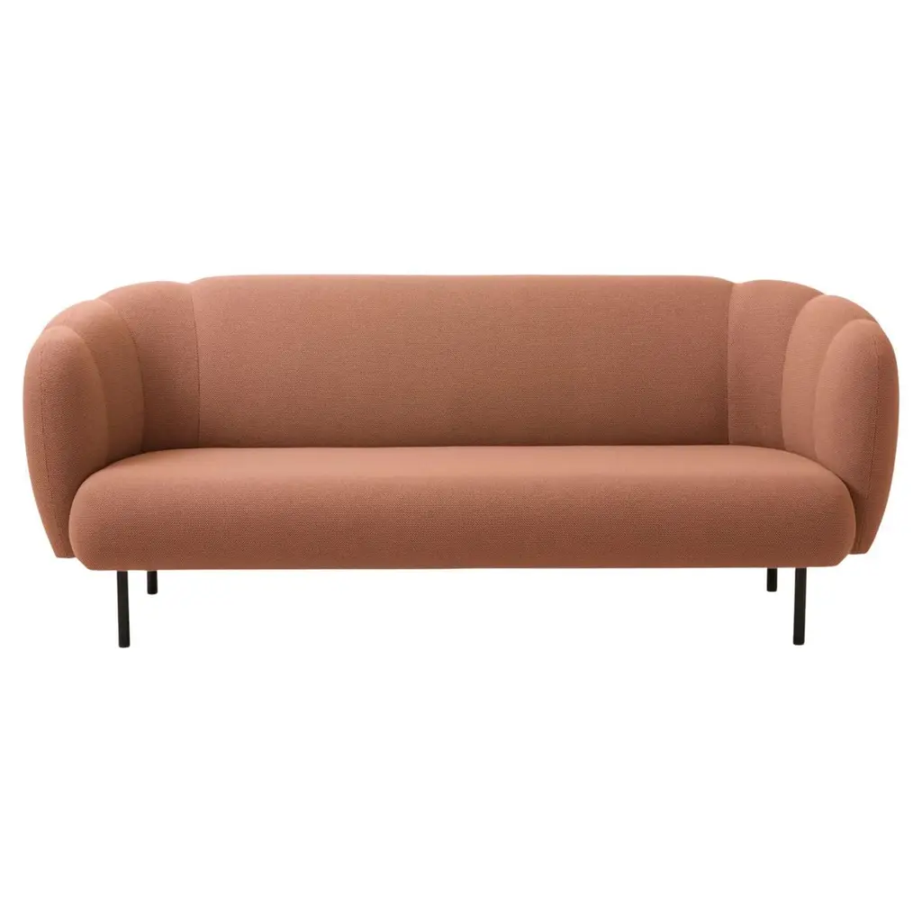Caper 3 seater blush by Warm Nordic Dimensions: D 206 x W 84 x H 63 cm Material: Textile upholstery, Wooden frame, Powder coated black steel legs. Weight: 55.5 kg Also available in different colours. An elegant sofa with an organic design inspired by the puffed sleeves and layered designs of haute couture. Its soft lines and chic details make the Cape sofa a natural focal point, preferably in the company of the armchair in the same range. Both items of furniture are available with or without visible stitching. The sofa looks just as elegant in a modern building as in an old-fashioned luxury flat and has a light look by virtue of its slender metal legs. To achieve aesthetic perfection the Cape range is covered with exclusive furnishing fabrics, including 'Hero', whose soft, almost felt-like surface complements the sofas organic shape, and which is designed by Patricia Urquiola.