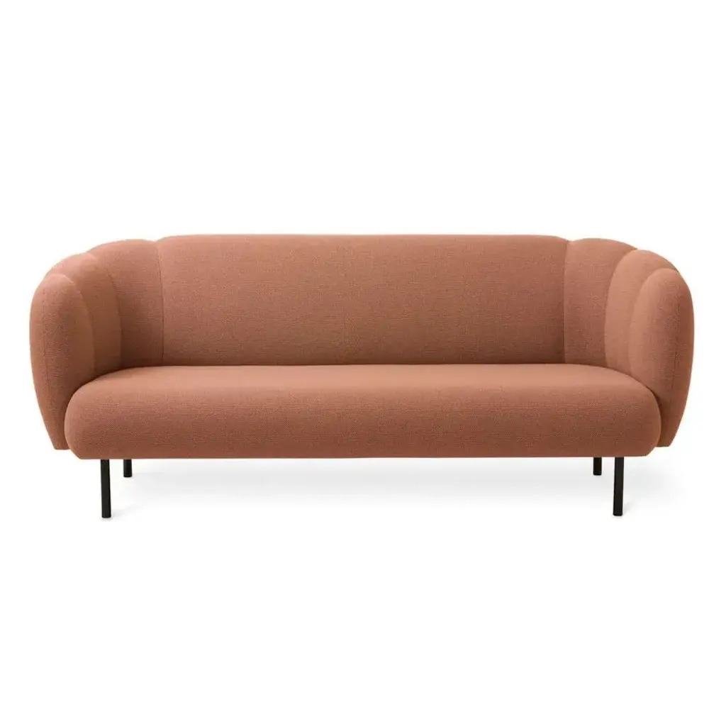 Caper 3 seater with stitches fresh peach by Warm Nordic Dimensions: D200 x W84 x H 80 cm Material: Textile upholstery, Wooden frame, Powder coated black steel legs. Weight: 55.5 kg Also available in different colours and finishes. An elegant sofa with an organic design inspired by the puffed sleeves and layered designs of haute couture. Its soft lines and chic details make the Cape sofa a natural focal point, preferably in the company of the armchair in the same range. Both items of furniture are available with or without visible stitching. The sofa looks just as elegant in a modern building as in an old-fashioned luxury flat and has a light look by virtue of its slender metal legs. To achieve aesthetic perfection the Cape range is covered with exclusive furnishing fabrics, including 'Hero', whose soft, almost felt-like surface complements the sofas organic shape, and which is designed by Patricia Urquiola.
