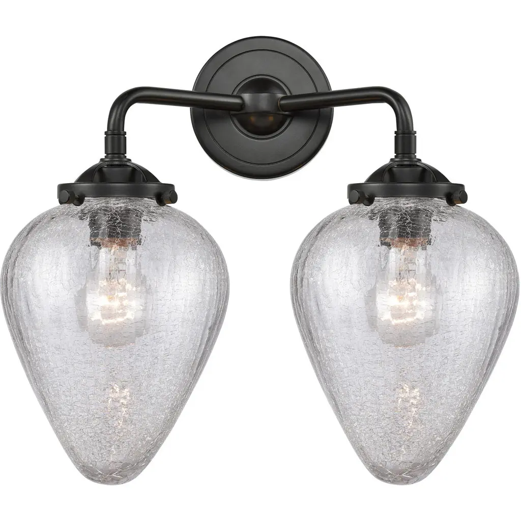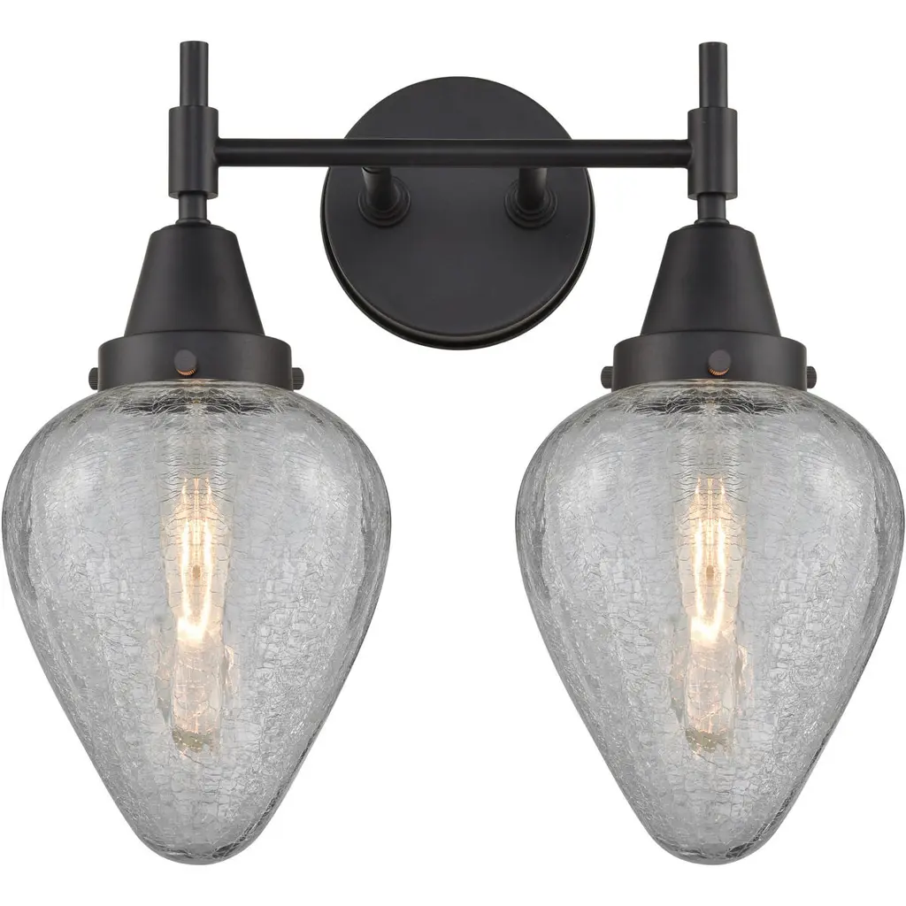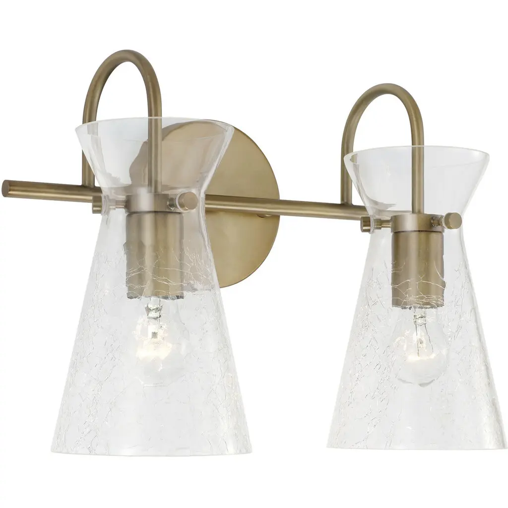 The unique half-crackle glass detail of the Mila 2-Light Vanity creates a one-of-a-kind visual texture. The Matte Black finish and the tapered silhouette brings a sleek, sophisticated style. Also available in a 3-Light.14" W x 11" H 2-Light Vanity in Matte Black with Clear Half-Crackle GlassUL listed. Rated for Damp locationsDIMENSIONS: Overall: 14.25"W x 11"H x 7.5"E; Backplate: 5"W x 5"H x 0.75"EDETAILS: The tapered, clear glass is accented with a crackle pattern on the bottom half of the glass.FINISH: Matte Black is a powder coated, muted, neutral tone.BULBS: Designed to be dimmable and LED/CFL/Incandescent bulb compatible, this fixture uses 2 - 100 Watt (max) E26 Medium base bulbs (not included). It''s shown here with an A15 lamp.FEATURES: Rated for Damp locations; includes a 1-Year Manufacturer Warranty.Material : Metal & GlassFinish : Matte Black2-Light VanityStyle Category : ModernWidth : 14.25"Height : 11"Extends : 7.5"Weight : 5.5LBsBackplate Dimension : 5"Number_Of_Bulbs : 2Max Wattage : 100Bulb NOT IncludedBulb_ANSI_Base : E26 Bulb_Base : MediumVoltage : 120Clear Half-Crackle GlassSafety_Rating : ULDamp_Rated : YesADA_Compliant : No