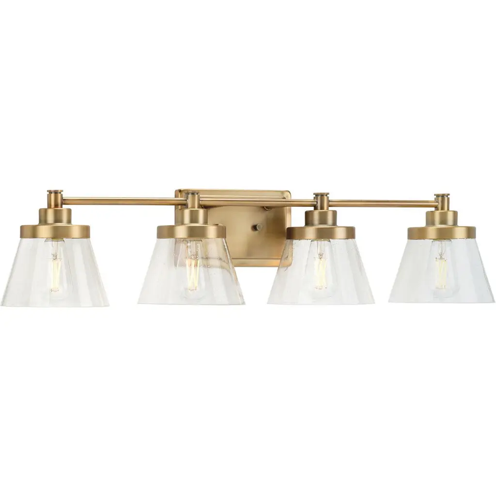 Simple and stunning, the Breigh 4-Light Vanity adds understated glamour to any bathroom. The shimmer of the Brushed Champagne finish and the shine of the acrylic rod and bobeche create a look of luxe and sophistication. Also available as a 2-Light or 3-Light. 14" W x 10" H 4-Light Vanity in Brushed Champagne with Acrylic Rod AccentsUL listed. Rated for Damp locationsDIMENSIONS: Overall: 31.75"W x 9.75"H x 7"E; Backplate: 14"W x 5"H x 1"EDETAILS: The acrylic rod accents are paired with clear glass shades.FINISH: A light gold with silver undertones, this hand-applied, painted finish has a subtle shimmer and brushed visual texture.BULBS: Designed to be dimmable and LED/CFL/Incandescent bulb compatible, this fixture uses 4 - 100 Watt (max) E26 Medium base bulbs (not included). It''s shown here with an A15 lamp.FEATURES: Rated for Damp locations; includes a 1-Year Manufacturer Warranty.Special_Features : Acrylic Rod AccentsMaterial : Metal & GlassFinish : Brushed Champagne4-Light VanityStyle Category : TransitionalWidth : 31.75"Height : 9.75"Extends : 7"Weight : 8.75LBsBackplate Dimension : 14"Number_Of_Bulbs : 4Max Wattage : 100Bulb NOT IncludedBulb_ANSI_Base : E26 Bulb_Base : MediumVoltage : 120Clear GlassSafety_Rating : ULDamp_Rated : YesADA_Compliant : No