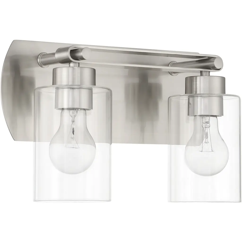 Clean lines and modern forms create the Mason 2-Light Vanity for Homeplace. The Brushed Nickel finish accents the designer details and adds warmth to any bathroom. Also available in a 3-Light or 4-Light. 14" W x 9" H 2-Light Vanity in Brushed Nickel with Clear GlassUL listed. Rated for Damp locationsDIMENSIONS: Overall: 13.75"W x 9.25"H x 6.75"E; Backplate: 5"W x 5"H x 0.75"EDETAILS: Decorative metal cap sits inside clear glass. Available in three finishes for maximum versatility. FINISH: With a soft, visual texture, the Brushed Nickel finish is a light-medium grey with slightly warm undertones.BULBS: Designed to be dimmable and LED/CFL/Incandescent bulb compatible, this fixture uses 2 - 100 Watt (max) E26 Medium base bulbs (not included). It''s shown here with an A15 lamp.FEATURES: Rated for Damp locations; includes a 1-Year Manufacturer Warranty.Material : Metal & GlassFinish : Brushed Nickel2-Light VanityStyle Category : TransitionalWidth : 13.75"Height : 9.25"Extends : 6.75"Weight : 4LBsBackplate Dimension : 5"Number_Of_Bulbs : 2Max Wattage : 100Bulb NOT IncludedBulb_ANSI_Base : E26 Bulb_Base : MediumVoltage : 120Clear GlassSafety_Rating : ULDamp_Rated : YesADA_Compliant : No