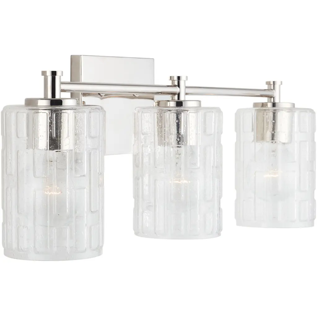 Seeded glass with an embossed geometric pattern sparkles on the Emerson 3-Light Vanity. The clean and classic frame is finished in Aged Brass and is available as a 2-light or 3-light. APPLICATIONS: Rated for damp locations, perfect for bathrooms and powder rooms. Unusual seeded geometric glass adorns this aged brass beauty. EASY TO INSTALL: Replacing an existing fixture is easy with the included instructions and can be finished in as little as 15 minutes with a few simple hand tools. Install with sockets opening either upward or downward. VERSATILE: Dimmable and LED/CFL/Incandescent compatible, uses three 100-Watt (max) E26 medium base bulbs (Not Included) RELIABLE: Includes 1-Year Full Manufacturer's Warranty. Warranty: 1 Year Room Recommendation: Bathroom/Powder Room Mounting Direction: Up or Down Shade Included: Yes