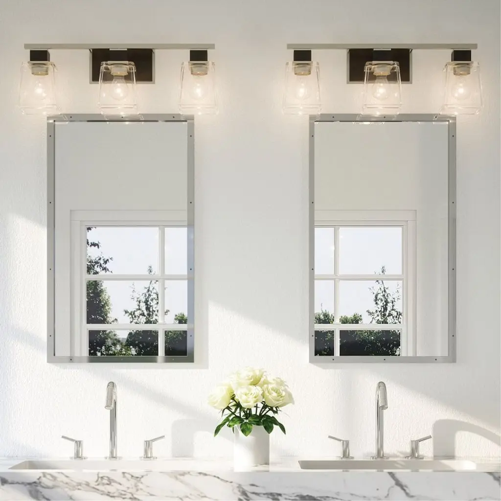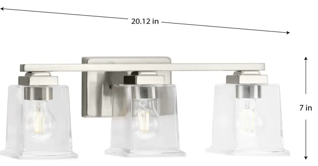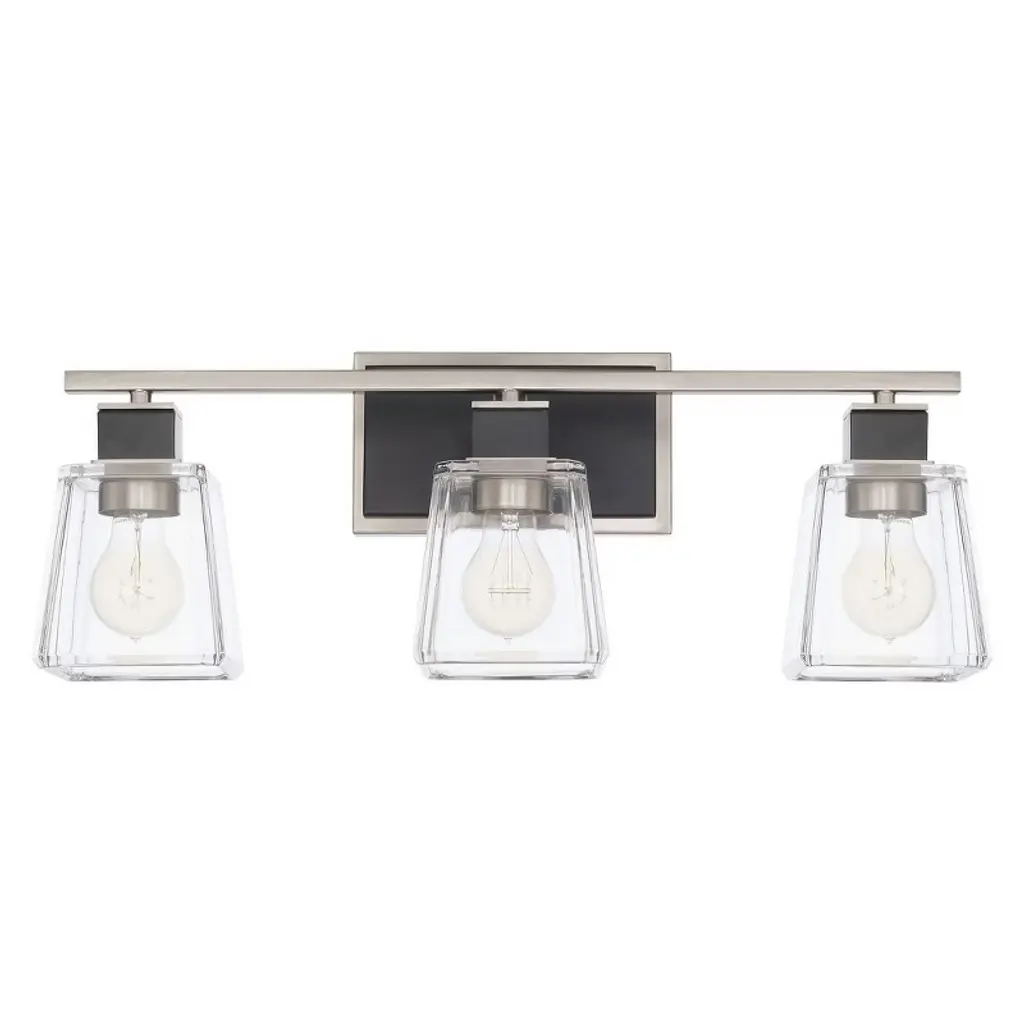 For a sleek and sophisticated bath update, choose the Tux vanity light. Its impeccable styling combines a Brushed Nickel finish with touches of black and clear, trapezoid glass shades that freshen and update an urban classic bath. Warranty: 1 Year Room Recommendation: Bathroom/Powder Room Mounting Direction: Up or Down Shade Included: Yes