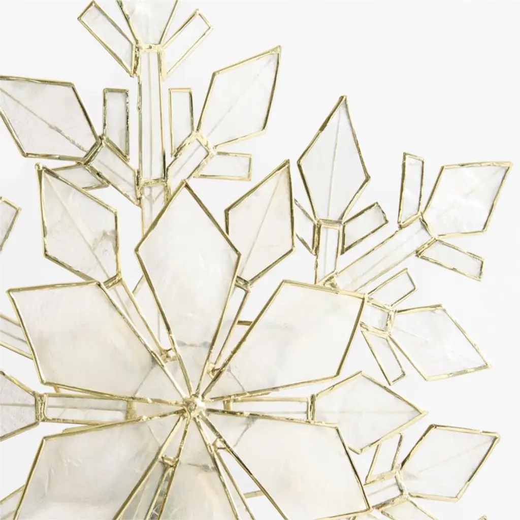 Our capiz snowflake tree topper brings a touch of the tropics to your winter decor. The windowpane oyster shells bring subtle luminosity to the Christmas tree, shimmering in the glow of string lights. Hand-constructed by skilled artisans, the dimensional snowflake solders together handcut pieces capiz with brass for a lustrous, elegant tree topper.