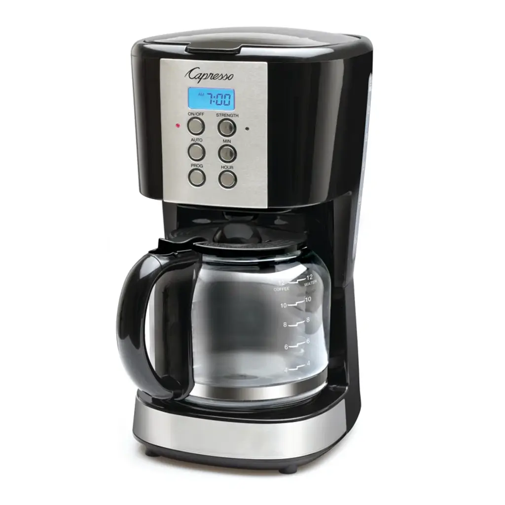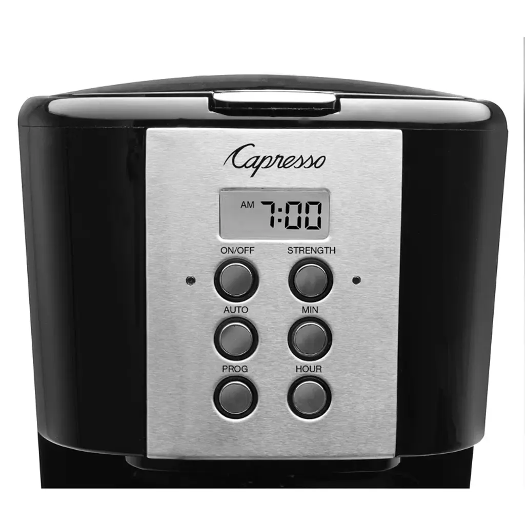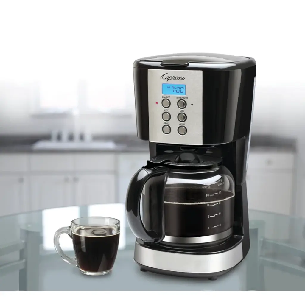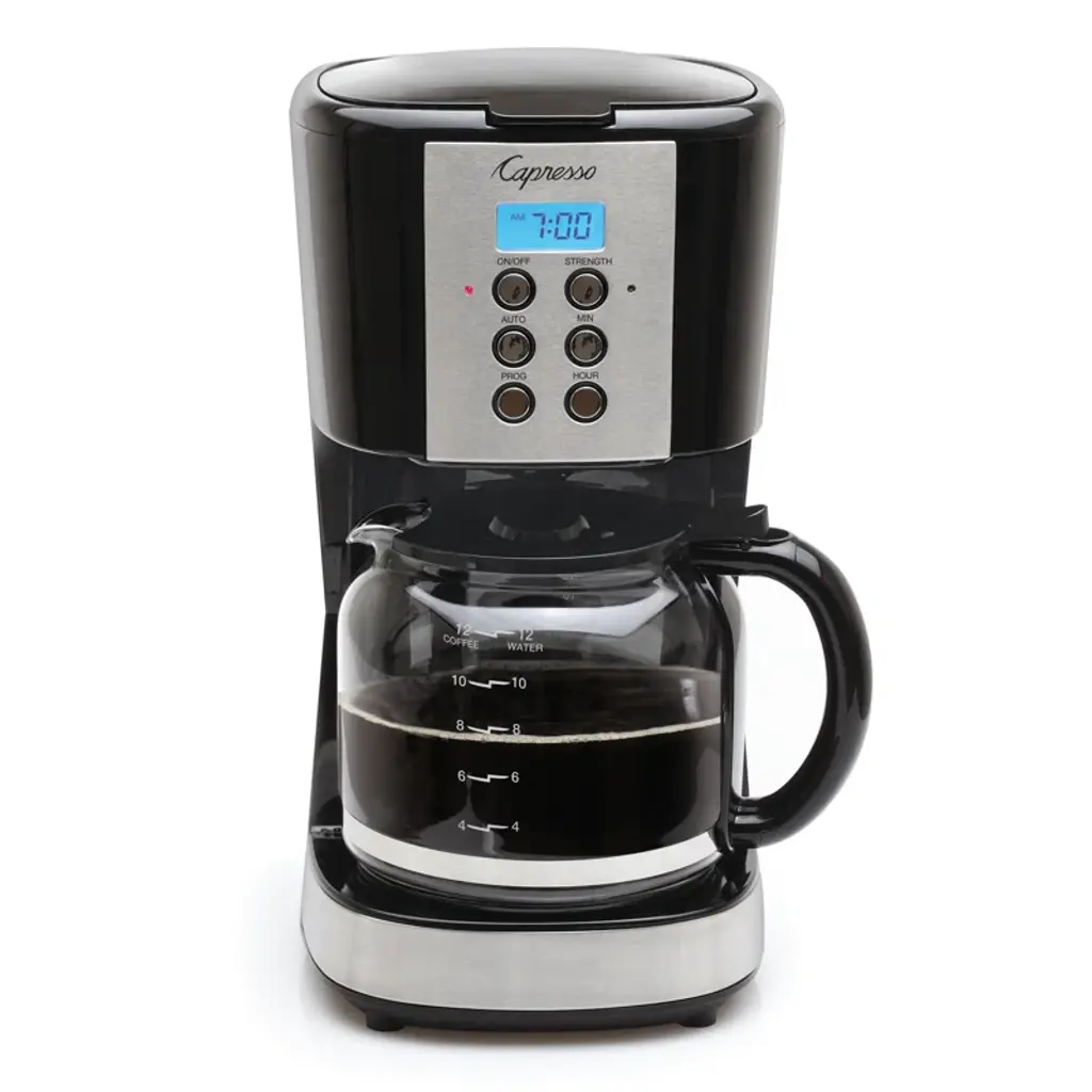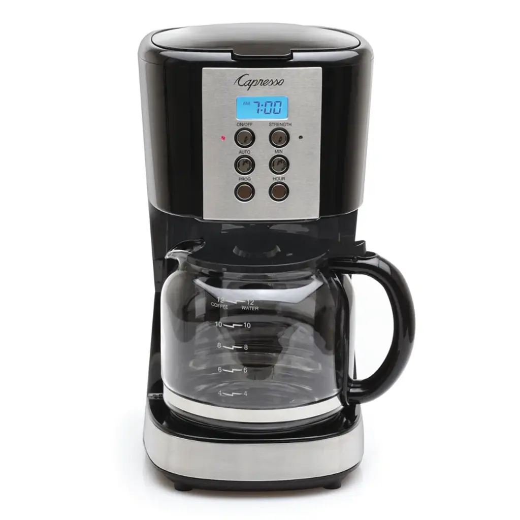Packed with features but priced for value, the Capresso 12-cup coffee maker is sure to be a popular addition to any kitchen. An easy-to-read external water level indicator and fully programmable digital display make brewing rich, hot coffee in a snap. The reusable goldtone filter and glass carafe with brew-through lid and drip-free pouring spout are dishwasher safe, making clean-up a breeze. The optional strength setting extends the brew time for added aroma.