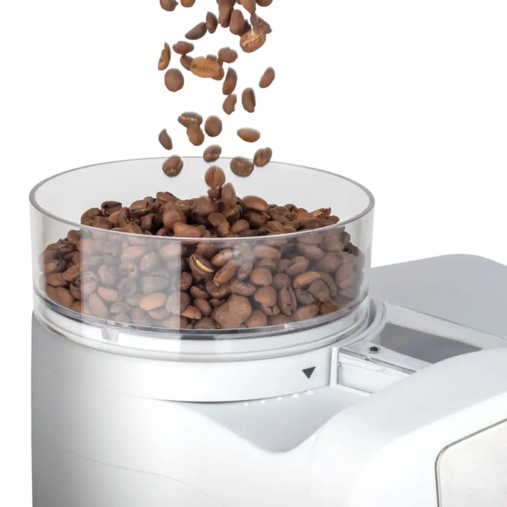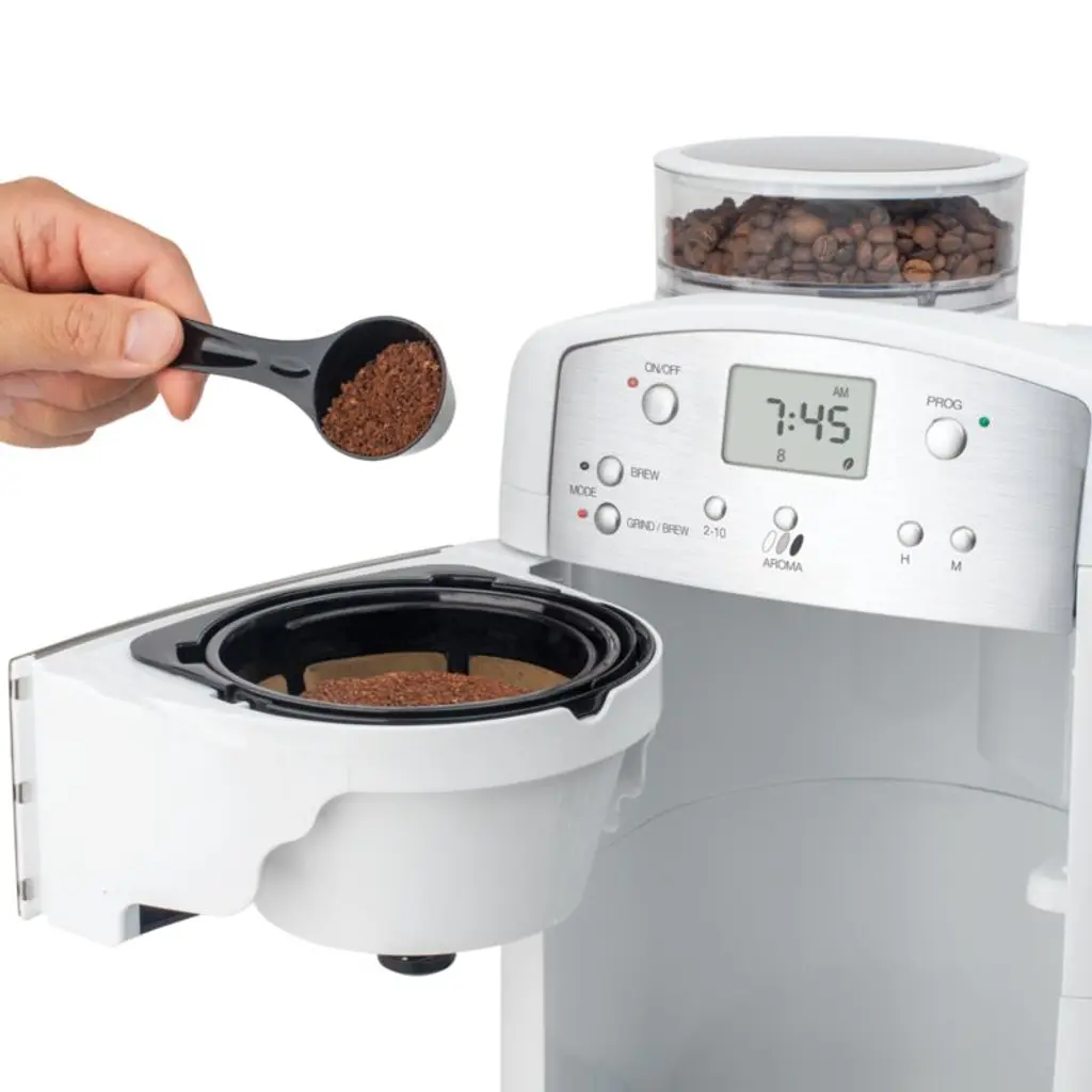 Brew up to 10 cups of coffee exactly to your liking with this grind-and-brew coffee maker. Select the ideal grinding fineness level for your beans, choose your desired brew strength and set your preferred number of cups. Or use the automatic function for ultra-simple operation. The conical burr grinder uses stainless steel burrs to grind beans evenly and slowly, preserving delicate aromas. Once brewed, the non-stick warming plate keeps your coffee hot in the glass ergonomic pot. This sleek white coffee center makes the most of counter space with its compact design and built-in, direct-feed grinder.