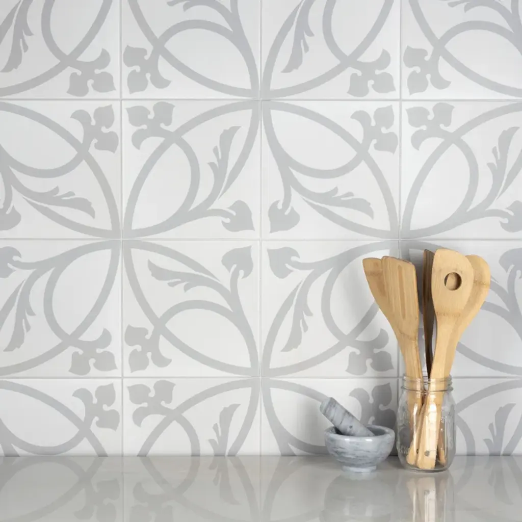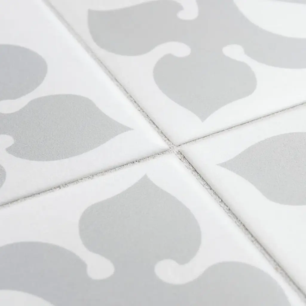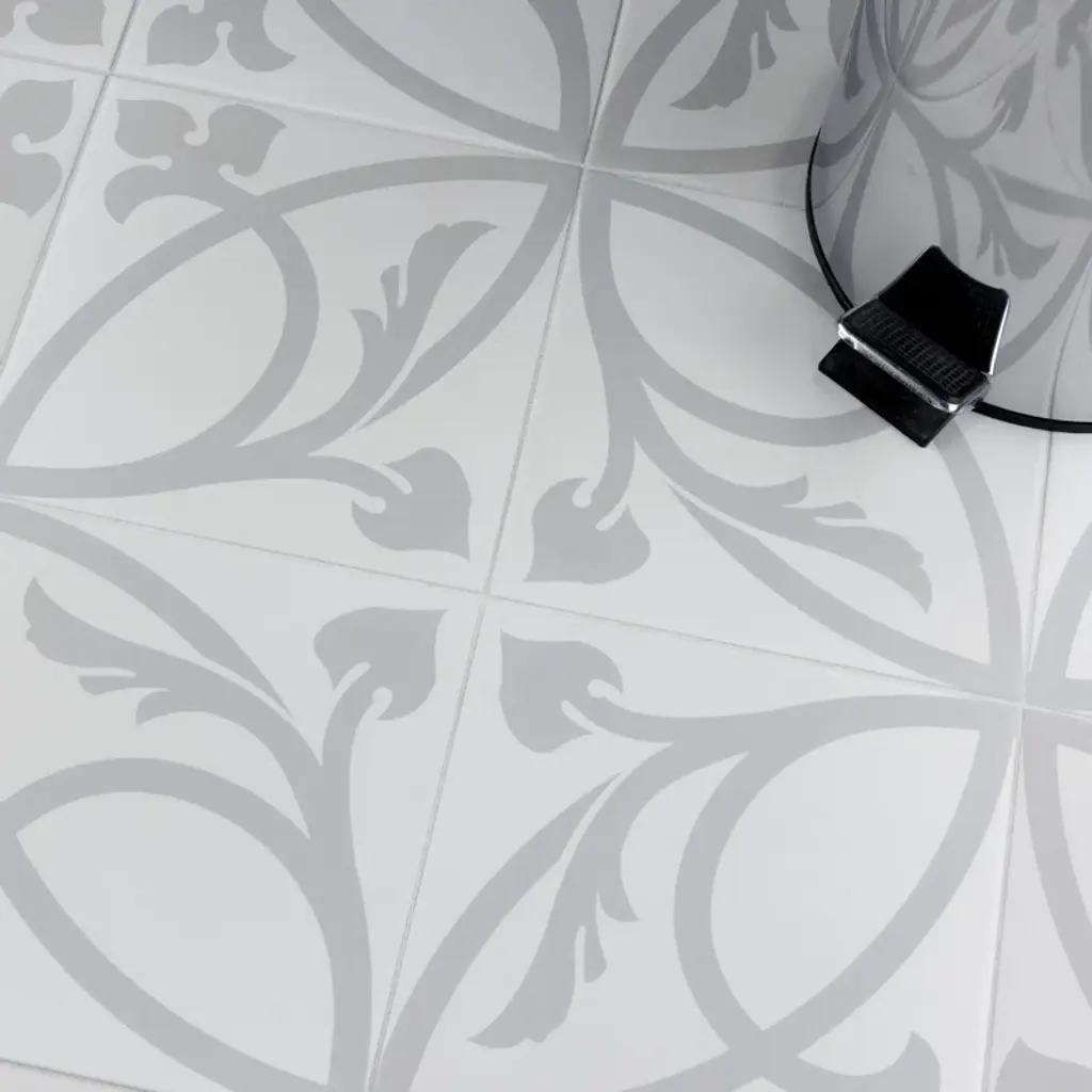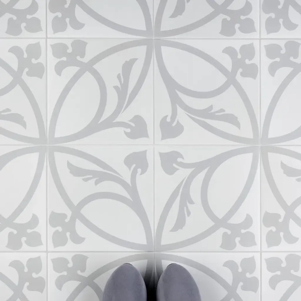 Blending classic style and modern durability, tile captures the look of authentic encaustic tiles in a versatile porcelain body. This tile features flowing lines and curved edges that when laid out, create floral designs with old-world flair. Set on a smooth matte base glaze, this floor, and wall tile has a snow-white color tone accented by light grey decorative patterns. To add further contrast and dimension to the design, this tile features speckled detailing in light grey tones. Radiating modern elegance, it can blend into virtually any design theme, ranging from contemporary projects to traditional installations. Its impervious and frost-resistant features make this an ideal choice for indoor and outdoor installations including, kitchens, bathrooms, entryways, and patios. Tile is the better choice for your space. This tile is made from natural ingredients, making it a healthy choice as it is free from allergens, VOCs, formaldehyde, and PVC.