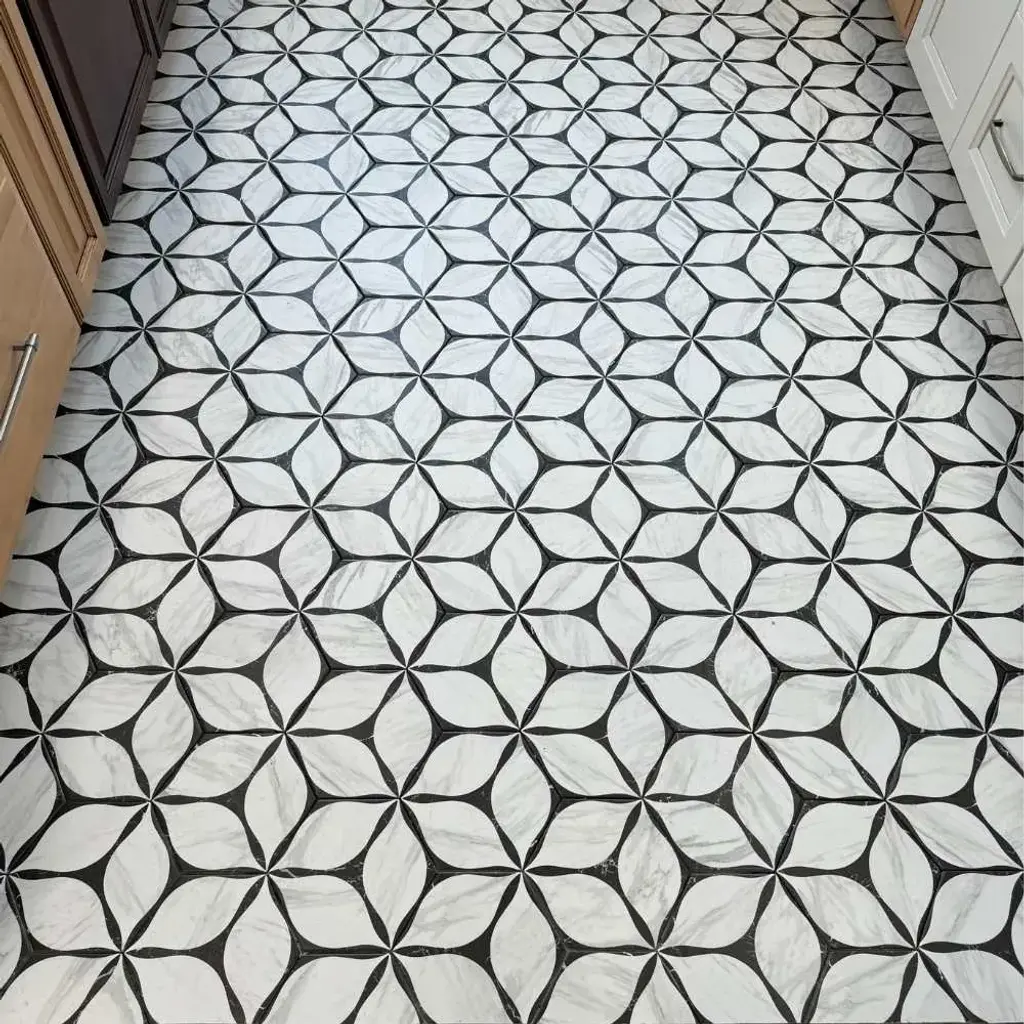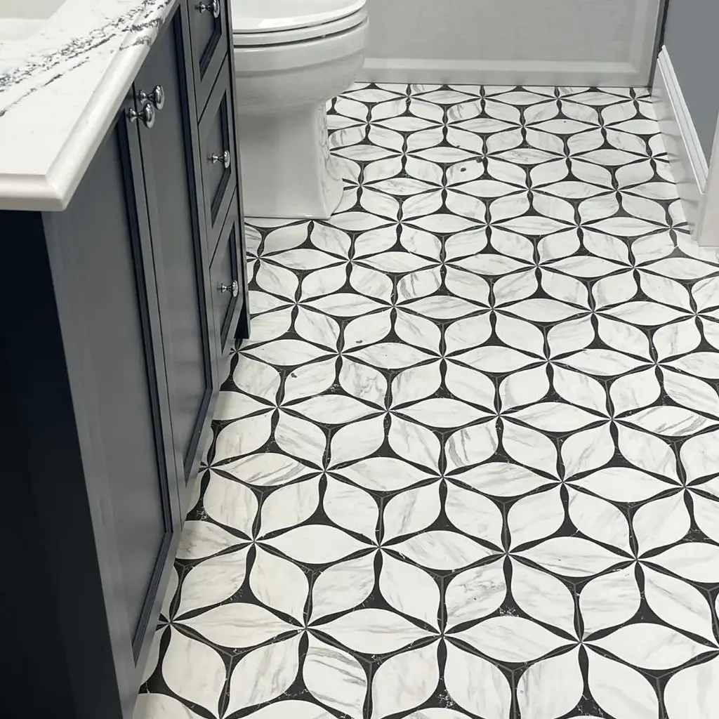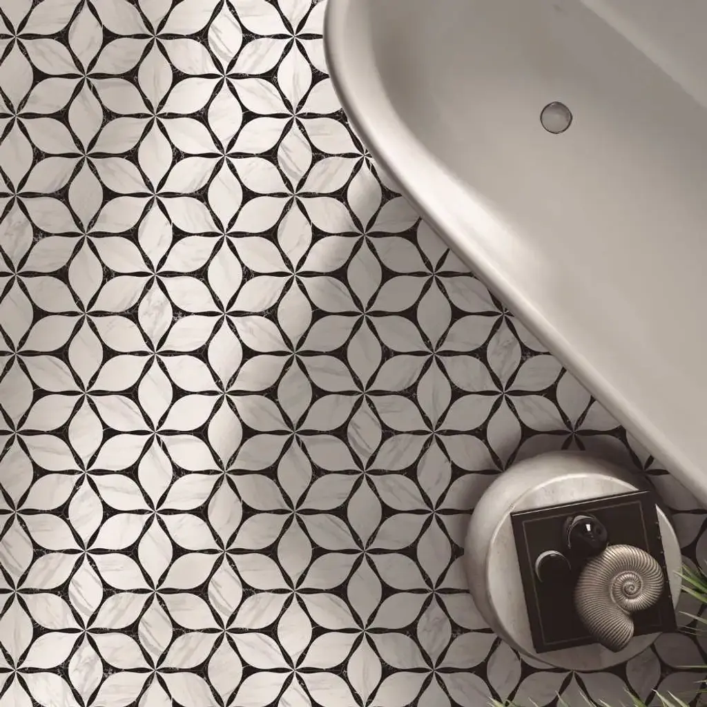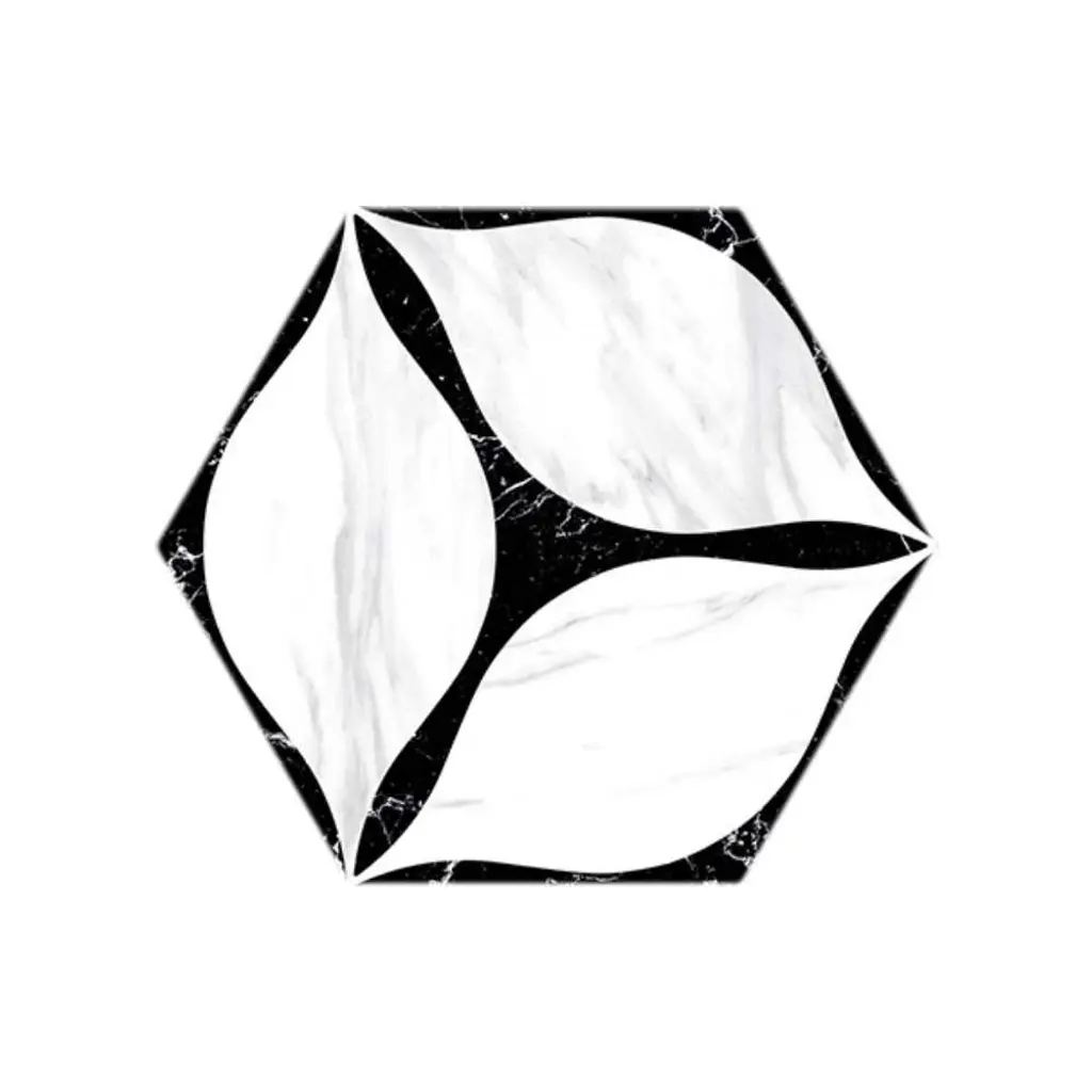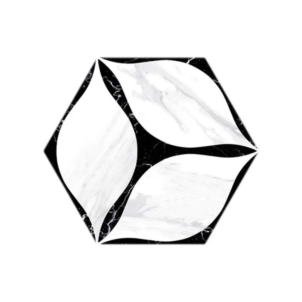 The Tile Life Capricho 8" x 9" Black Porcelain Floor and Wall Tile reinterprets the classic hexagon form with a curved outline and a unique linear pattern. When placed in a set, this tile presents a striking floral design, adding visual interest to any space. Capricho's stark contrast between its marbled background and bold black lines creates an artfully playful tile perfect for any midcentury modern home renovation.FEATURES