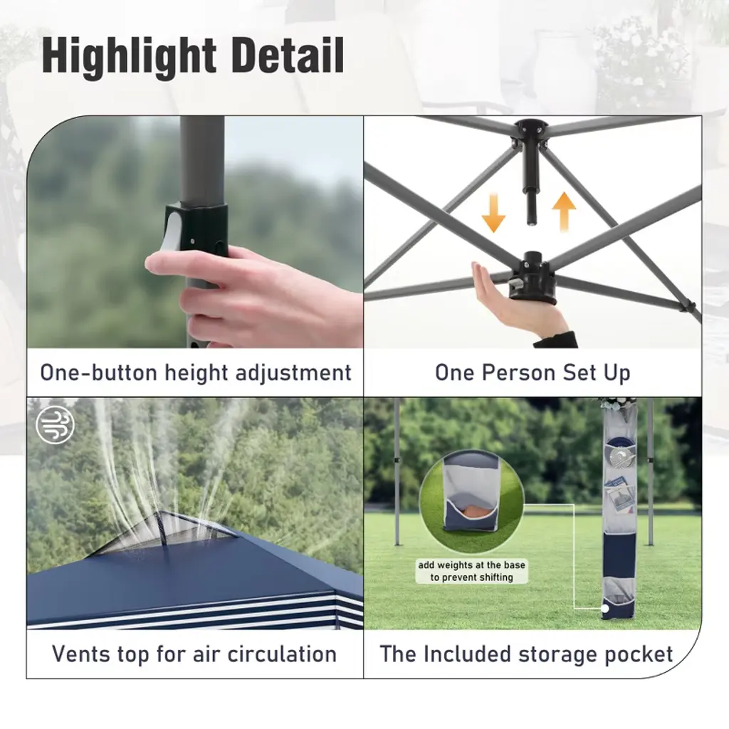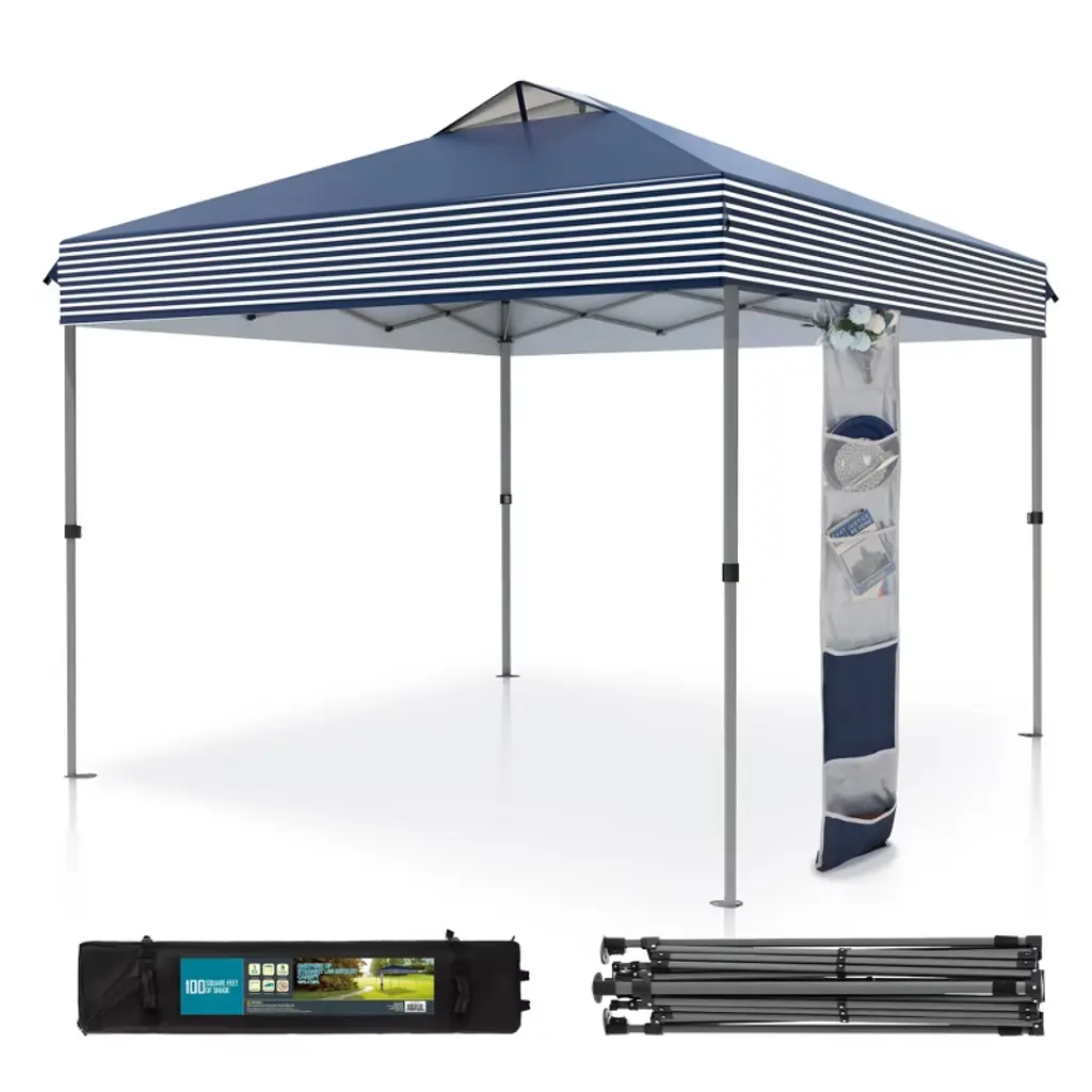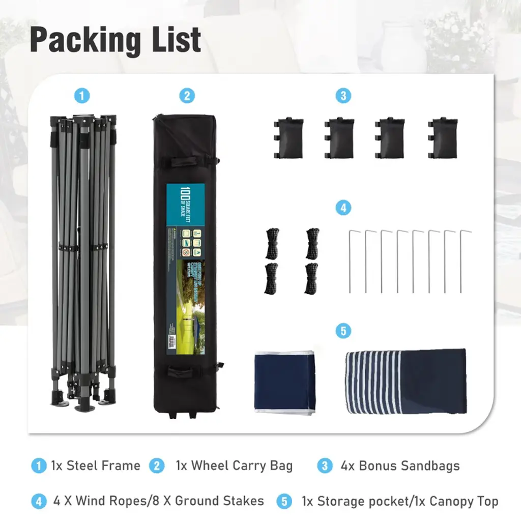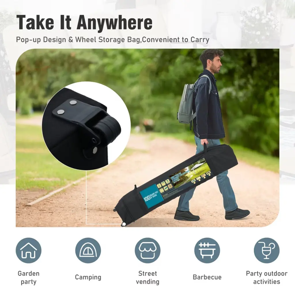[CAPTIVA DESIGNS]Experience effortless outdoor shelter with our innovative 10x10 pop-up canopy, designed for quick one-person setup using a patented central locking system—no tools needed! Offering 100 square feet of coverage with an interior height exceeding 9 feet, it comfortably accommodates up to 10 people, making it ideal for family gatherings, craft fairs, and beach outings. Crafted from premium CPAI-84 flame-resistant polyester and a corrosion-resistant steel frame, this canopy provides superior UV protection and durability. Complete with a vented top for airflow, adjustable legs, removable sidewalls, stakes, and a wheeled carrying bag, this product combines convenience with quality, backed by a reliable warranty. Dimensions: Canopy Size: 120 inches (L) x 120 inches (W) x 106 inches (H) Occupancy Capacity: Accommodates up to 10 individuals comfortably Packages Includes: Canopy Tent x 1 Storage Bag x 1 Assembly Required: No