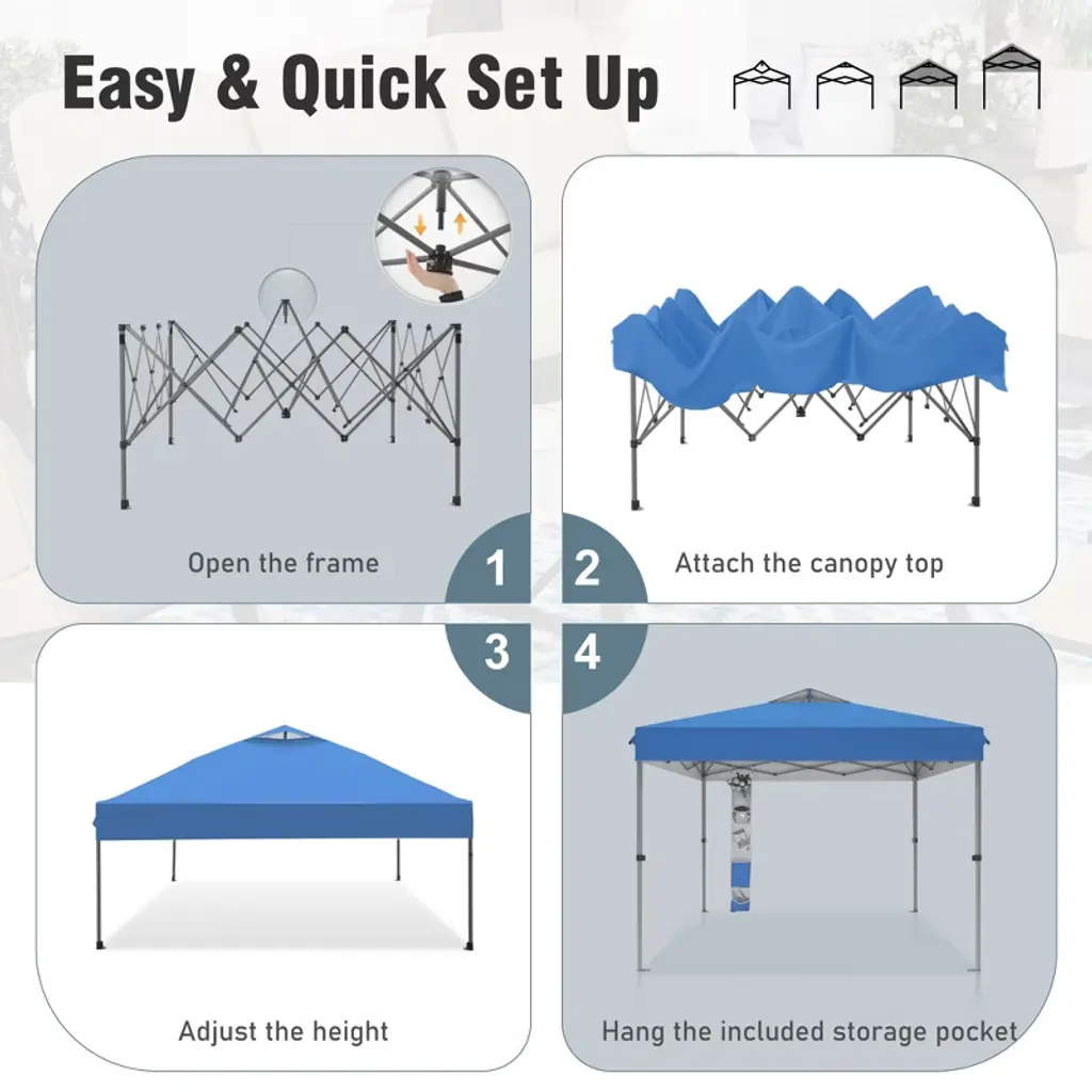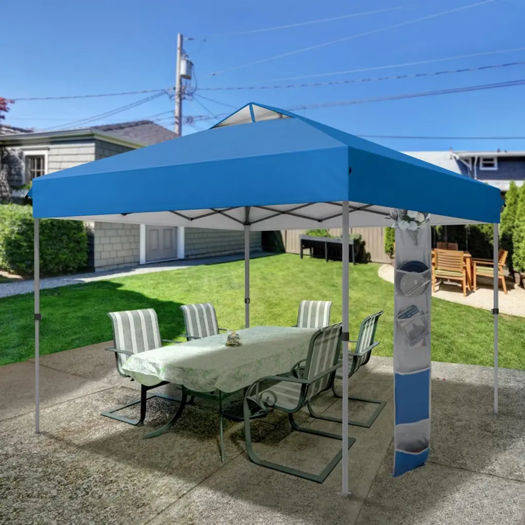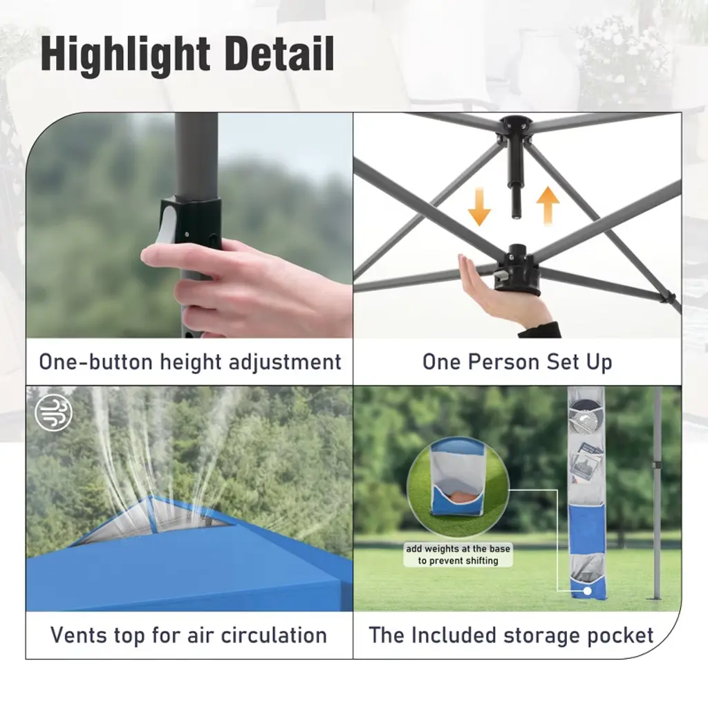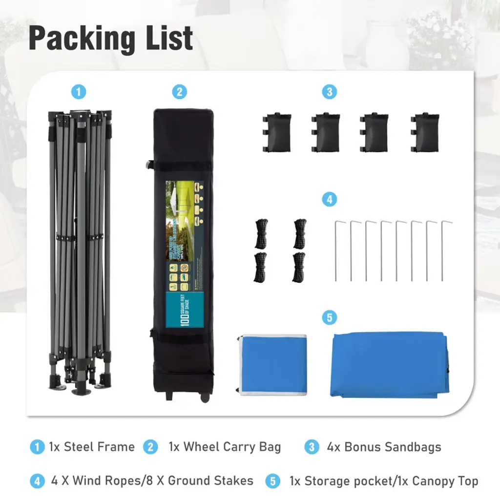 [CAPTIVA DESIGNS]Experience effortless outdoor shelter with our innovative 10x10 pop-up canopy, designed for quick one-person setup using a patented central locking system—no tools needed! Offering 100 square feet of coverage with an interior height exceeding 9 feet, it comfortably accommodates up to 10 people, making it ideal for family gatherings, craft fairs, and beach outings. Crafted from premium CPAI-84 flame-resistant polyester and a corrosion-resistant steel frame, this canopy provides superior UV protection and durability. Complete with a vented top for airflow, adjustable legs, removable sidewalls, stakes, and a wheeled carrying bag, this product combines convenience with quality, backed by a reliable warranty. Dimensions: Canopy Size: 120 inches (L) x 120 inches (W) x 106 inches (H) Occupancy Capacity: Accommodates up to 10 individuals comfortably Packages Includes: Canopy Tent x 1 Storage Bag x 1 Assembly Required: No