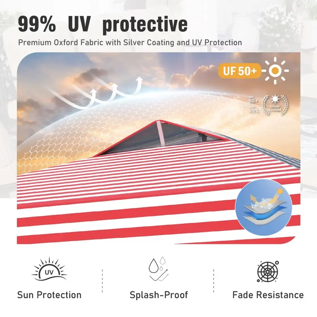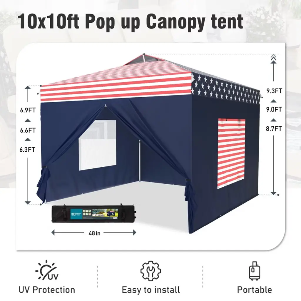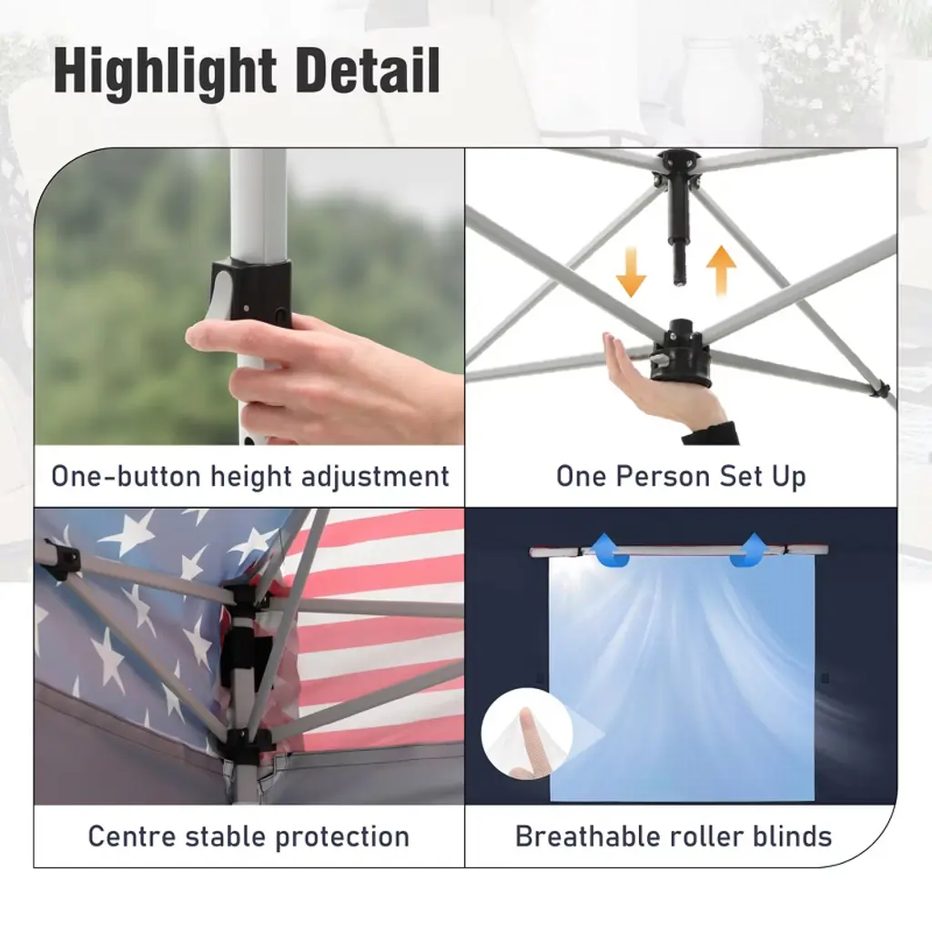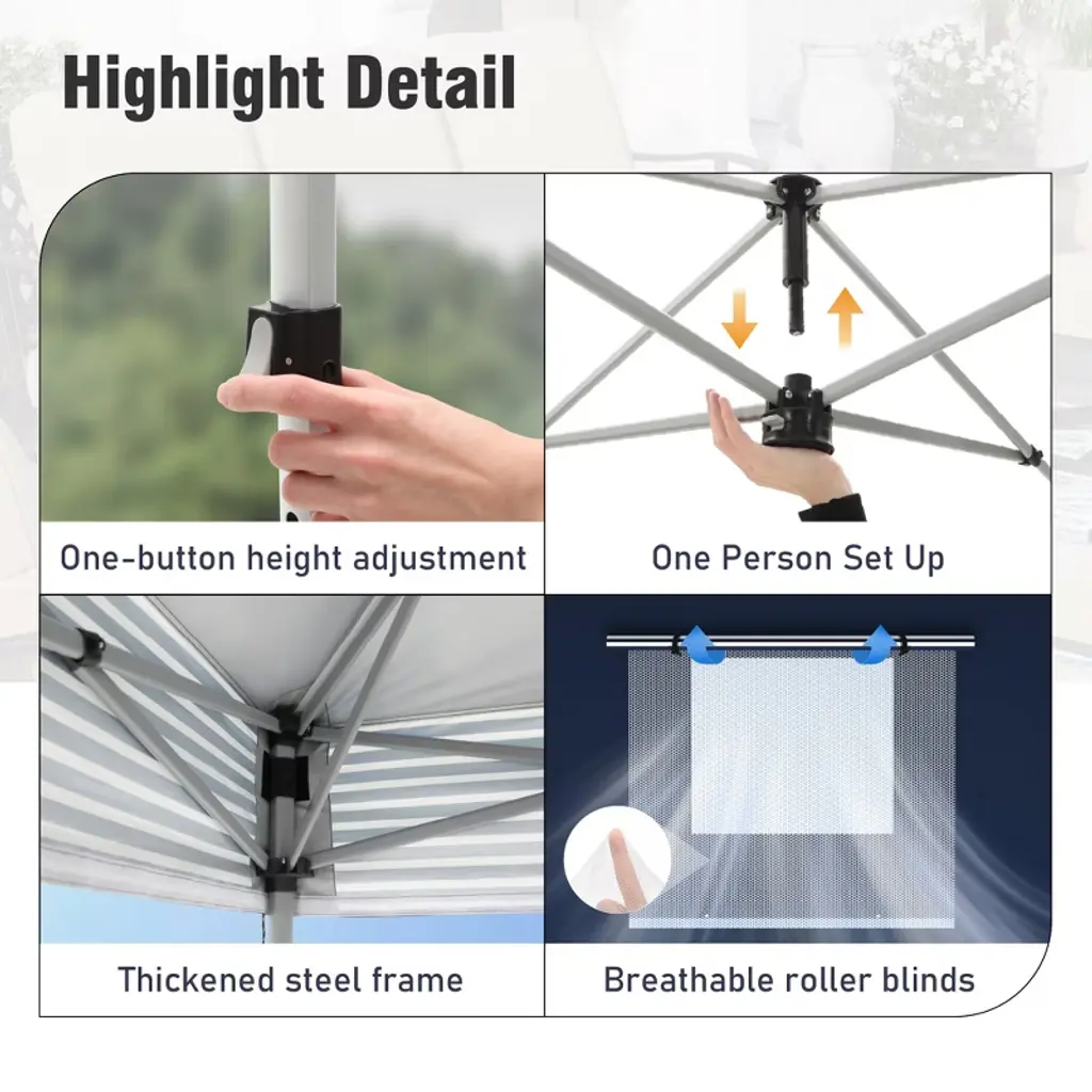 [Captiva Designs]The Captiva Designs 10’x10’ Pop-Up Canopy Tent is perfect for outdoor events, providing instant shade and protection. With an innovative one-person setup, durable construction, and customizable sidewall options, this versatile canopy is ideal for family gatherings, picnics, or beach days. Its compact design makes it easy to transport in the included wheeled carrying bag, ensuring you’re ready for any adventure. Enjoy the great outdoors with style and ease! Dimensions: Assembled Canopy (in.): 120" L x 120" W x 106" H Product Weight (lb.):39.6 lb Packages Includes: Canopy Tent x 1 Storage Bag x 1 Assembly Required: No