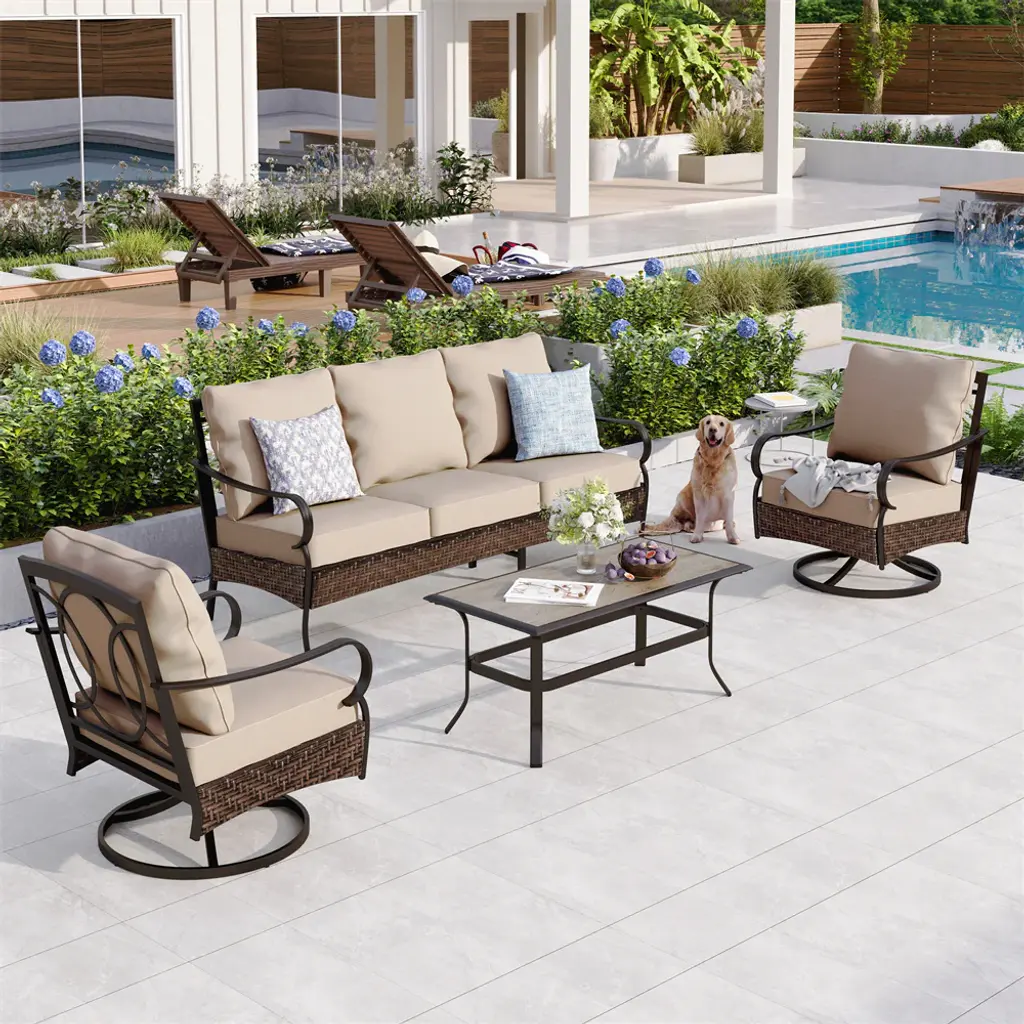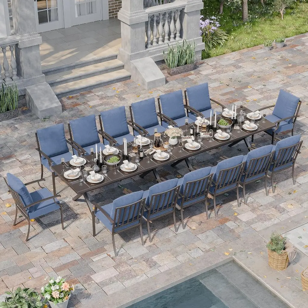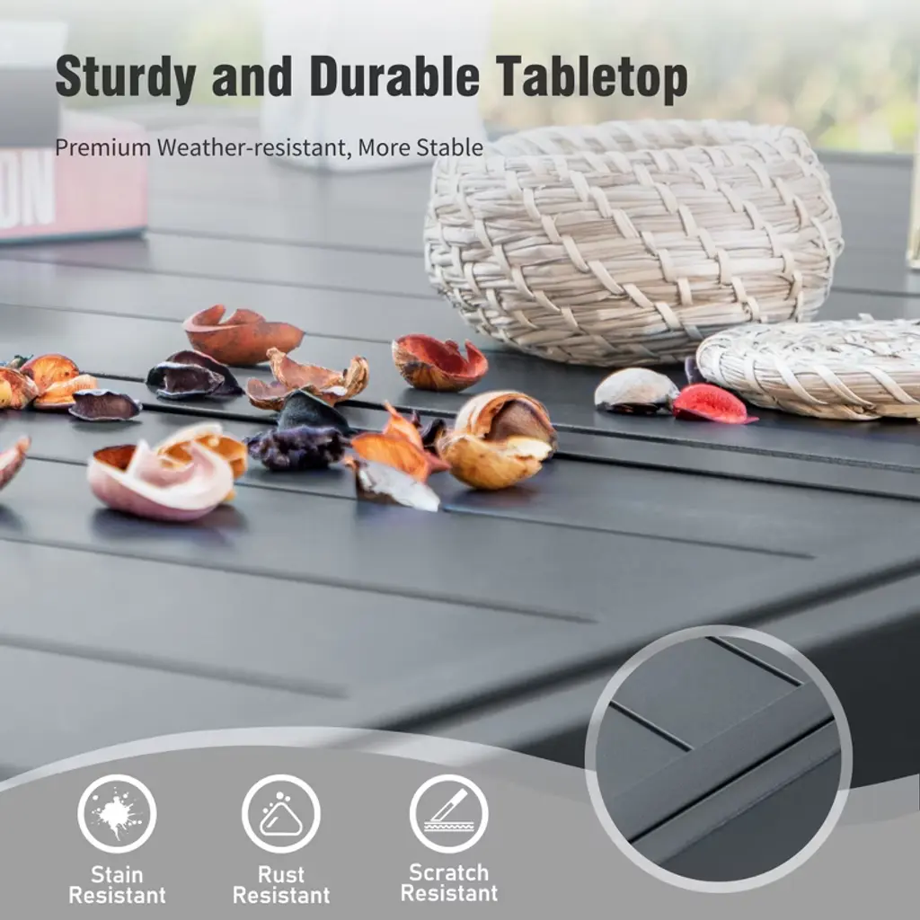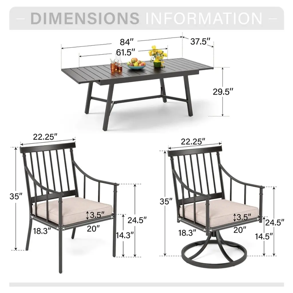 [CAPTIVA DESIGNS] Enhance your outdoor experience with our 9-piece dining set. With the ability to comfortably seat eight and expand from 61.5 inches to a generous 84.0 inches, the table is perfect for hosting larger groups. The elegant slat tabletop and double-coated finish not only elevate its aesthetic appeal but also invite you to create unforgettable moments with friends and family. The slightly angled table legs provide added stability and generous legroom.Paired with our Spacious Comfort Metal Chair, designed to accommodate all body types with an extra-wide 20.0" seat and a removable 3.5" thick cushion for added softness. The stylish slatted design not only enhances the modern aesthetic of your outdoor space but also ensures optimal support and ventilation. Crafted from E-coating and powder-coated steel frame, this durable set seamlessly blends style, function and durability, making it the perfect choice for your outdoor dining needs.FEATURESSlat Tabletop, Adjustable to 84.0 Inches for 8 GuestsElegant Angled Legs for Enhanced Stability and ComfortSpacious 20.0" Wide Seat Accommodates Up to 300 LbsSlatted Back and Sides & Removable 3.5" Thick CushionsDurable E-coating and powder-coated steel frame for DurabilitySPECIFICATIONTable Size:29.5"H x 37.5"W x 61.5"L, Extended Length: 84.0"Floor to apron height: 26.5", Tabletop Thickness: 3.0"Weight: 87.5 lbs, Rectangle (shape)Metal Chair Size: 35.0"H x 22.3"W x 22.7"DSeat Dimensions: 20.0"W, 18.3"D, 22.0" (seat back height)Floor to Seat Top: 14.5", Cushion Thickness: 3.5"Floor to Armrest: 24.5", Weight: 20.9 lbsPACKAGE INCLUDES1 x dining table (1 box)8 x metal chairs (4 boxes)Instruction Manuals (come with each box)(Decorations on the table are not included)Tips: Allow all the holes in the section to line up correctly and then tighten the screws. Assembly: 30 minutes to set up the table and 100 minutes to put the chairs together.
