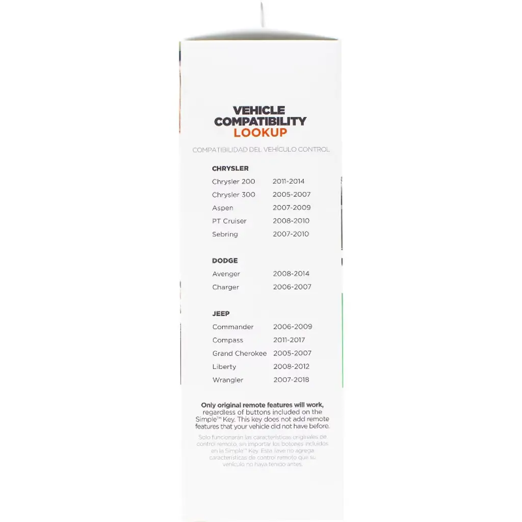 Simple Key is a new way for consumers to easily replace modern car keys. The consumer-friendly kit includes a Keyless Entry Remote Key and EZ Installer. The key blade can be cut at most hardware stores, car dealers, or automotive locksmiths. Then, the EZ Installer is used to pair the key to the vehicle in just a few minutes. Works just like your OEM key. Avoid the hassle and expense of having to go to the dealership for pairing. The EZ Installer is a single vehicle use pairing tool. Once you use it on your vehicle, it cannot be used on another.Compatible Vehicles:Chrysler 200 (2011-2014)Chrysler 300 (2005-2007)Chrysler Aspen (2007-2009)Chrysler PT Cruiser (2008-2010)Chrysler Sebring (2007-2010)Chrysler Sebring Convertible (2007-2010)Dodge Avenger (2008-2014)Dodge Charger (2006-2007)Dodge Durango (2004-2009)Jeep Commander (2006-2009)Jeep Compass (2011-2017)Jeep Grand Cherokee (2005-2007)Jeep Liberty (2008-2012)Jeep Patriot (2012-2016)Jeep Wrangler (2010-2014)