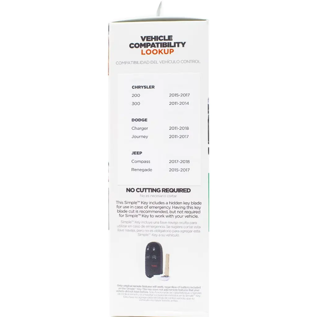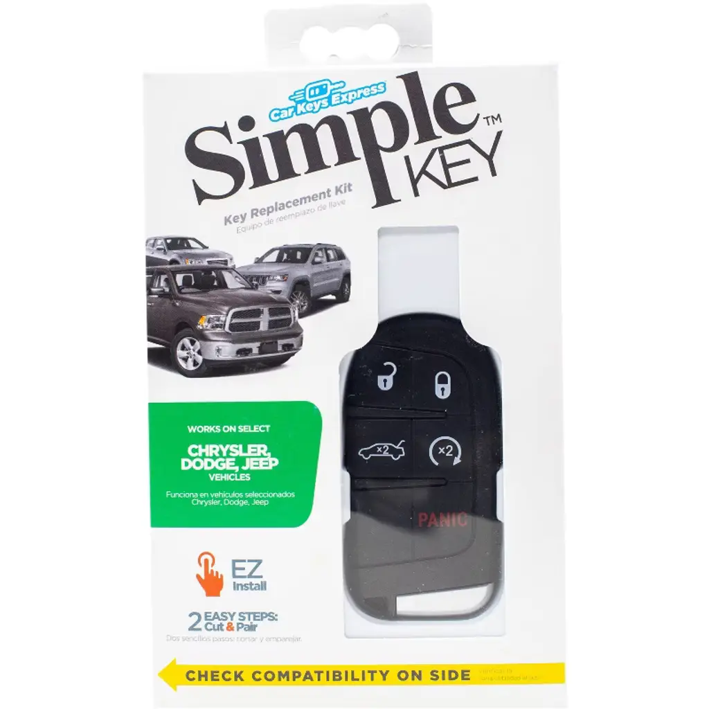 Simple Key is a new way for consumers to easily replace modern car keys. The consumer-friendly kit includes a Smart Key, emergency key insert, and EZ Installer. The emergency key blade is not required, but can be cut at most hardware stores, car dealers, or automotive locksmiths. The EZ Installer DIY pairing dongle allows you to pair your key entirely on your own. Avoid the hassle and expense of having to go to the dealership for pairing. The EZ Installer is a single vehicle use pairing tool. Once you use it on your vehicle, it cannot be used on another.Compatible Vehicles:Chrysler 200 (2015-2017)Chrysler 300 (2011-2014)Dodge Charger (2011-2017)Dodge Journey (2011-2017)Jeep Cherokee (2014-2018)Ram 1500 (2013-2017)Ram 2500 (2013-2017)Ram 3500 (2013-2017)